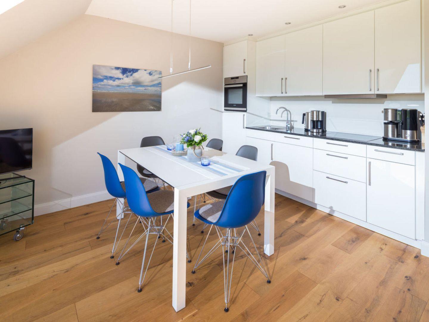 Die moderne Einbauküche ist voll ausgestattet mit Backofen, Geschirrspüler und einer Nespresso-Kaffeemaschine, sodass Sie sich auch im Urlaub wie zu Hause fühlen können. Der angrenzende Wohnbereich lädt mit gemütlicher Einrichtung zum Verweilen ein.
