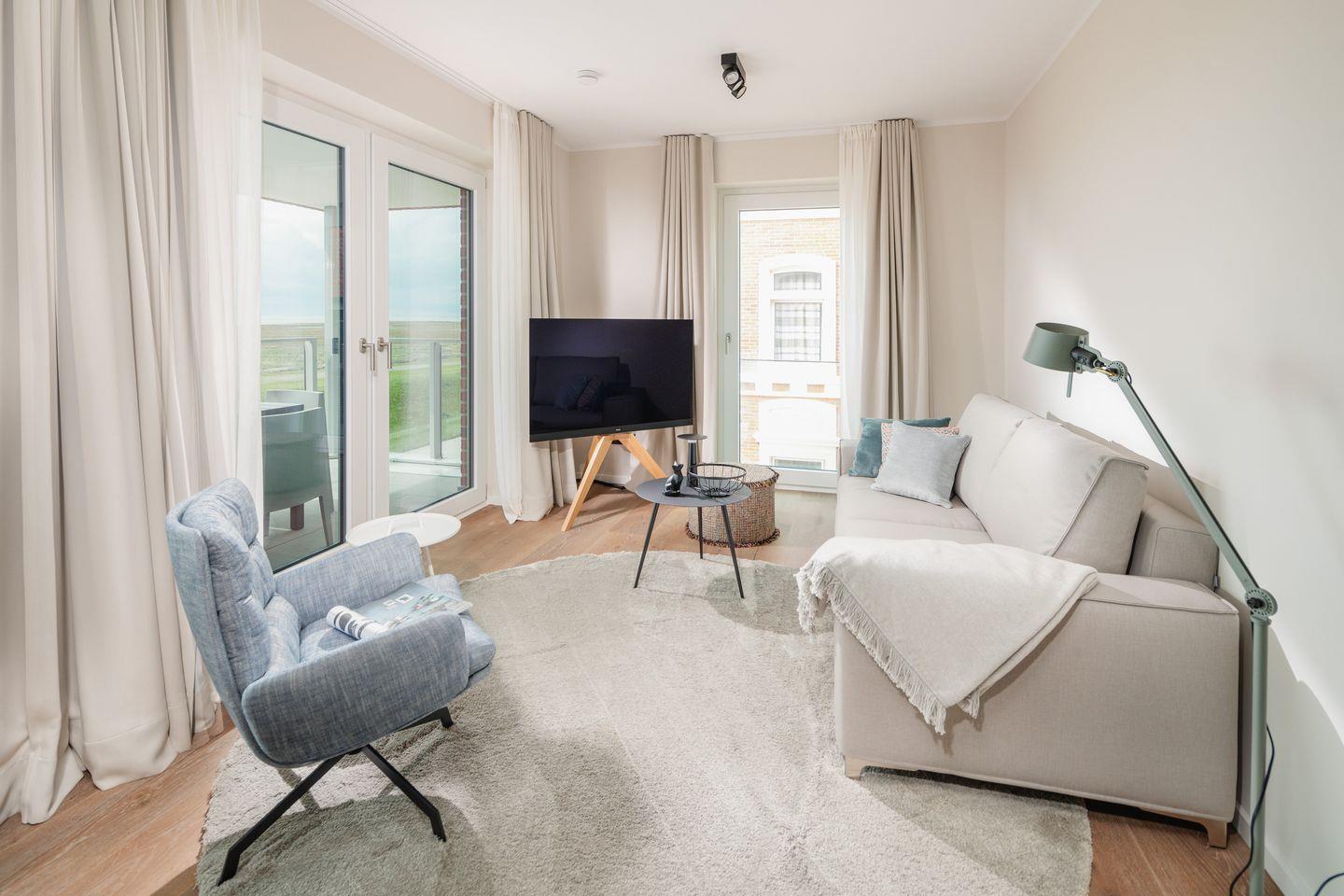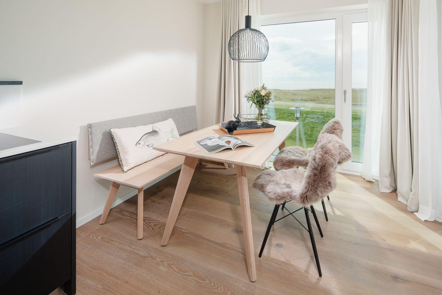Diese Ferienwohnung mit einer Größe von 78 qm ermöglicht Ihnen ein Panorama über den Deich auf das Meer. Der Blick über die Salzwiesen mit dem Wattenmeer im Hintergrund ist malerisch. Die moderne, stilvolle Ausstattung ist mit viel Liebe zum Detail geplant worden. Helle und hohe Räume lassen viel Licht in die Wohnung fließen. Ein massiver Eichenholz-Dielenboden sorgt mit der Möblierung für Gemütlichkeit und Behaglichkeit. Die Blicke, das Design, die Funktionalität und die bevorzugte Lage machen diese Wohnung einzigartig. Sie verfügt über einen Südbalkon, der über das Wohnzimmer betreten werden kann. Die Wohnung bietet Ihnen zwei Schlafzimmer, ein Duschbad und einen offenen Koch-Wohnbereich. Sie werden sich dort wohlfühlen und exzellent erholen können.