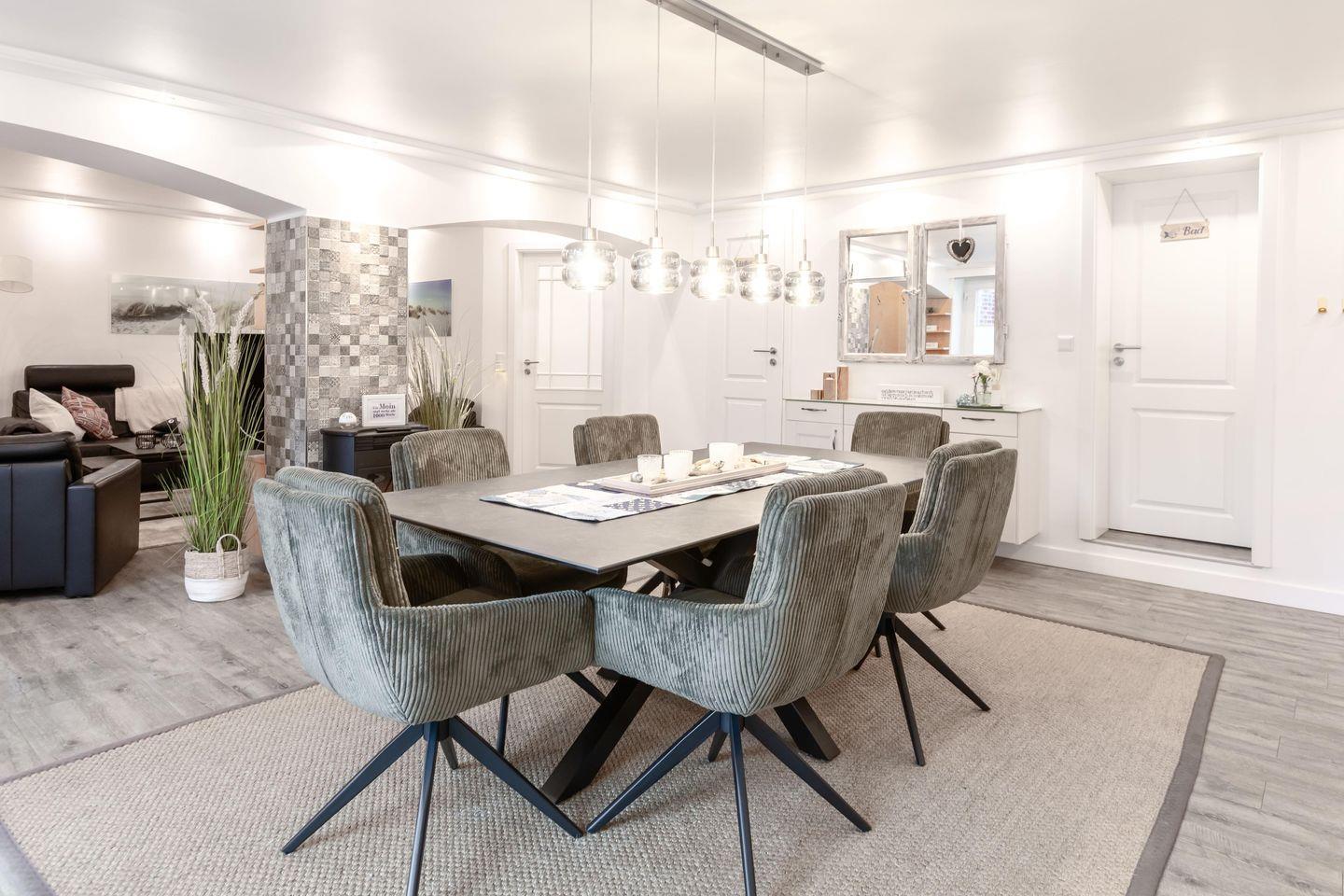 Beim Eintreten beeindruckt sofort der großzügige, ca. 48 m² große Wohn- und Essbereich mit seinem besonderen Flair und Blick in den Garten durch eine fast bodengleiche Fensterfront. Kinder haben hier viel Platz zum Spielen. Die mit Mikrowelle, Dolce Gusto Kaffeeautomat, Filterkaffeemaschine, Toaster, Wasserkocher, Backofen, Induktionskochfeld und Kühl-/Gefrierschrank komplett ausgestattete Küche und der riesige Esstisch laden dazu ein, sich selbst zu beköstigen. Abends oder bei schlechtem Wetter kann man sich hier mit Gesellschaftsspielen bequem ausbreiten. Der elektrische Kaminofen in der Mitte des Wohn-/Essbereichs lässt Romantikerherzen höher schlagen.