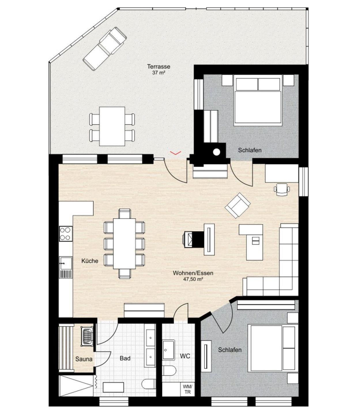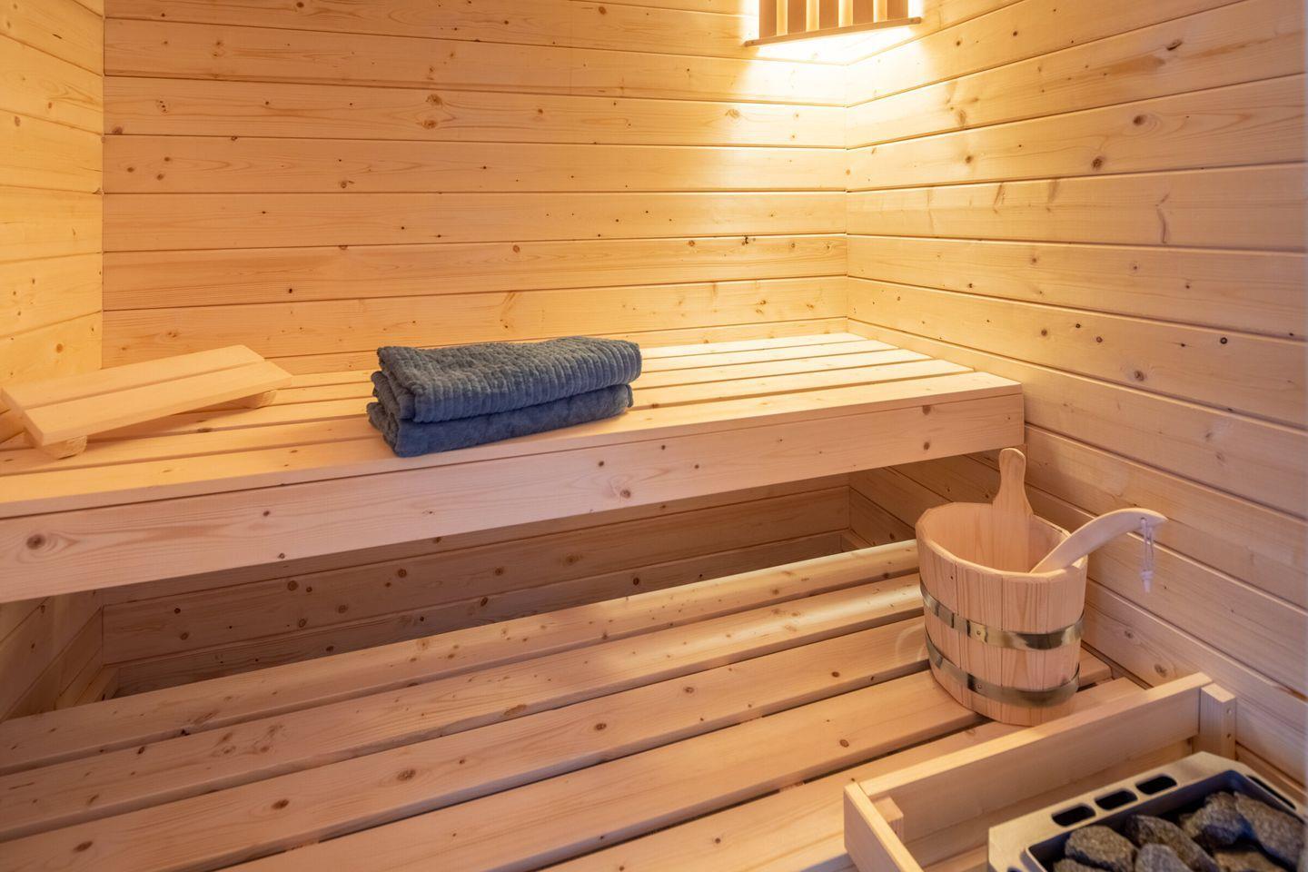 Ein großer Fernseher, das gemütliche Ledersofa, zwei getrennte Schlafzimmer (beide mit Doppelbetten, eines mit zusätzlichem Fernseher) sorgen für Entspannung. Im großen Badezimmer mit Doppelwaschbecken und Dusche befindet sich auch die gemütliche Drei-Personen-Sauna. Saunatücher sind vorhanden!