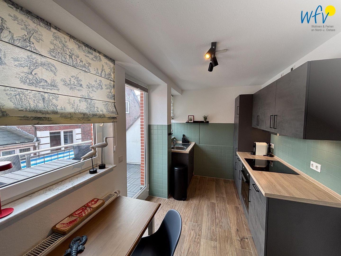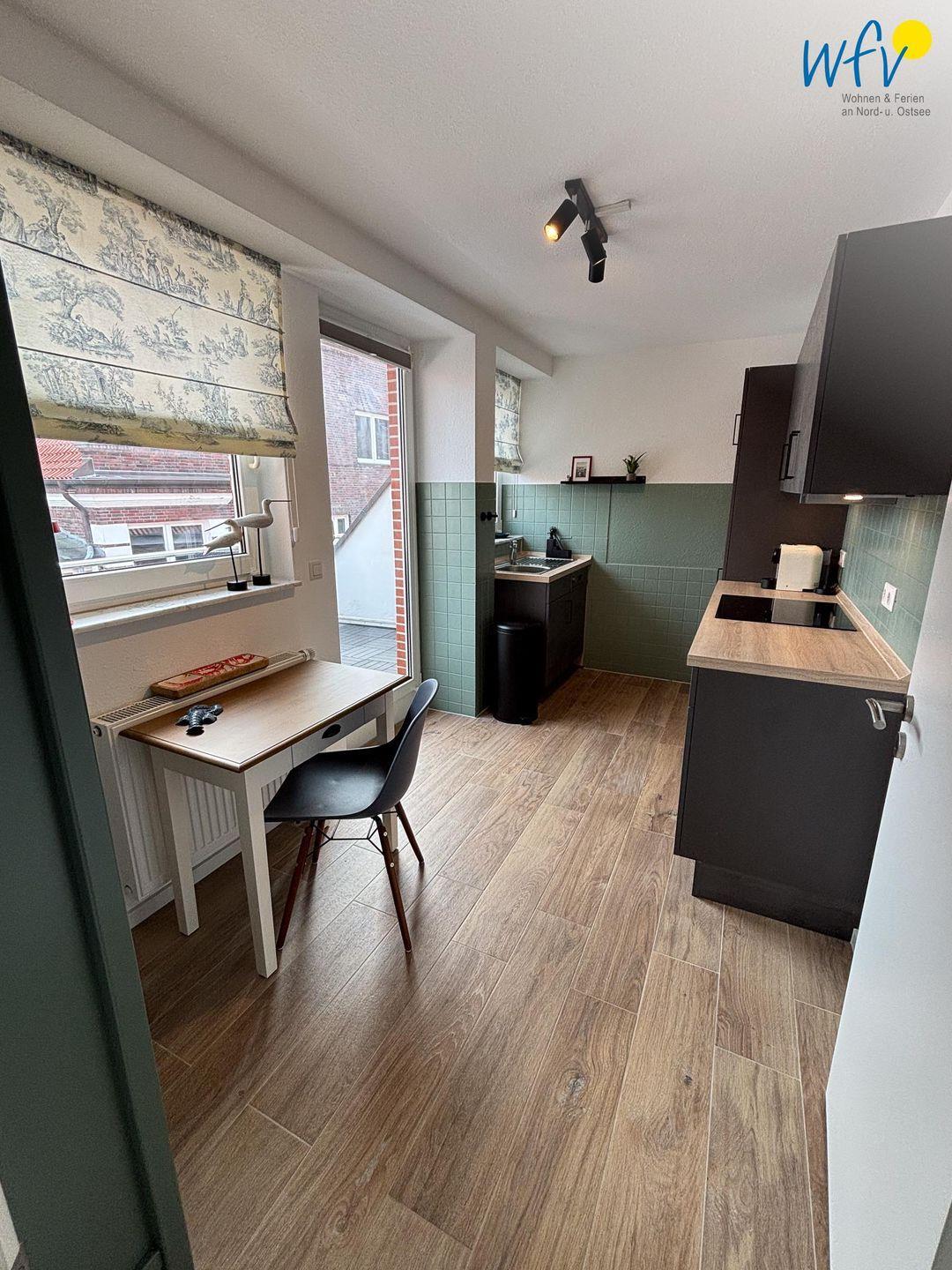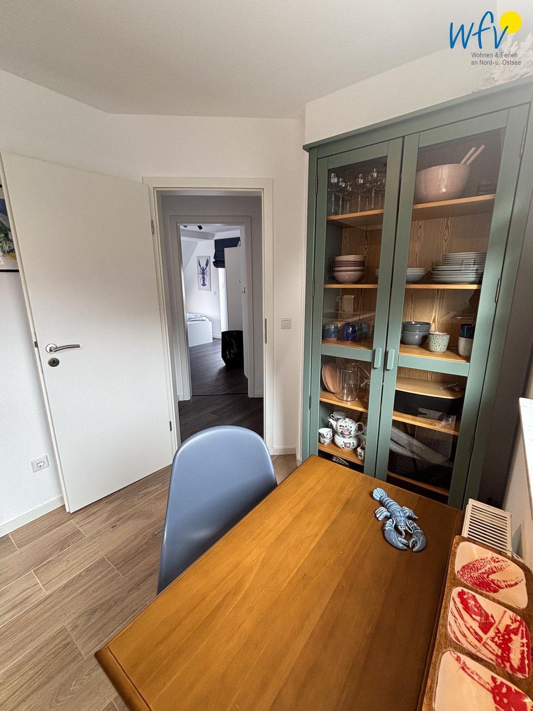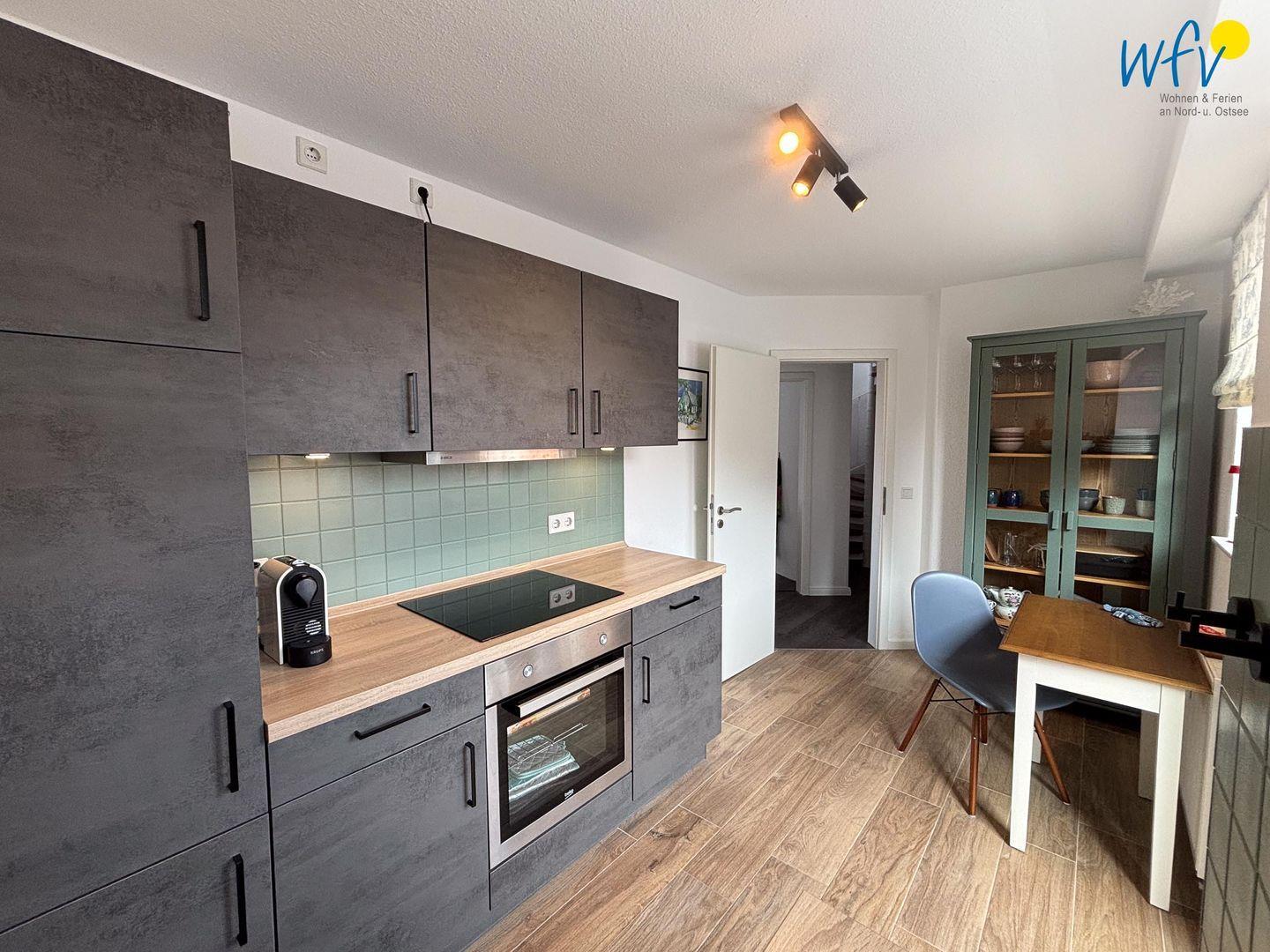 Das Herzstück der "Ferienwohnung Hummerhütte" bildet der gemütliche Wohnbereich mit Sitzecke, TV und Essbereich. Hier können Sie gemeinsame Abende verbringen, fernsehen oder lesen. Ein Esstisch lädt zu geselligen Mahlzeiten ein. Diese lassen sich schnell und einfach in der gut ausgestatteten modernen Küche zubereiten, die u.a. über einen Induktionsherd, einen Backofen, einen Kühlschrank mit Gefrierfach und eine Spülmaschine sowie über diverse Kleingeräte verfügt. Als Kaffeegourmet können Sie zwischen einer klassischen Kaffeemaschine und einer Nespressomaschine wählen. Ein kleiner Tisch für max. 2 Personen bietet Platz als Arbeitsfläche beim gemeinsamen Kochen oder für den gemütlichen ersten Kaffee mit Blick in die Umgebung.