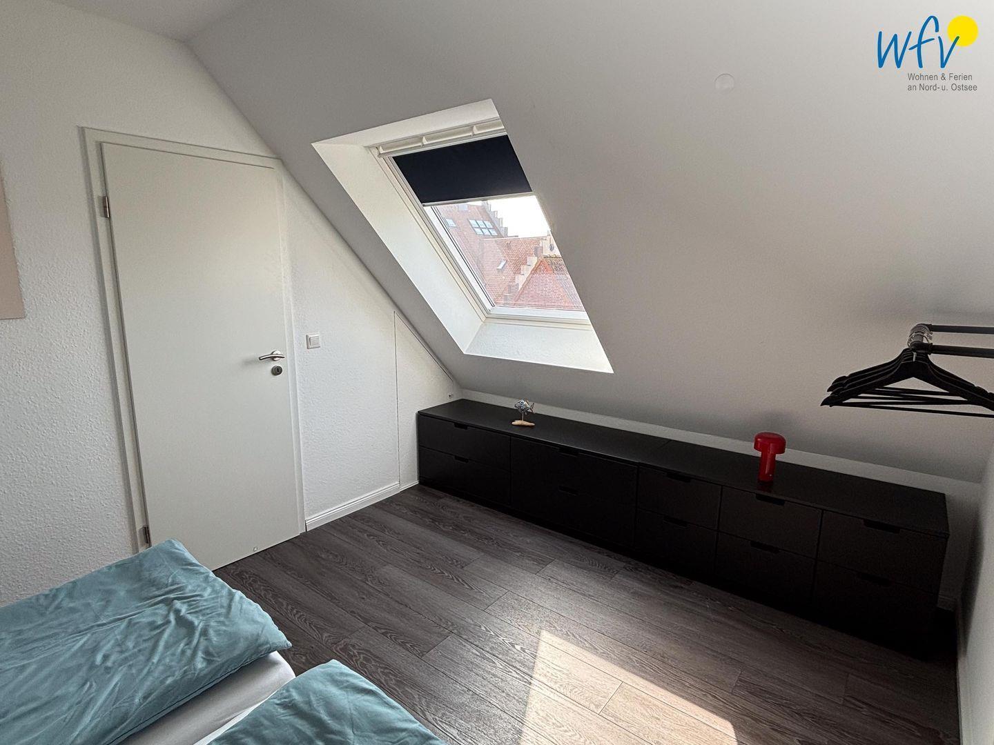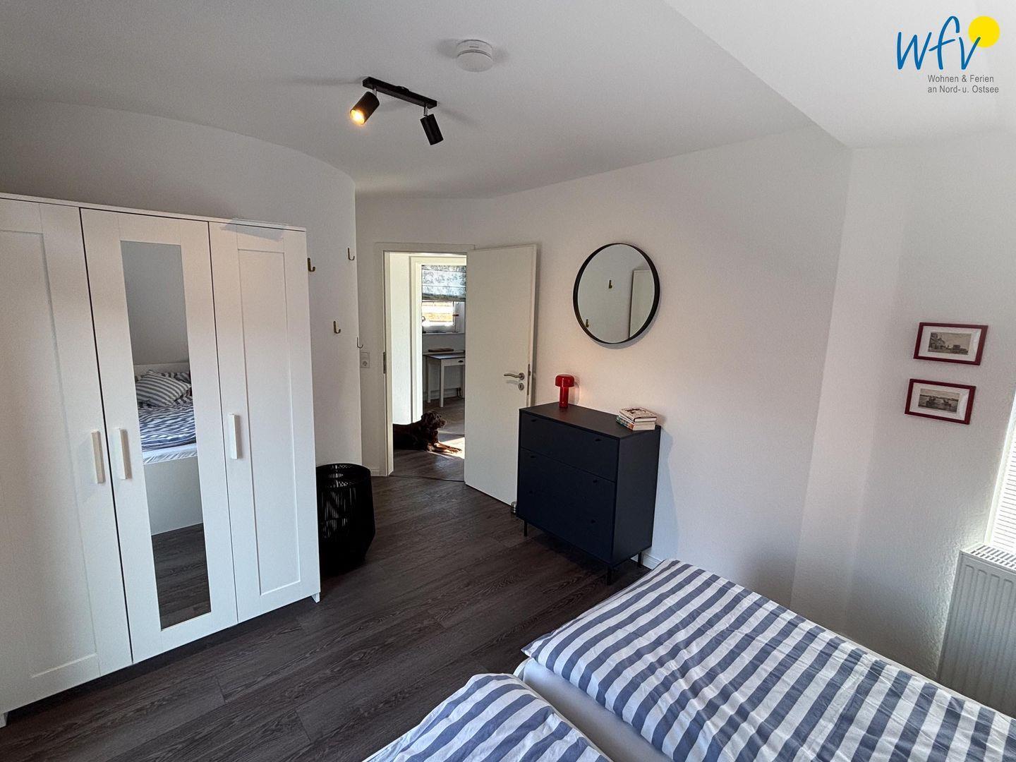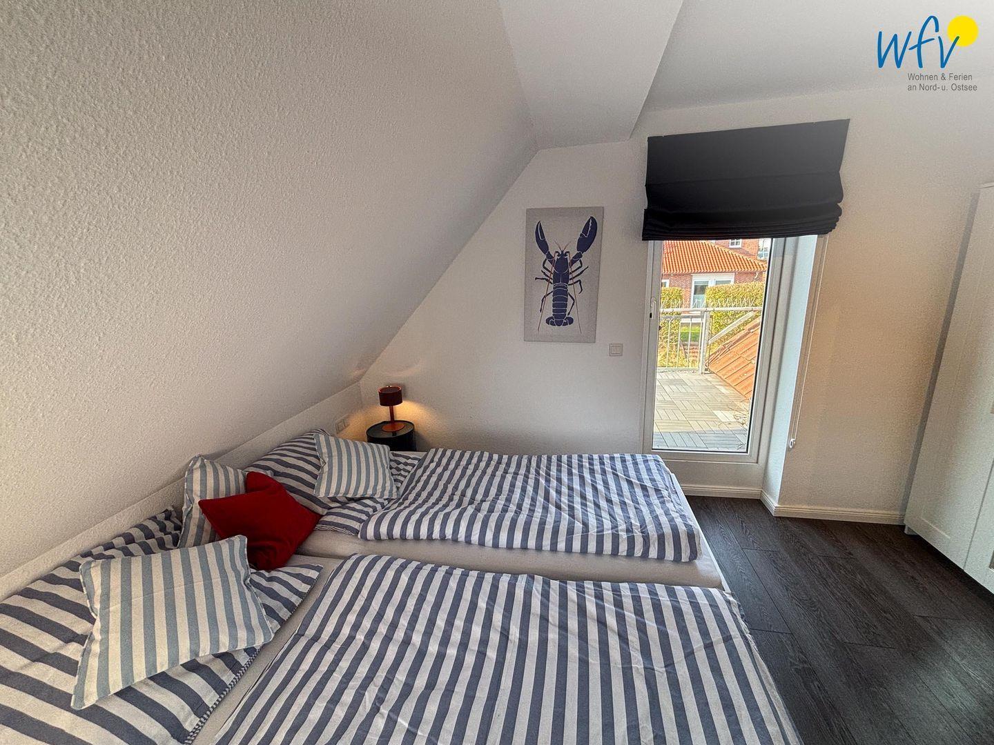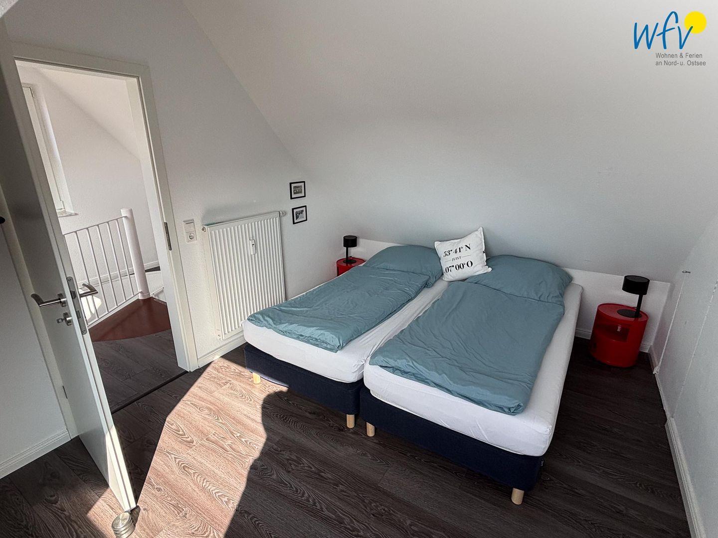 Die zwei separaten Schlafzimmer (OG + DG) sind jeweils mit einem Doppelbett ausgestattet und schaffen eine ruhige und entspannende Atmosphäre. Die Betten in beiden Schlafzimmern sind auch einzeln zu benutzen (auseinanderschiebbar; Matratzen je 100 x 200 cm). Ihre Urlaubsgarderobe können Sie im Kleiderschrank bzw. im oberen Schlafzimmer in Kommoden und auf einer Kleiderstange unterbringen. Laminatböden sorgen für eine freundliche und moderne Raumatmosphäre. Das Schlafzimmer im DG verfügt über ein Bad en Suite mit Badewanne und Handtuchheizung - perfekt für ein Wohlfühlbad nach dem Strandspaziergang!