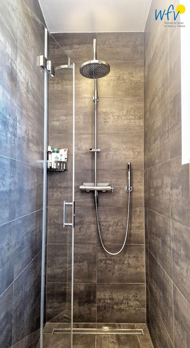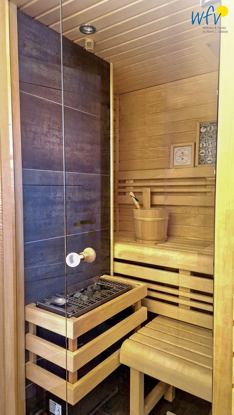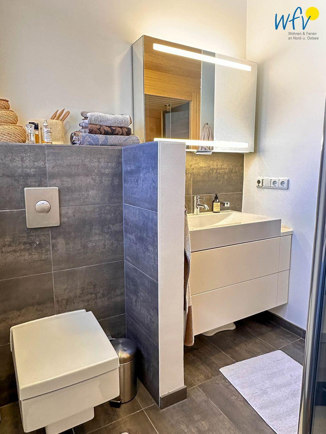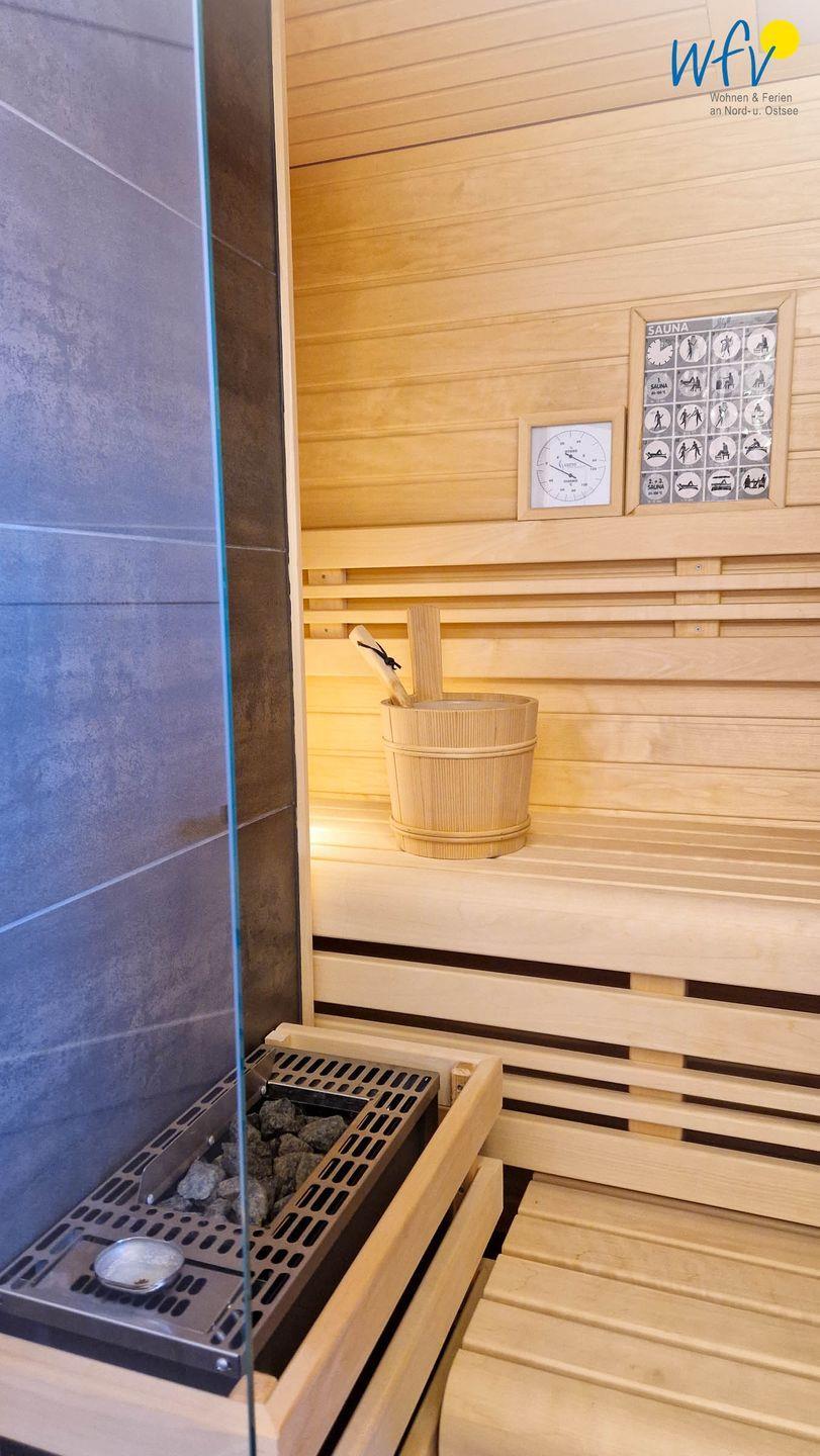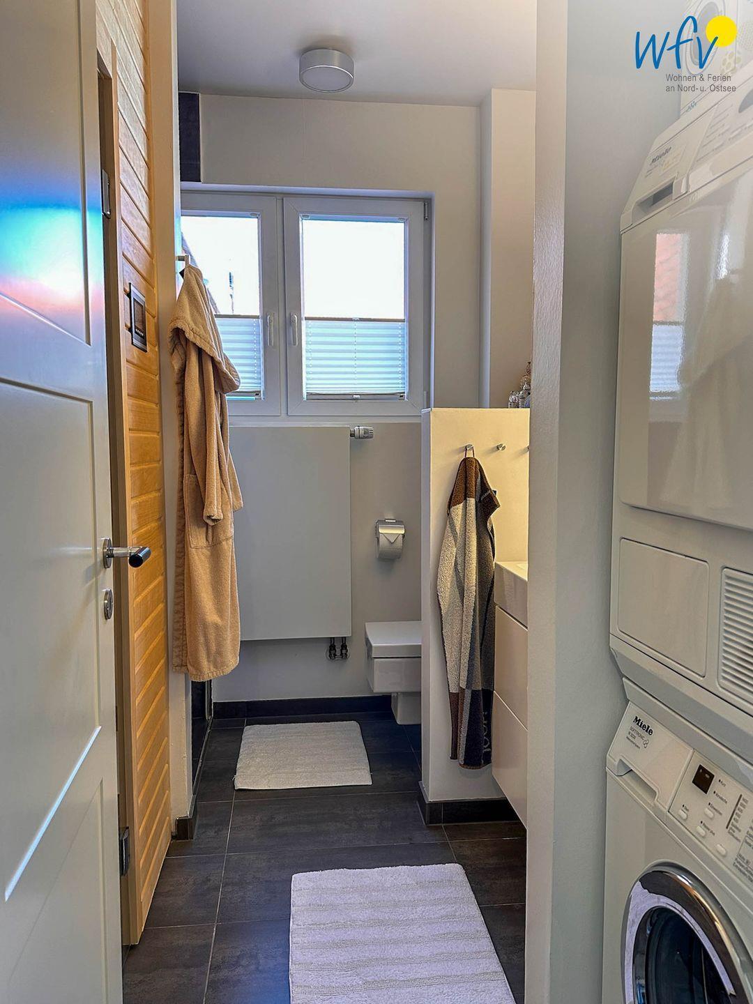 Das moderne Tageslichtbad mit bodengleicher Dusche, Fußbodenheizung und Sauna sorgt für wohltuende Entspannungszeit nach dem Strandspaziergang oder der Fahrradtour. Ein zusätzliches Gäste-WC bietet weiteren Wohnkomfort und angenehme Möglichkeiten zum Ausweichen.