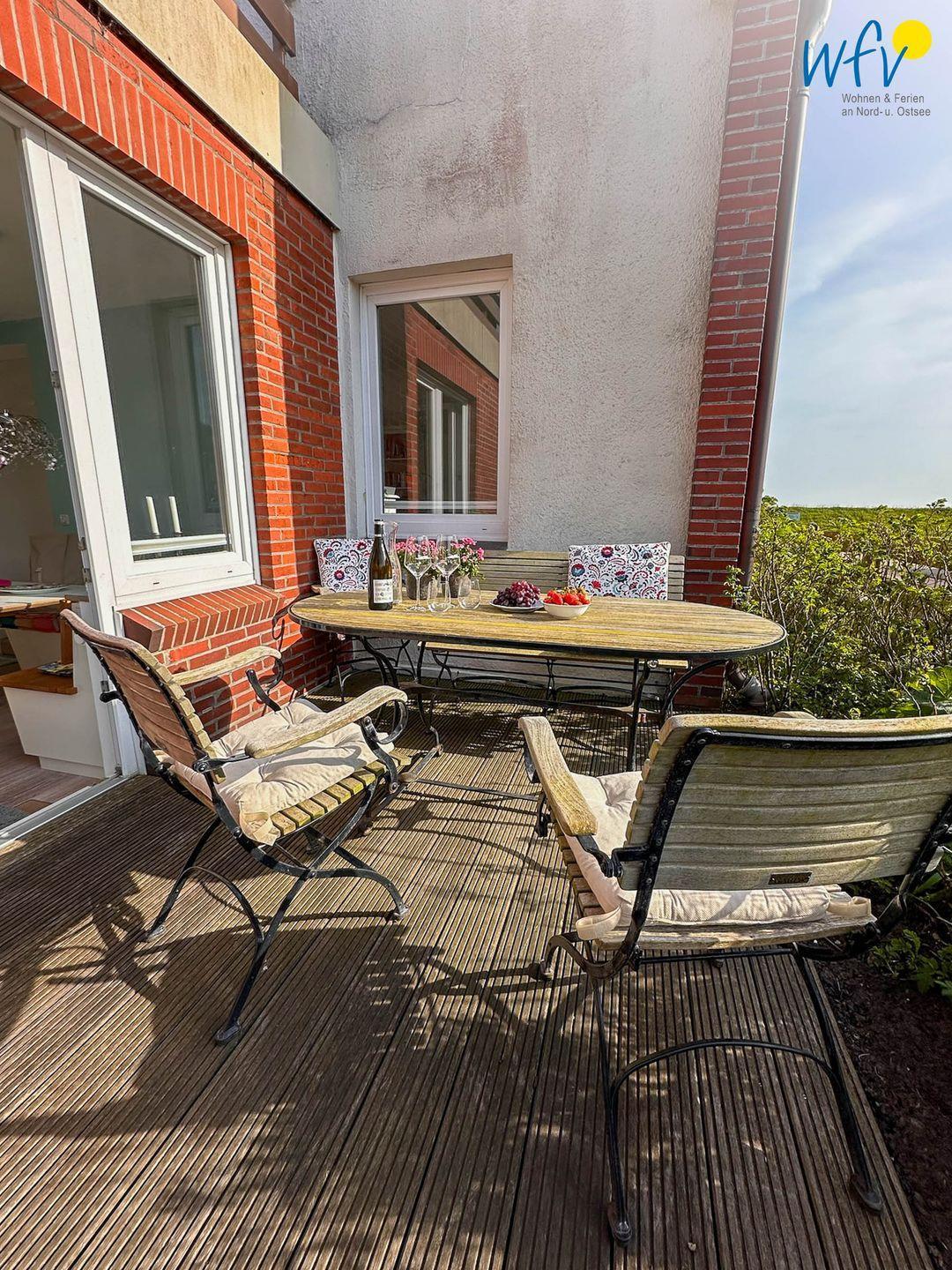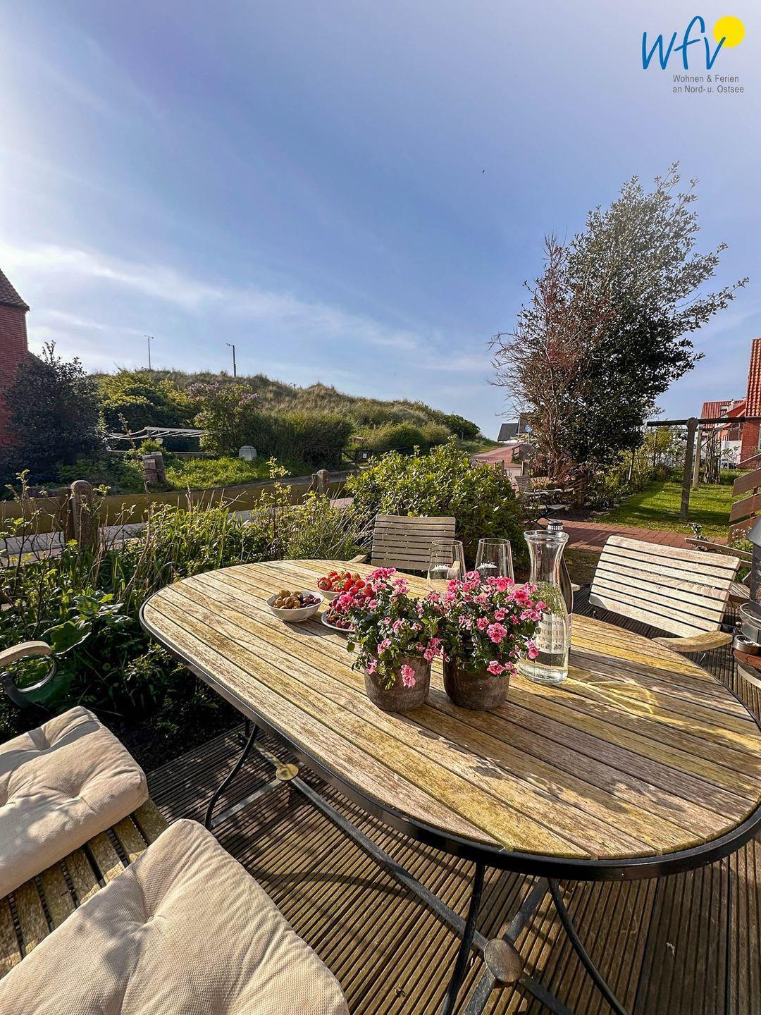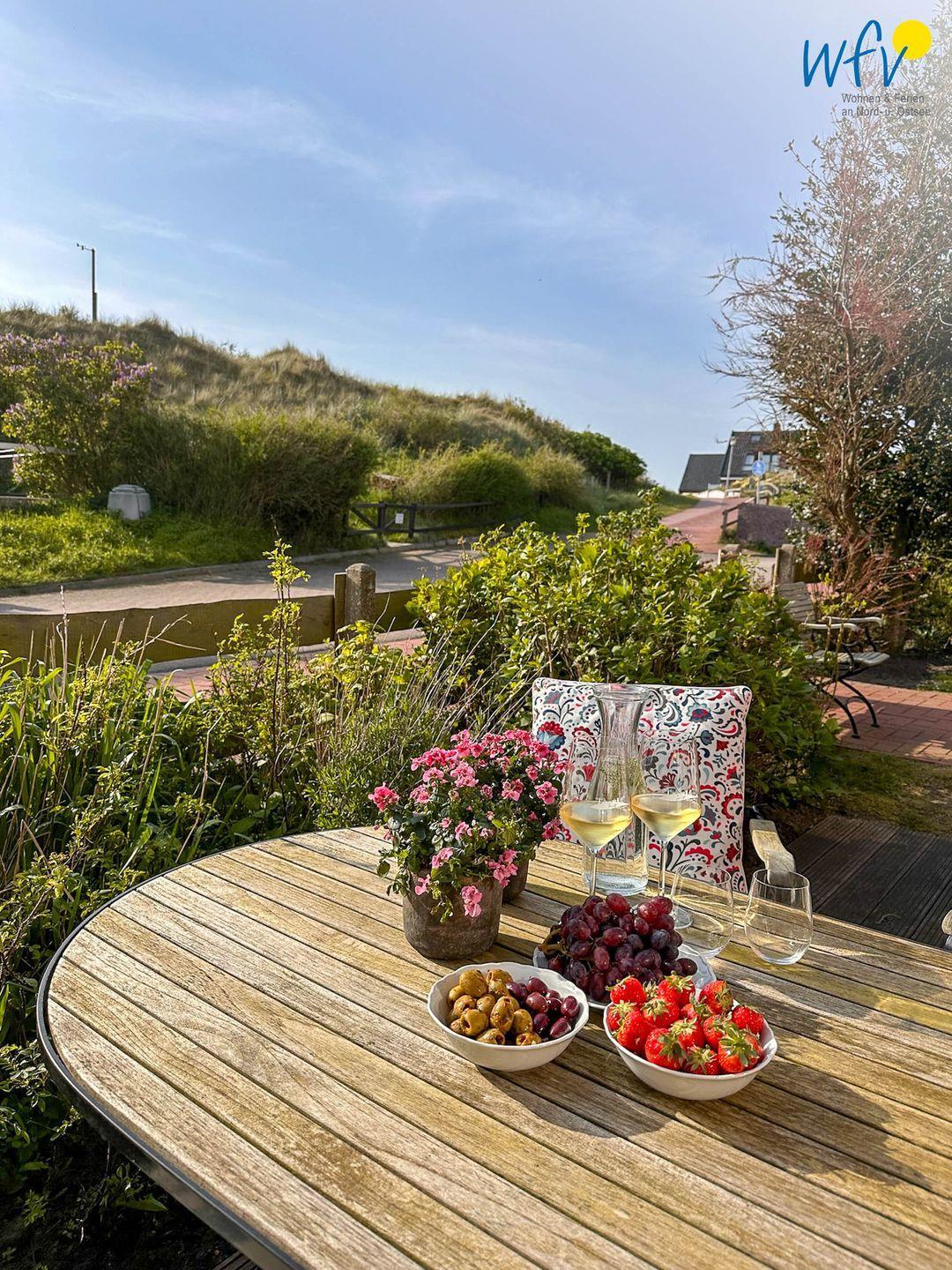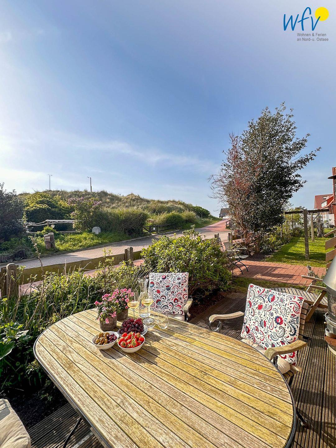 Sonne und Nordseeluft buchen Sie in unserer Ferienwohnung "Achterdör" inklusive: auf der sonnigen Terrasse können Sie wunderbar auf der Liege entspannen, gemütliche Grillabende verbringen oder einfach nur den wunderschönen Blick in die Dünen genießen. Wohltuende Nordseeluft können Sie zusätzlich im Gemeinschaftsgarten genießen, der sowohl zum Entspannen, als auch zum Spielen einlädt. Für gemütliche Grillabende steht ein Grillplatz mit einem Kohlegrill bereit.