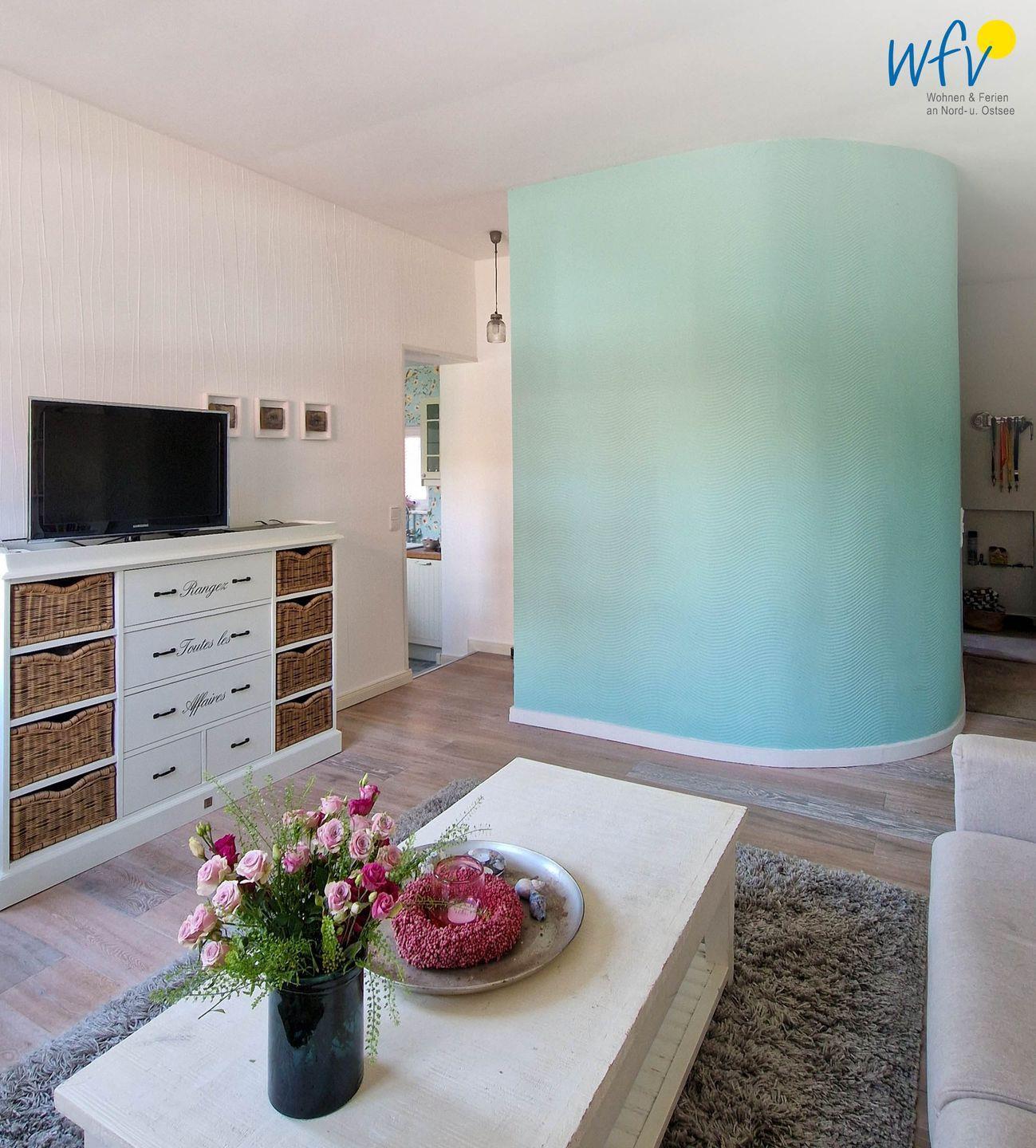Es erwartet Sie ein heller Wohnraum mit schönem Lichteinfall. Modernes Mobiliar wie eine Sitzecke mit Couch und Sessel lädt zum Entspannen ein, hübsche maritime Accessoires verleihen Ihrem Urlaub am Meer die entsprechende Nordseenote. In der Sitzecke mit TV, DVD-Player, einigen DVD`s und Blu-ray-Player können Sie gemütlich fernsehen oder Ihre Lieblingsfilme schauen. Zum Surfen vom Smartphone aus empfangen Sie kostenlos freies WLAN.