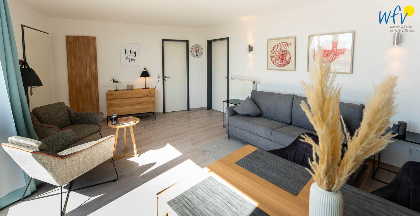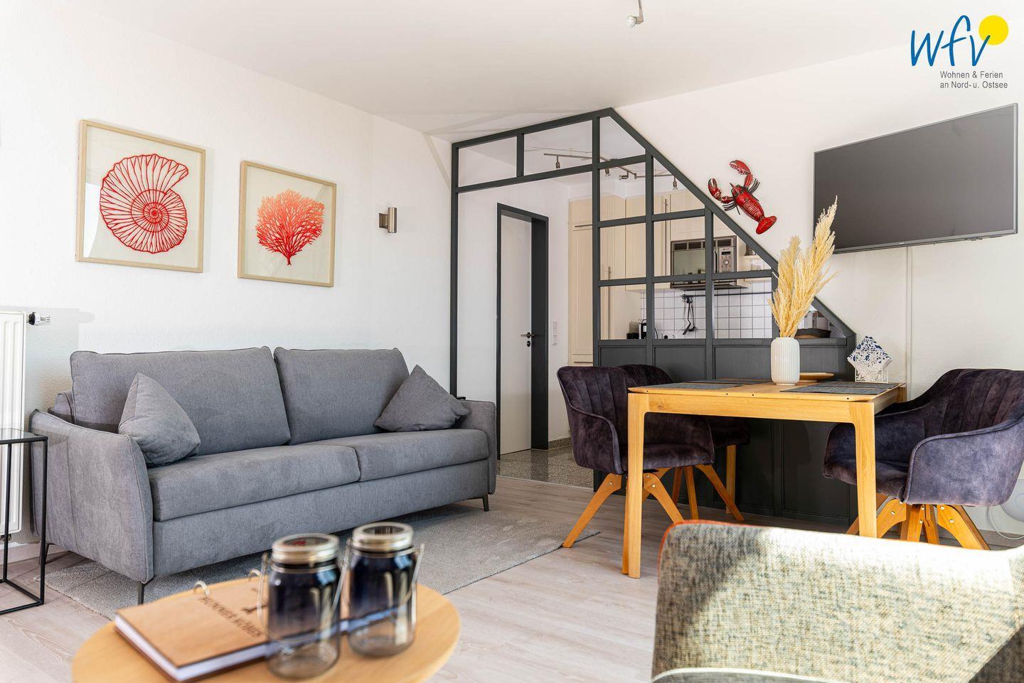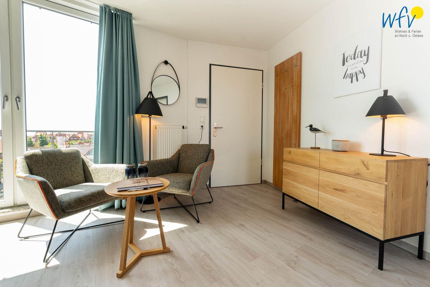 Im Wohnraum lädt ein modernes Ensemble aus Esstisch, bequemer Couch mit TV und zwei Lesesesseln am großen Fenster zu entspannten Stunden nach dem Strandtag oder der Fahrradtour ein. Zum Surfen vom Smartphone aus empfangen Sie kostenlos freies WLAN. Wohltuende Nordseeluft genießen Sie auf dem hübsch möblierten Balkon.