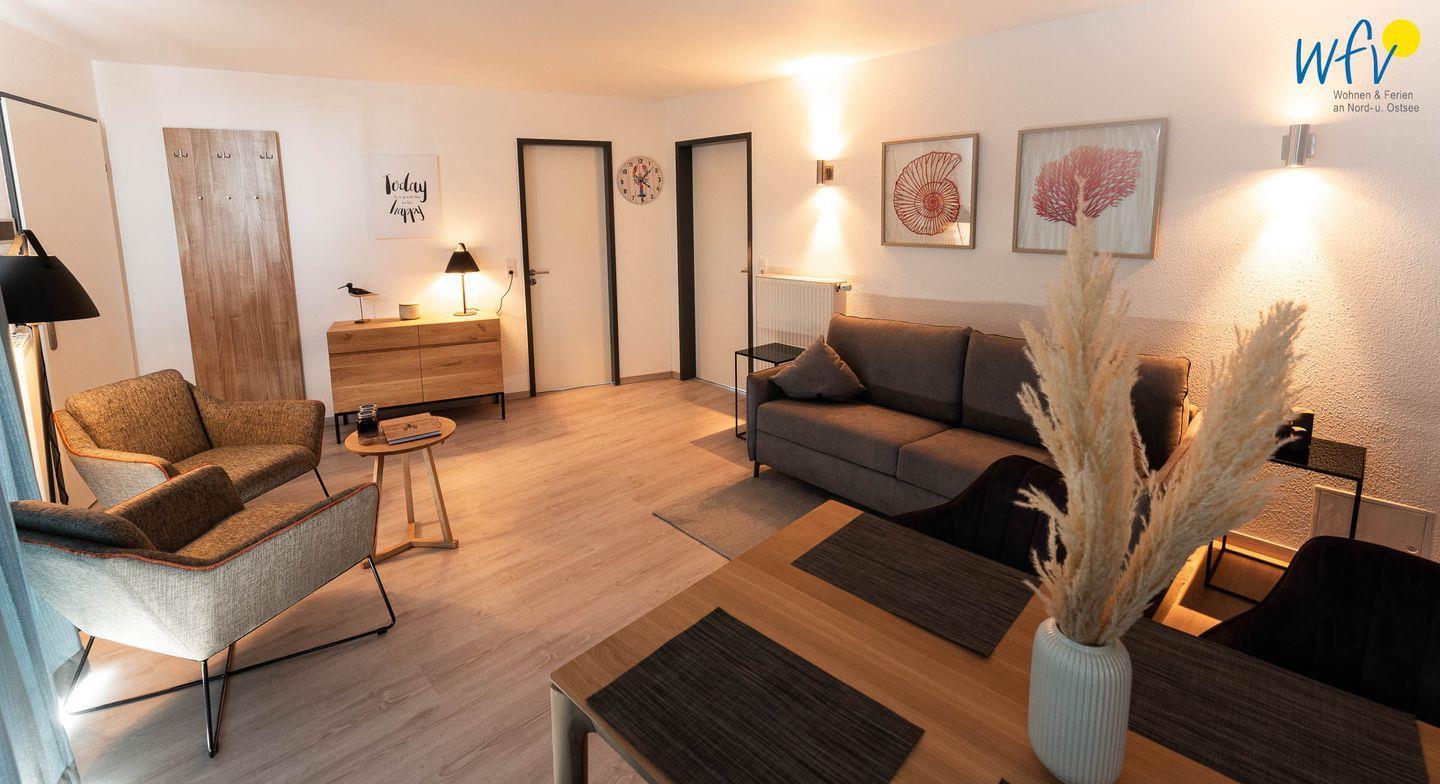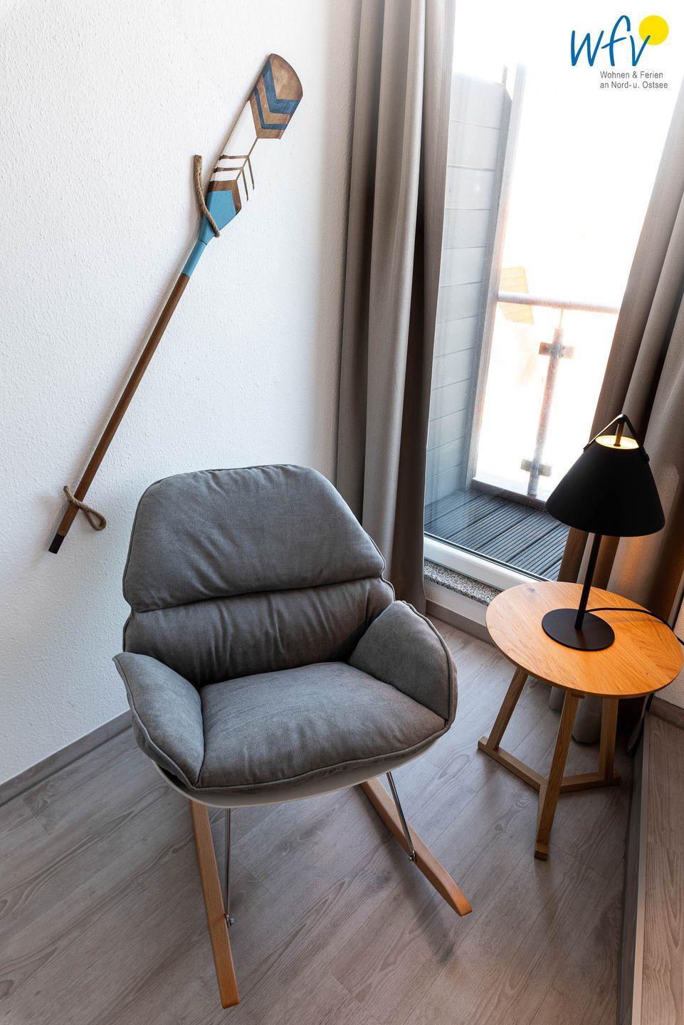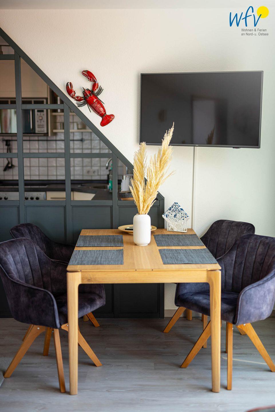 Im Wohnraum lädt ein modernes Ensemble aus Esstisch, bequemer Couch mit TV und zwei Lesesesseln am großen Fenster zu entspannten Stunden nach dem Strandtag oder der Fahrradtour ein. Zum Surfen vom Smartphone aus empfangen Sie kostenlos freies WLAN. Wohltuende Nordseeluft genießen Sie auf dem hübsch möblierten Balkon.