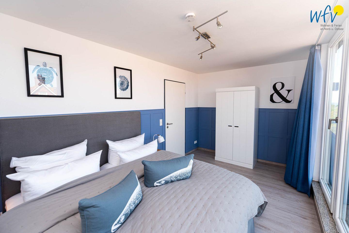 Wenn auf Juist die Sonne untergeht, der Letzte den Strand verlassen hat und es Zeit zum Ruhen wird, können Sie sich in den zwei separaten und komfortablen Schlafzimmer erholen. Für kleine Piraten ist das Kinderzimmer mit einem gemütlichen Etagenbett mit Schlafkojen eingerichtet (2 x 200 cm x 0,90 cm) und einige Spiele und Sandspielzeuge sind vorhanden. In dem zweiten Schlafzimmer befindet sich ein komfortables Doppelbett (200 cm x 185 cm). Eine breite Fensterfront bietet morgens beim Aufstehen einen wunderbaren Blick in die Umgebung. Von hier aus gelangen Sie direkt auf einen möblierten Balkon, von dem Sie eine sehr schöne Aussicht über die Dächer des Töwerlands bis hin zur Nordsee haben. Ein wunderbares Urlaubsgefühl! Auch das Kinderzimmer verfügt über einen eigenen kleinen Balkon. In beiden Zimmern bieten geräumige Kleiderschränke Platz für die Urlaubsgarderobe. Für zwei weitere Personen kann das Sofa im Wohnraum schnell und einfach zu einem bequemen Doppelbett umfunktioniert werden (195 cm x 165 cm).