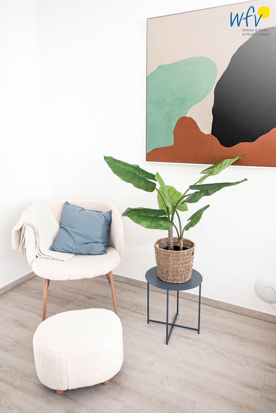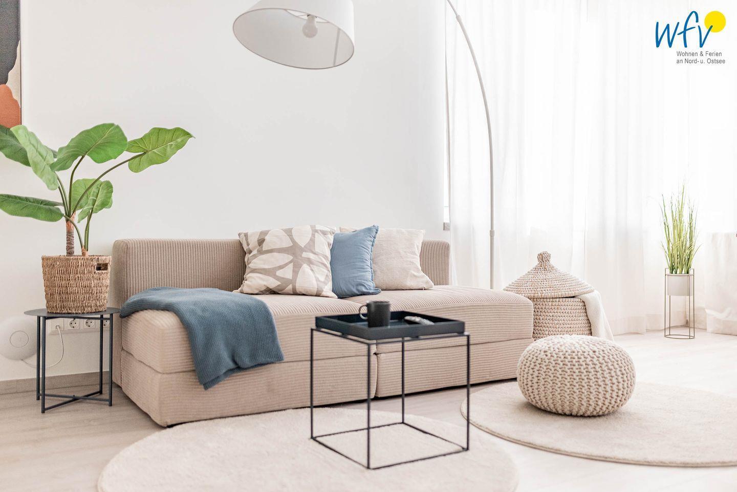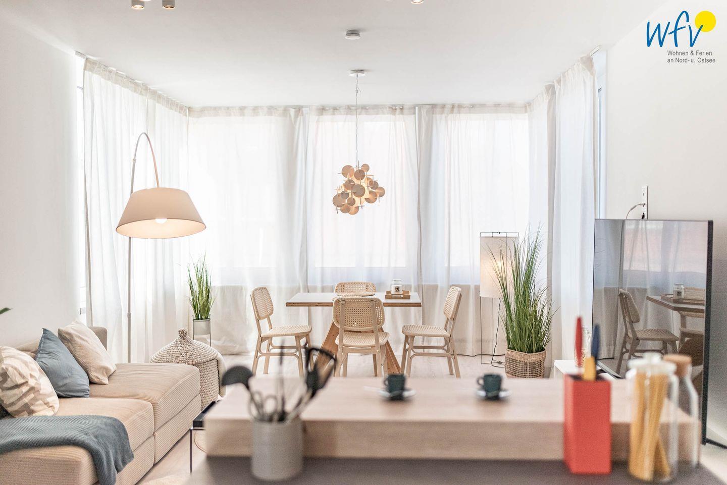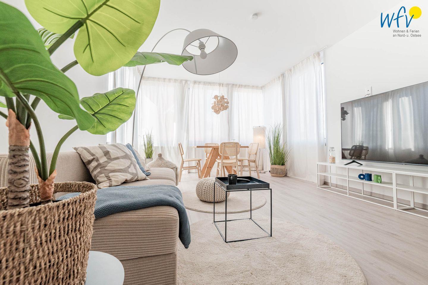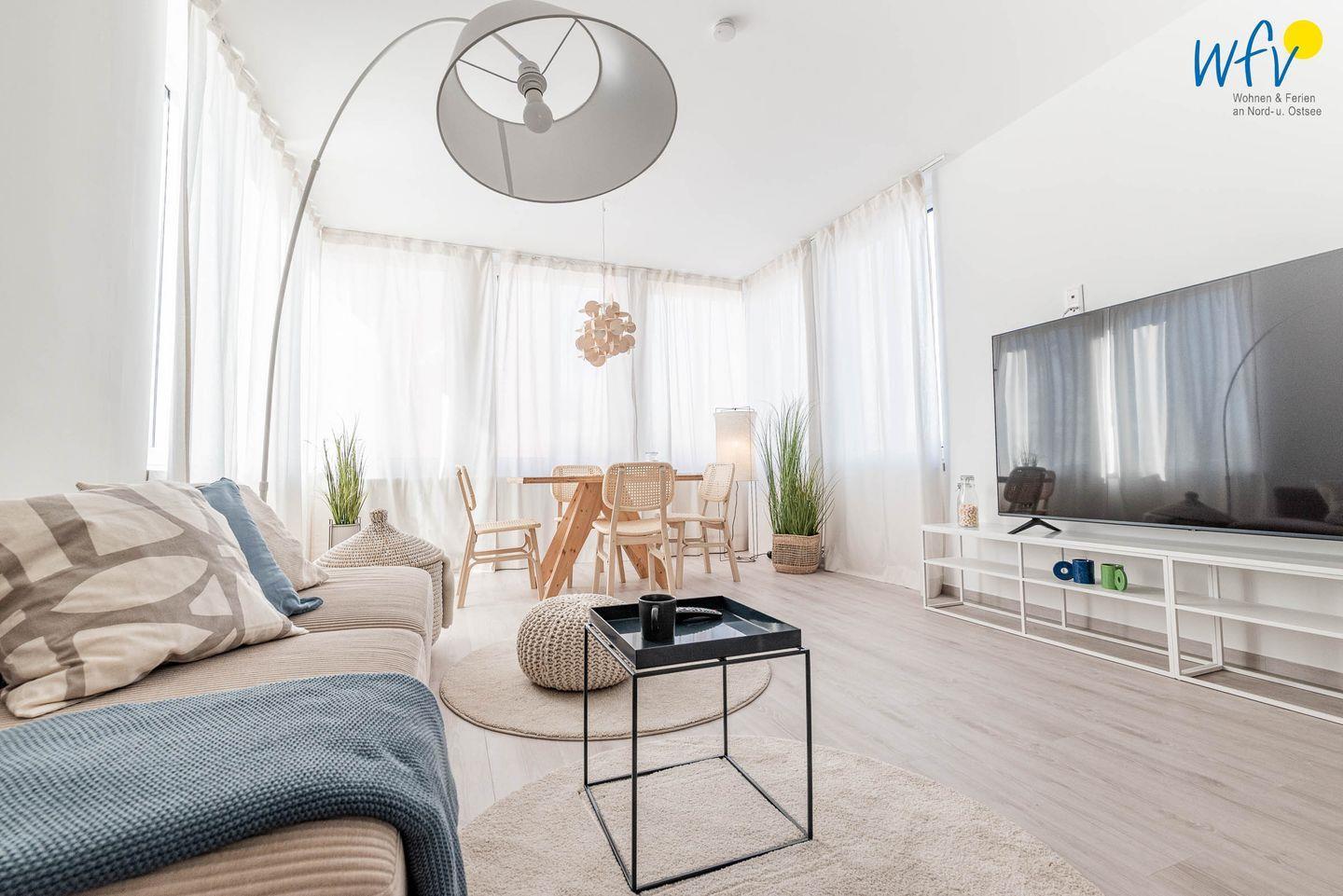 Bereits bei der Ankunft empfängt Sie schönste Urlaubsstimmung: Der helle Wohnraum mit hochwertiger Einrichtung in harmonischer Farbgestaltung bietet Platz zum gemütlichen Beisammensein und zum Ausspannen. Nach dem Strandtag oder der Fahrradtour lädt die Couch mit großem TV zum Fernsehen ein, in dem Relaxsessel mit Fußhocker können Sie entspannt die Urlaubslektüre lesen. Zum Surfen vom Smartphone aus empfangen Sie kostenlos freies WLAN.