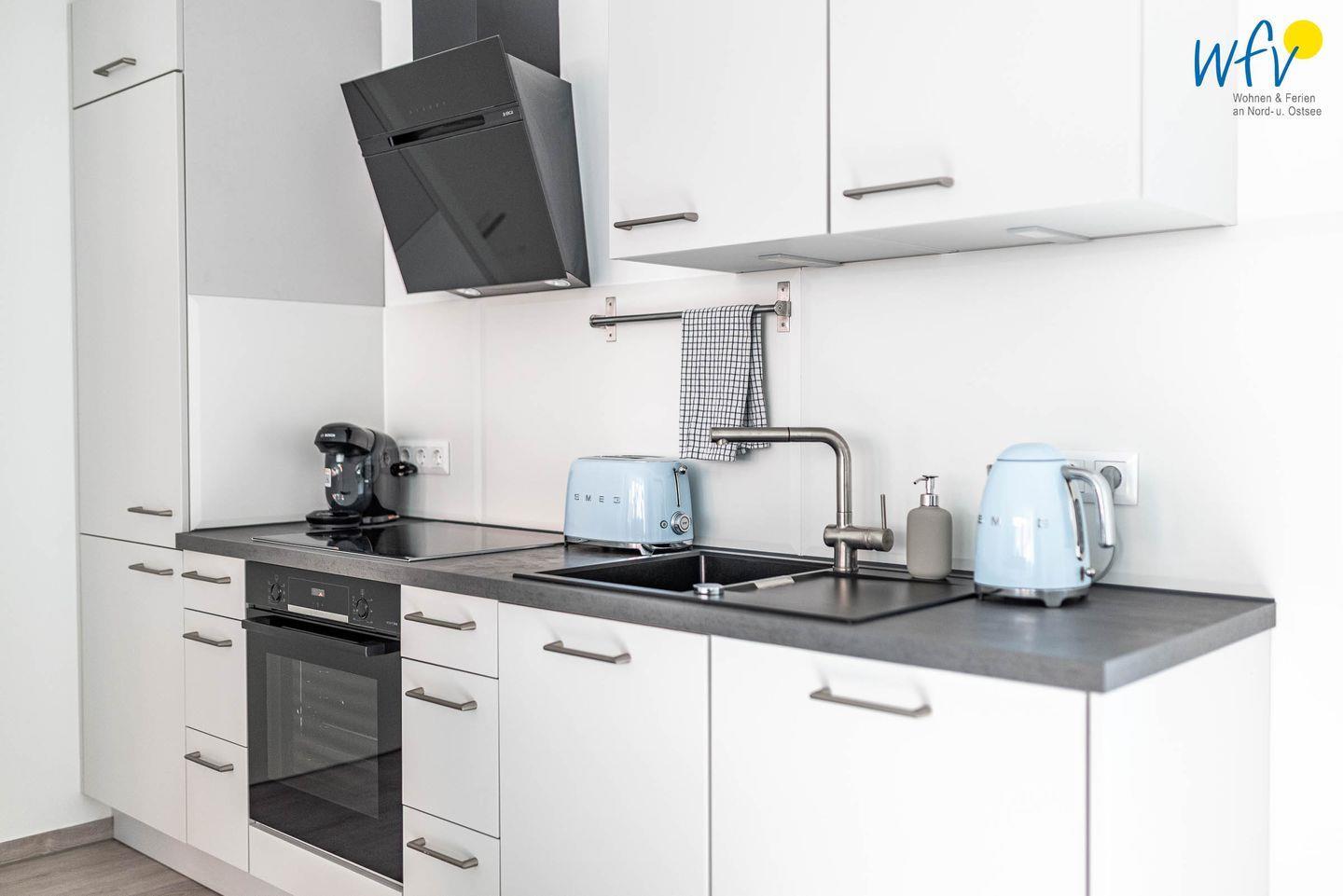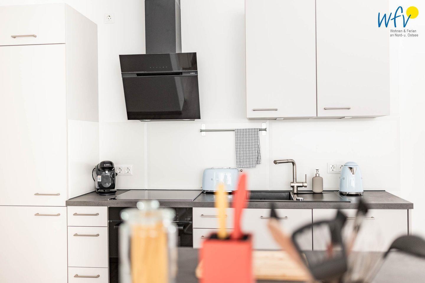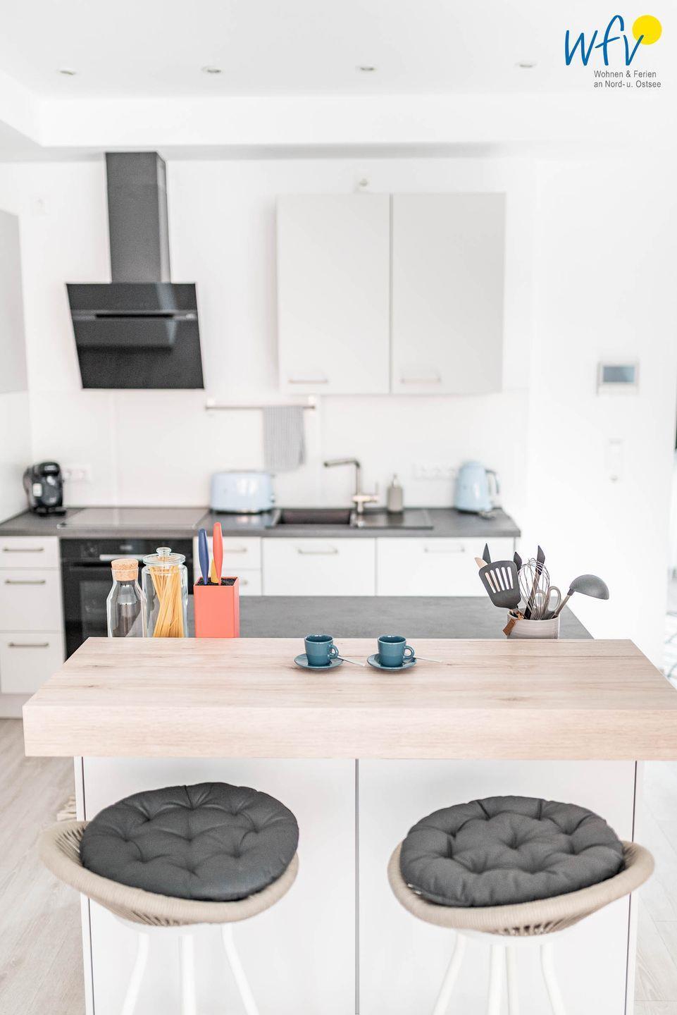 Die offene Einbauküche mit modernem Tresen und hochwertigen Geräten wie Induktionsherd, Backofen, Kühlschrank mit Gefrierfach, Geschirrspüler und Nespresso-Maschine (Kapsel) ermöglicht Ihnen eine bequeme Selbstverpflegung. Gemeinsame Mahlzeiten können Sie am Esstisch mit schönem Blick in die Umgebung einnehmen. Oder Sie lassen sich kulinarisch verwöhnen: Zu einem Sonderpreis bietet Ihnen das "Hotel Atlantic" ein Frühstück an (3 Min. Fußweg) - täglich zwischen 8 und 12 Uhr.