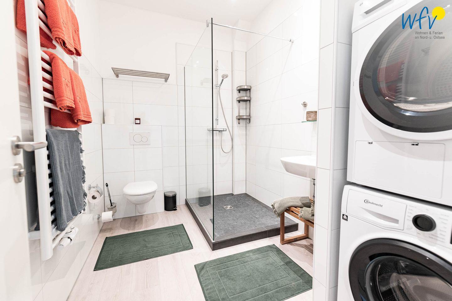 Das elegante Badezimmer mit Dusche, Föhn und Handtuchheizung sorgt für weiteren Wohnkomfort und Entspannungszeit.