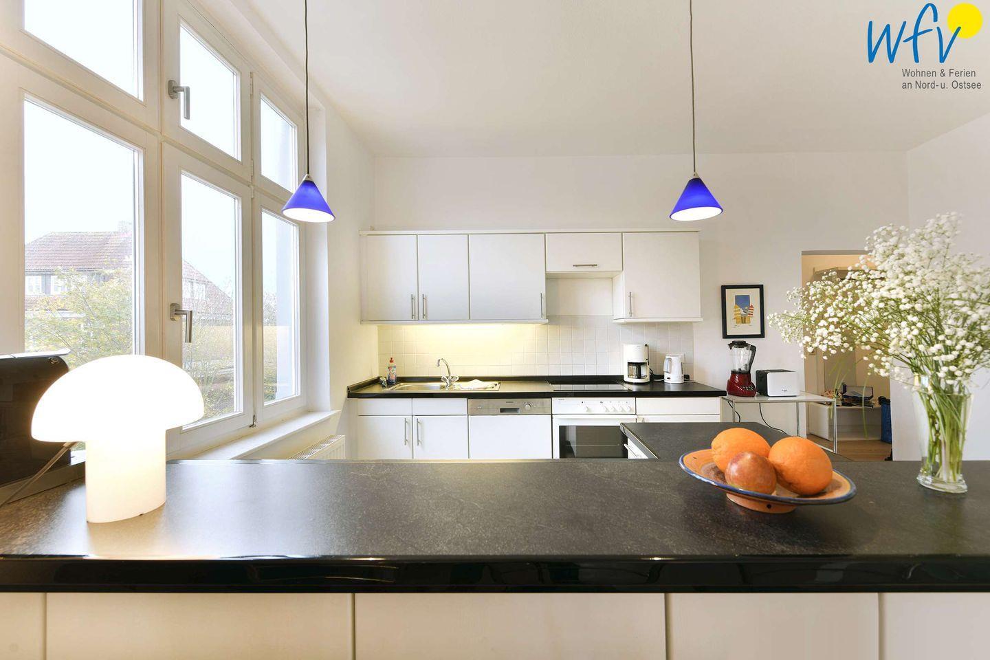Es empfängt Sie eine modern eingerichtete Wohnküche: Sowohl der Tresentisch, als auch der Essbereich im Turmerker bietet Gelegenheit zum Sitzen. Eine komplette Ausstattung (4-Platten-Ceranfeld, Backofen, Spülmaschine) ermöglicht Ihnen eine bequeme Selbstverpflegung.