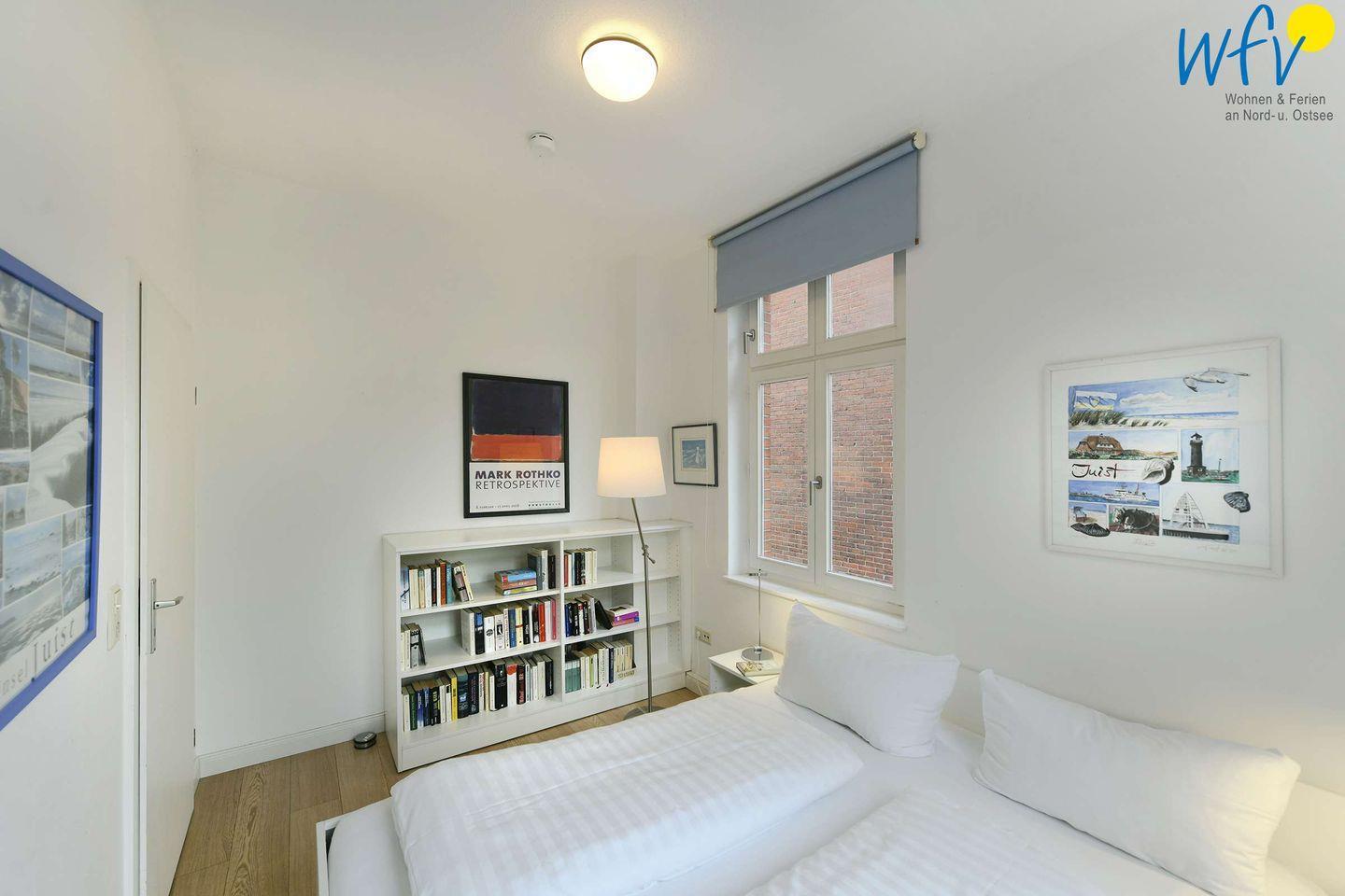 Die zwei separaten Schlafzimmer der Ferienwohnung „Robbenplate“ auf Juist teilen sich in Eltern – und Kinderschlafzimmer auf. Eines der Zimmer ist mit einem Doppelbett eingerichtet, das andere mit zwei Einzelbetten (eines davon zum Doppelbett ausziehbar).