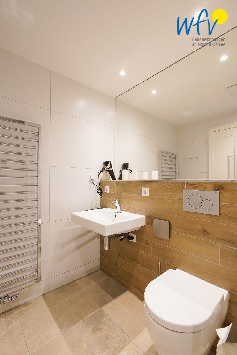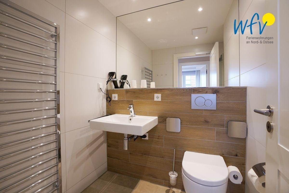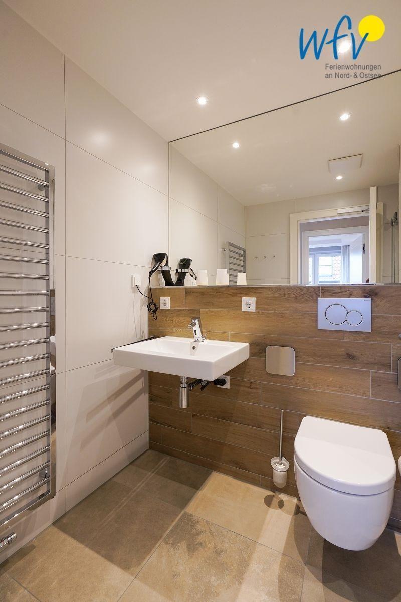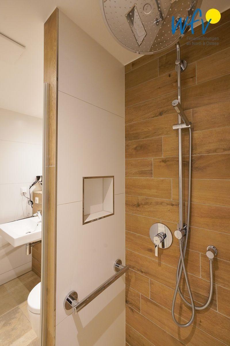 Das behindertengerechte Bad der Ferienwohnung ist mit einer ebenerdigen Dusche ausgestattet; außerdem mit Waschbecken, WC und Handtuchwärmer.