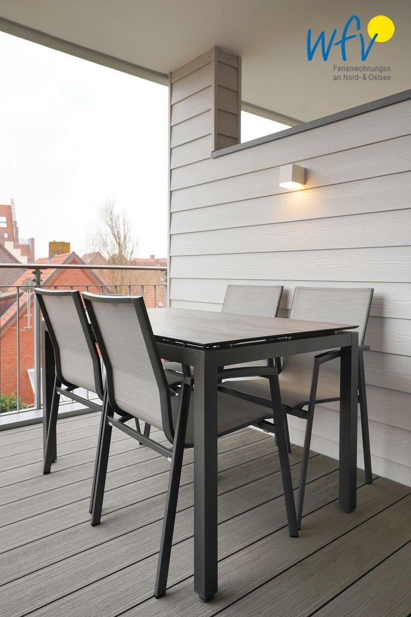 Pure Erholung erwartet Sie auf dem sonnigen Balkon der Ferienwohnung auf Juist! Dies ist ein wunderbarer Ort, um in Ruhe ein gutes Buch zu lesen, sich zu sonnen oder mit der Familie draußen zu essen. Durch die Ausrichtung nach Süden können Sie hier am Tag viele Stunden lang die Sonne genießen (bis ca. 15.30 Uhr).