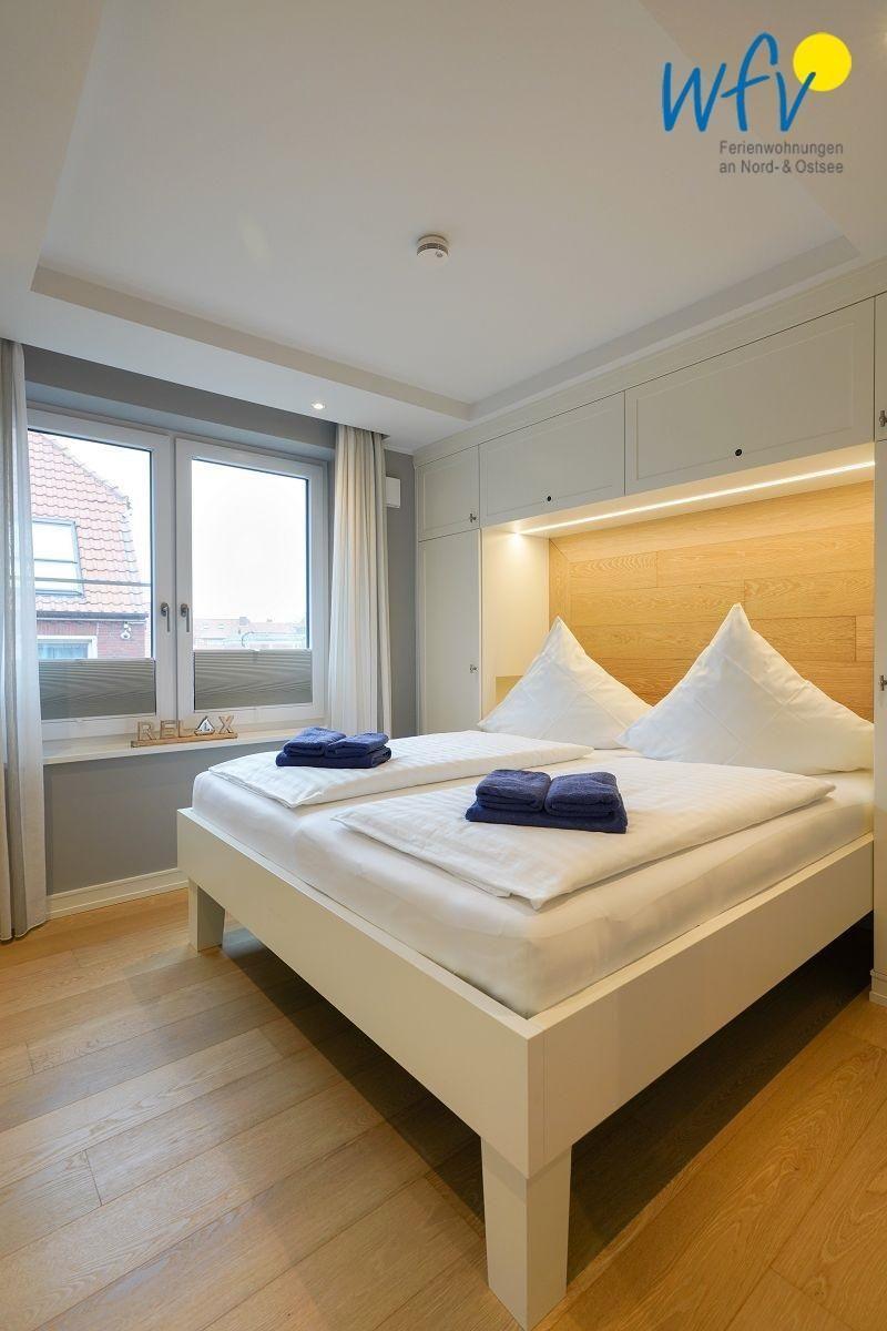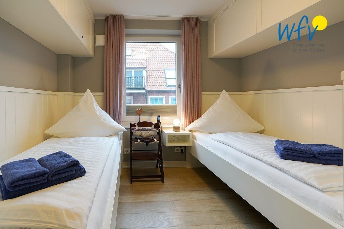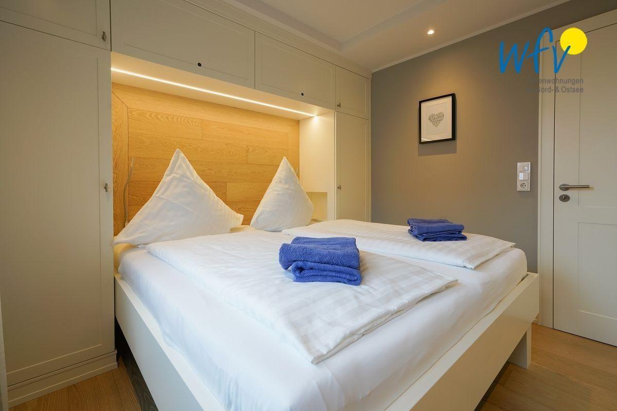 Eines der zwei separaten Schlafzimmer ist mit einem Doppelbett ausgestattet (180 cm x 200 cm). Hier können Sie vom Bett aus fernsehen. Das andere Schlafzimmer verfügt über zwei Einzelbetten (je 90 cm x 200 cm; Bettensitzhöhe ca. 60 cm). In beiden Zimmern bieten Kleiderschränke Platz für die Urlaubsgarderobe.