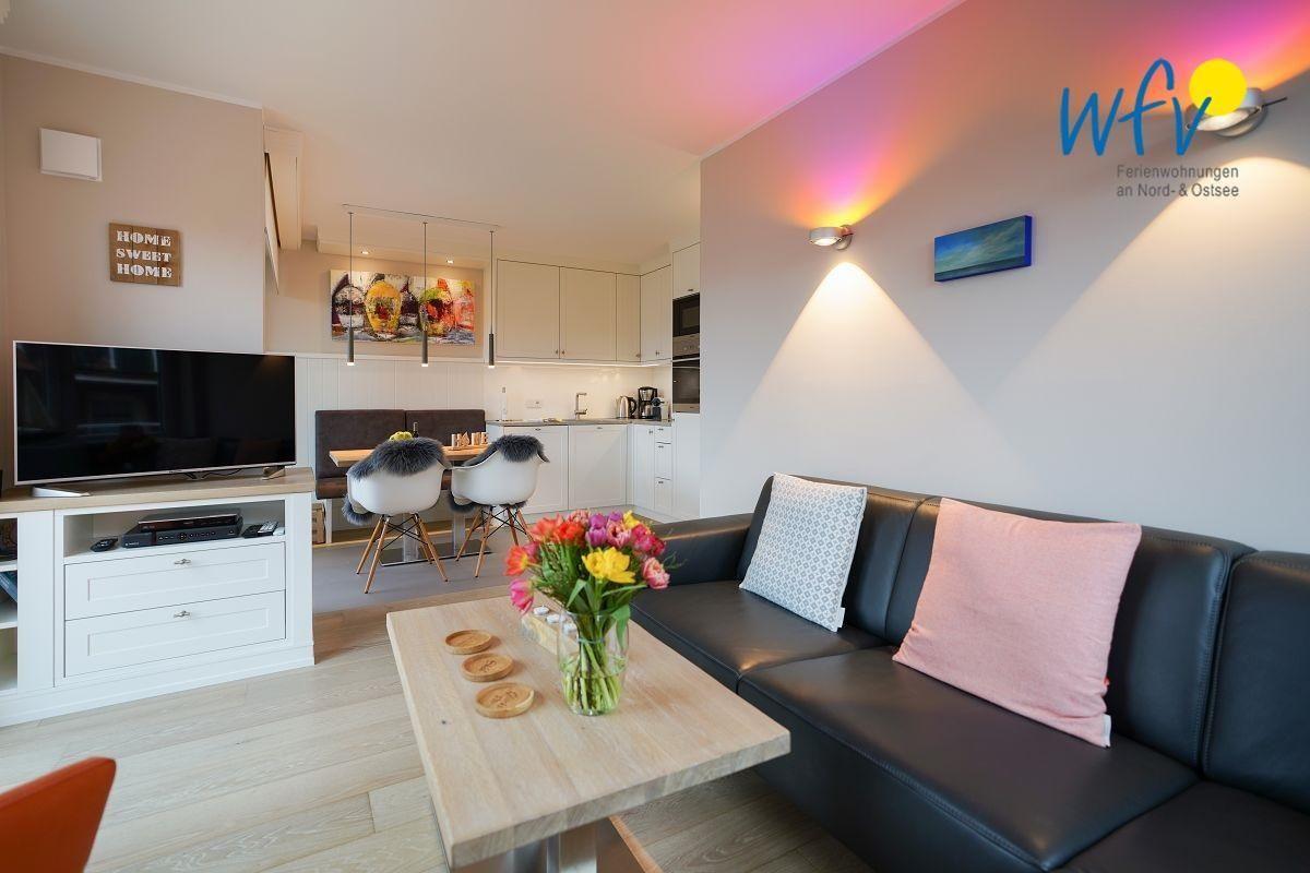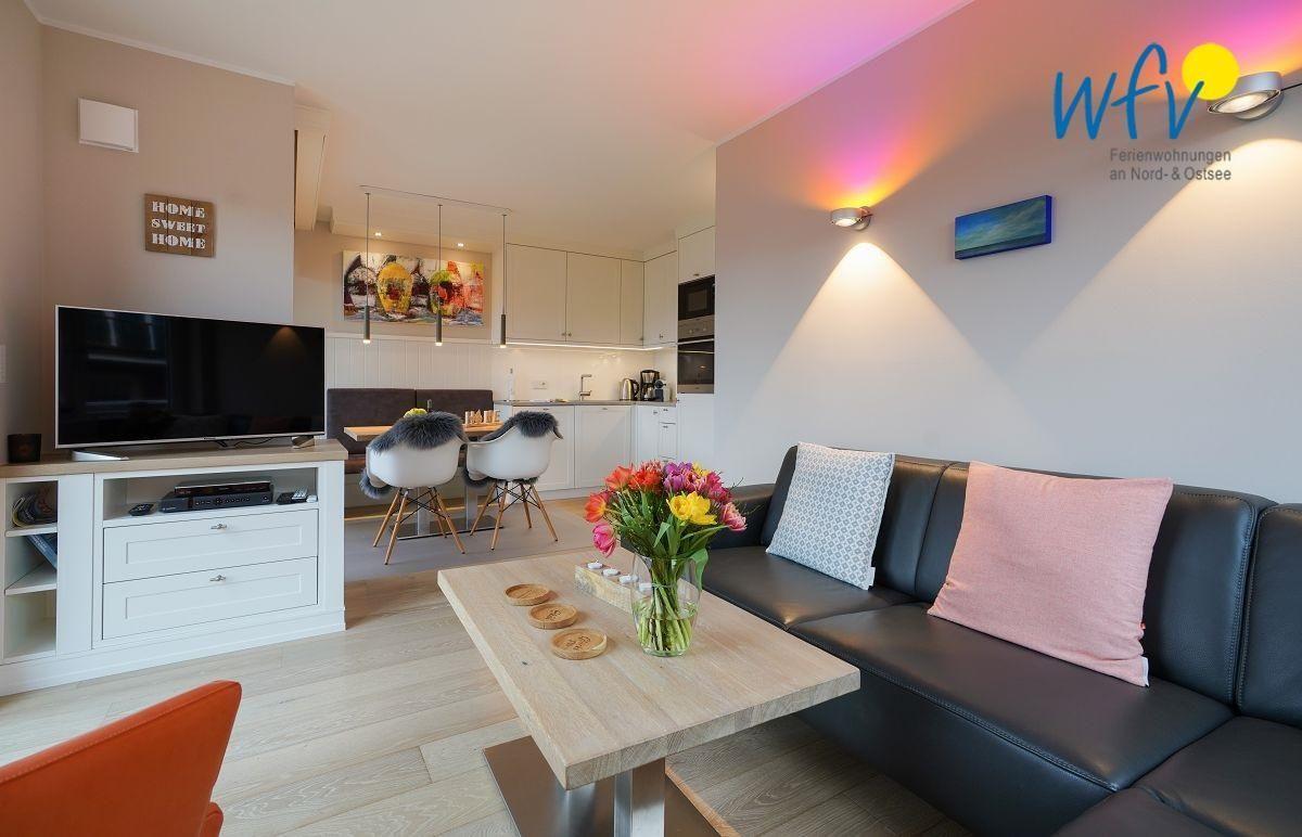 Die Ferienwohnung besitzt auf knapp 60 m² eine vorteilhafte Aufteilung - mit zwei separaten Schlafzimmern, Wohnraum, Küche, Bad und Balkon. Helle lichtdurchflutete Räume, eine komfortable Ausstattung mit maßgefertigten Möbeln, indirekte Beleuchtungen und Parkettfußboden verleihen der Unterkunft eine sehr freundliche und gemütliche Wohnatmosphäre. Hochwertige technische Geräte wie zwei Fernseher, Radio, CD- und DVD-Player sowie ein Bose Soundwave No.4 bieten Ihnen weiteren Komfort. Die Ferienwohnung verfügt zudem über kostenloses WLAN.