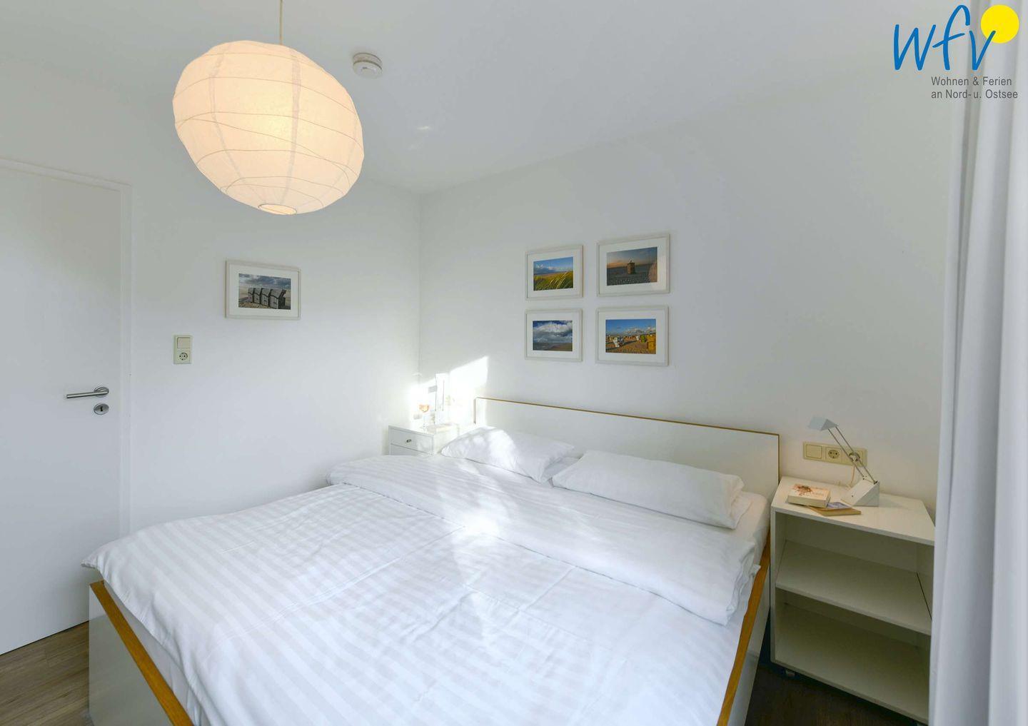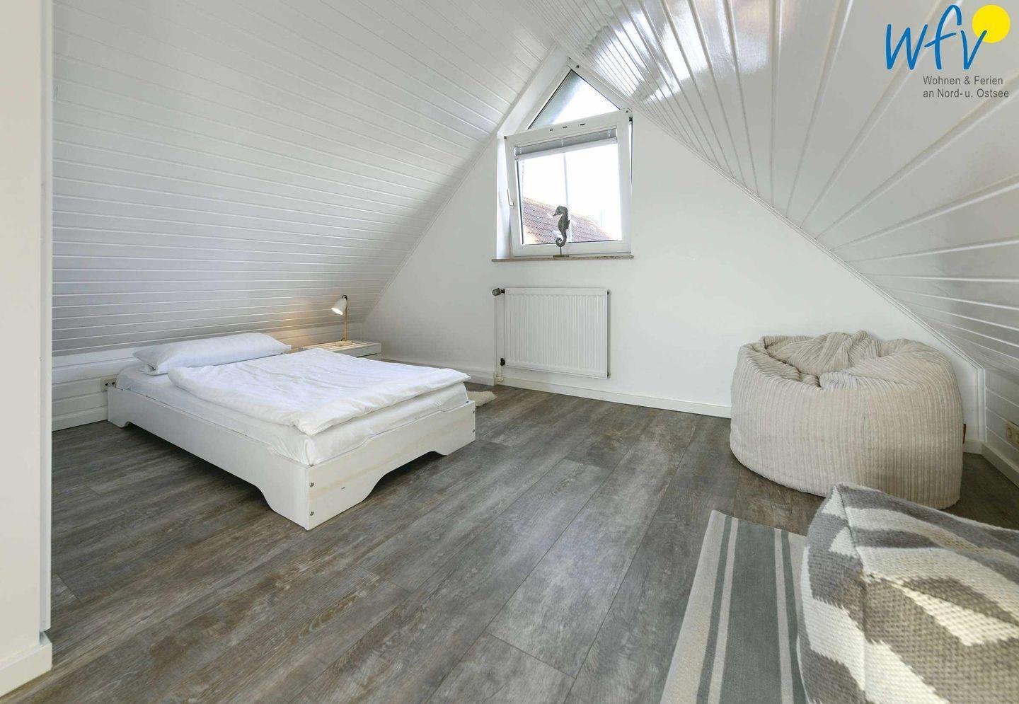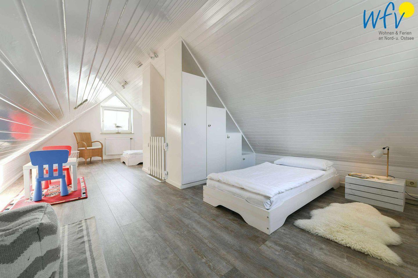In dem separaten Elternschlafzimmer (OG) der Ferienwohnung "Christina" auf Juist befindet sich ein Doppelbett; das Kinderschlafzimmer (DG) ist mit zwei Einzelbetten eingerichtet. Die Sitzecke kann wunderbar zum Spielen oder Lesen genutzt werden.