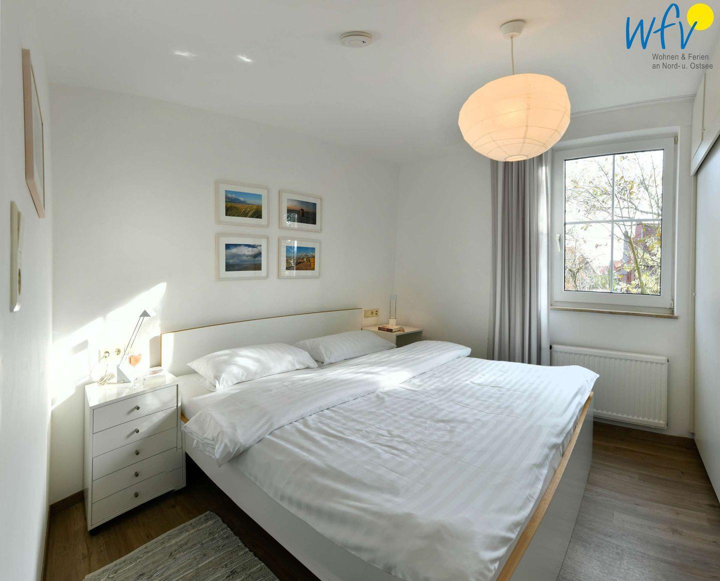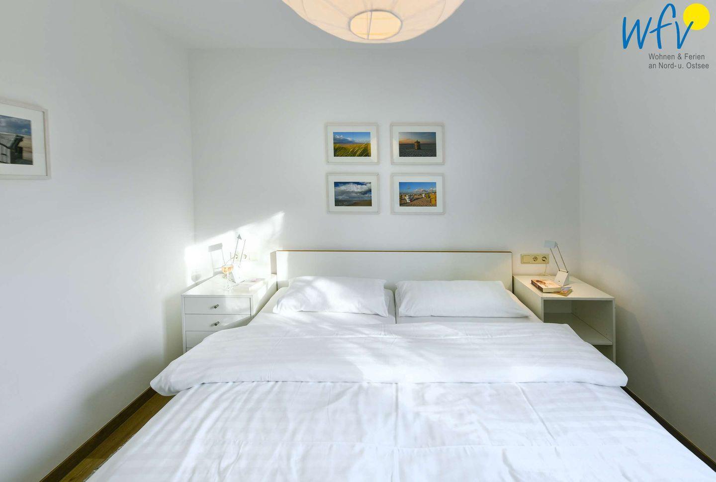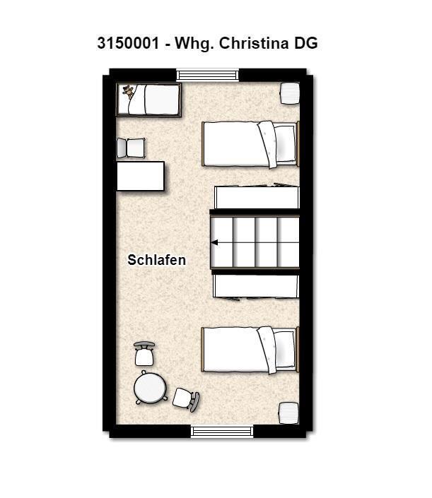 In dem separaten Elternschlafzimmer (OG) der Ferienwohnung "Christina" auf Juist befindet sich ein Doppelbett; das Kinderschlafzimmer (DG) ist mit zwei Einzelbetten eingerichtet. Die Sitzecke kann wunderbar zum Spielen oder Lesen genutzt werden.