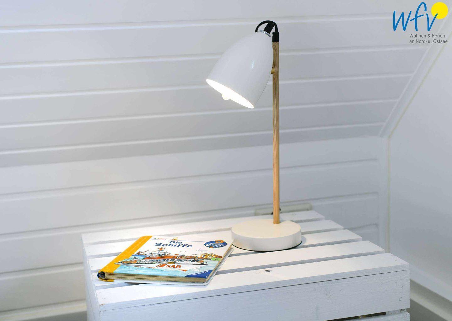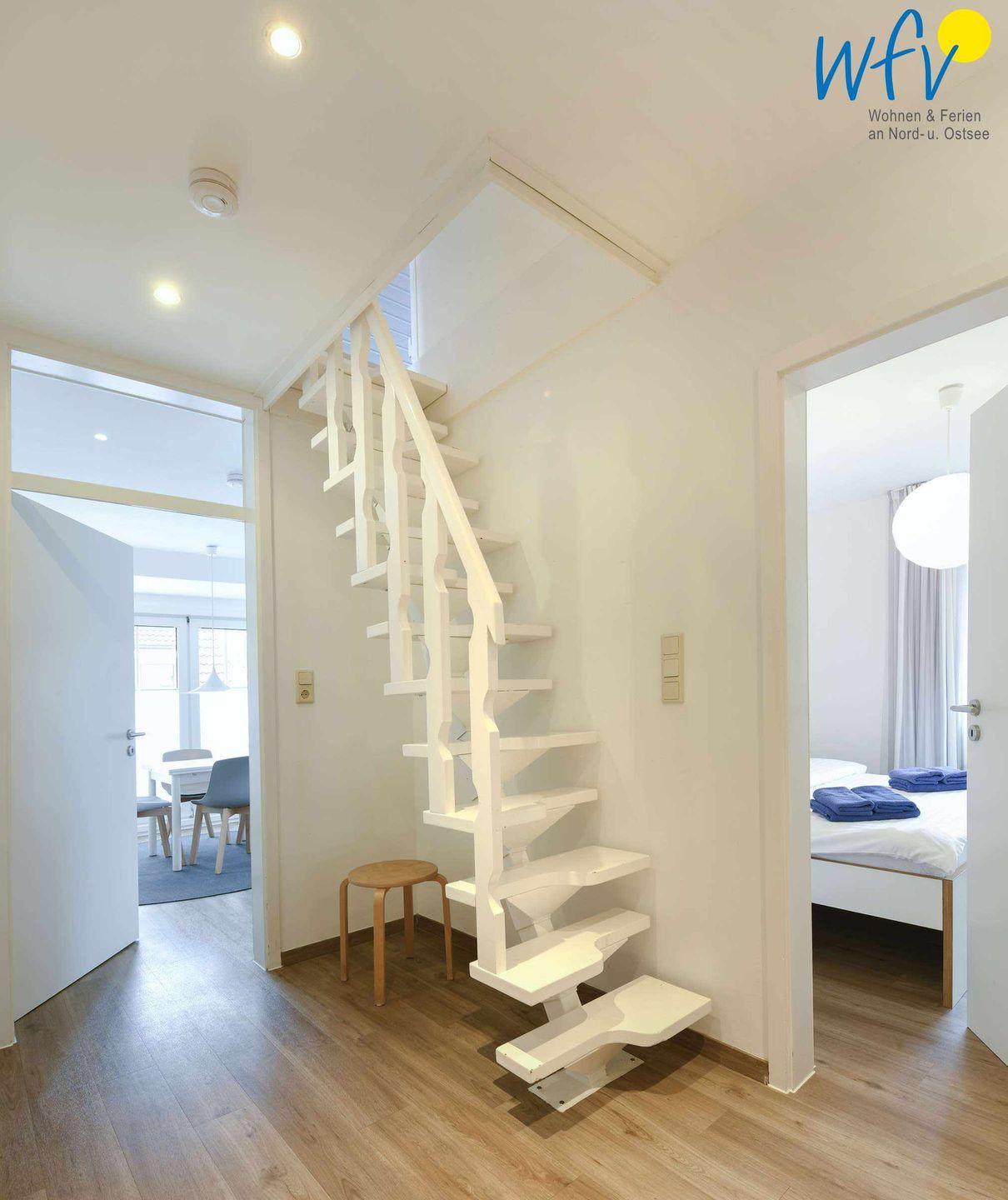 Die Ferienwohnung erstreckt sich über zwei Etagen - Obergeschoss und Dachgeschoss. Im Obergeschoss befindet sich der Wohnraum mit Couchecke, Essbereich und offener Küche, das separate Elternschlafzimmer und das Duschbad sowie der Balkon. In dem hübsch ausgebauten Dachgeschoss wurde das Kinderzimmer eingerichtet.