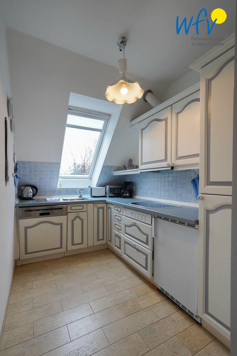 An den Wohnraum schließt sich eine offene Küche an. Ihre Vollausstattung (u.a. mit 4-Plattenherd, kleinem Backofen, Geschirrspüler und diversen Kleingeräten) ermöglicht Ihnen eine bequeme Selbstverpflegung.