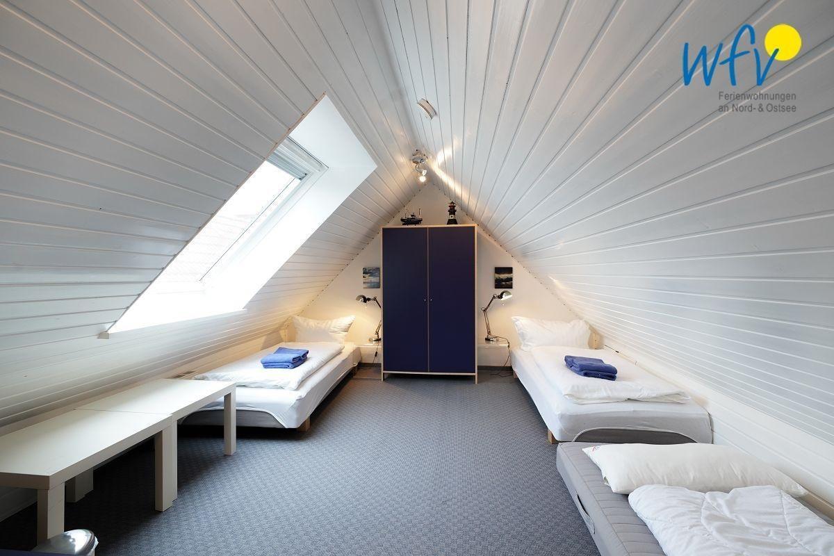 Die helle Maisonette-Wohnung (1. OG) erstreckt sich über zwei Etagen und bietet Ihnen Platz für bis zu sechs Personen. Im unteren Bereich der Ferienwohnung befinden sich ein Wohnraum, eine Küche, ein separates Schlafzimmer und ein Duschbad mit separatem WC. Im oberen Bereich stehen Ihnen weitere Schlafmöglichkeiten zur Verfügung.