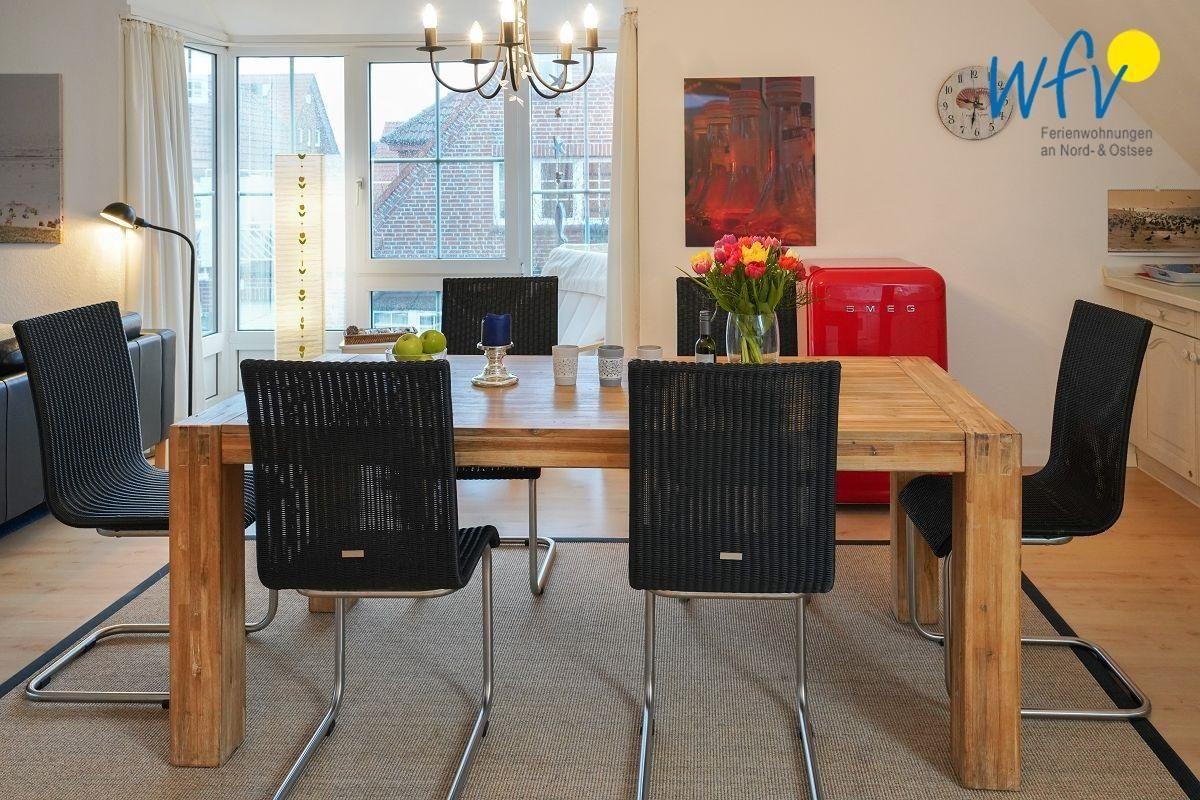 Die komfortable Ferienwohnung erstreckt sich über zwei Etagen und verfügt über einen Wohnraum mit integrierter Wohnküche, drei separate Schlafzimmer, zwei Bäder und einen Balkon. Helle Räume, modernes Mobiliar und eine liebevolle Einrichtung machen die Ferienwohnung zu einer Wohlfühloase, in der Sie Ihren Urlaub auf Juist in vollen Zügen genießen können.