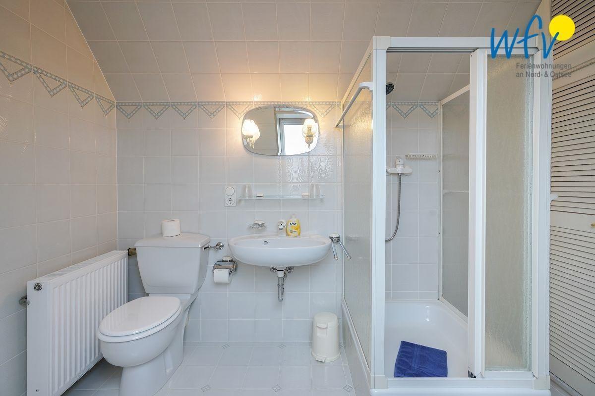 Die Ferienwohnung verfügt über zwei große Tageslichtbäder. Eines mit zwei Waschbecken, Bidet, WC und Dusche; das andere mit Waschbecken, WC und Dusche. Waschmaschine und Trockner stehen Ihnen in einem zur Wohnung gehörenden Keller zur Verfügung.