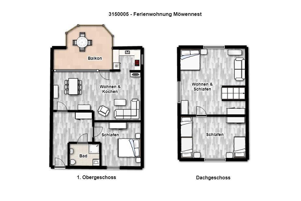 Die Ferienwohnung verfügt über eine sehr vorteilhafte Aufteilung. Ein Wohnraum mit Couchecke und Essbereich, eine Küche, drei separate Schlafzimmer und ein Duschbad bieten Ihnen Platz für bis zu sechs Personen. Helle Möbel sowie eine liebevolle Einrichtung machen die Ferienwohnung "Möwennest" zu einem Wohlfühlort für die ganze Familie!