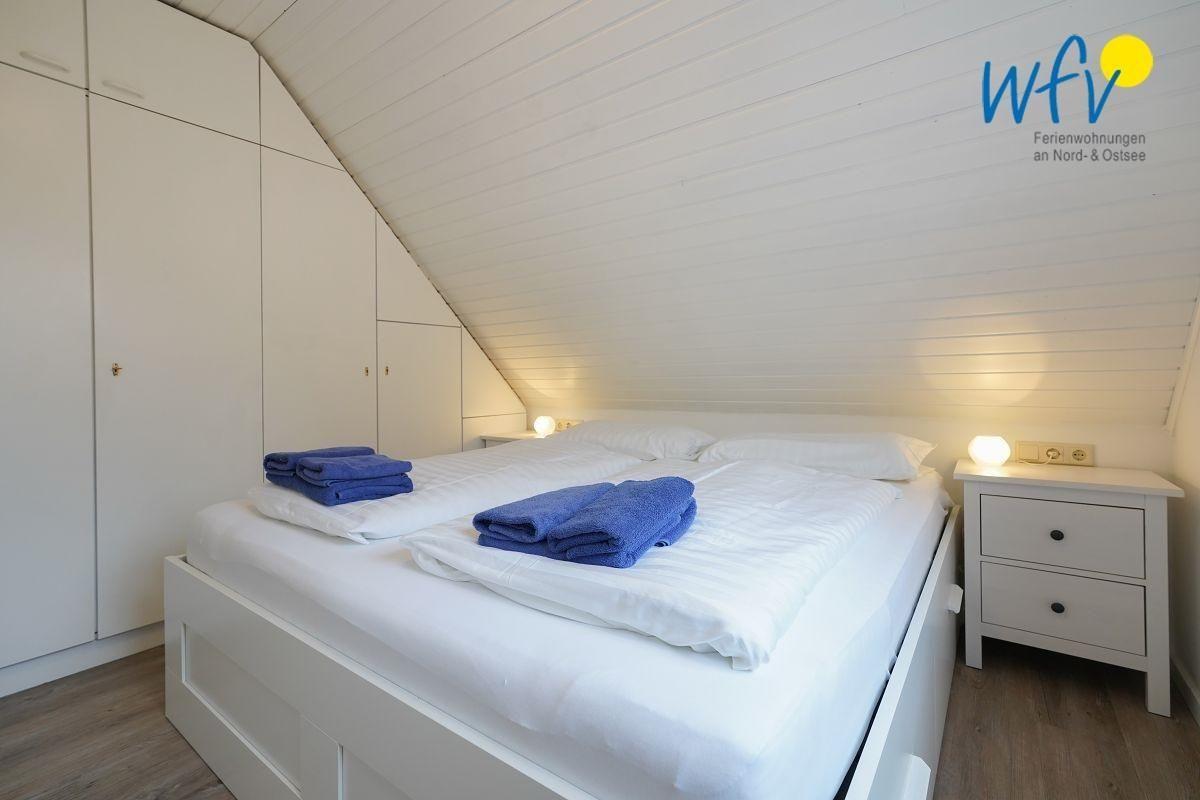 In zwei der drei separaten Schlafzimmer befindet sich jeweils ein Doppelbett (im zweiten Schlafzimmer 140 cm breit), das dritte Zimmer ist mit zwei Einzelbetten eingerichtet.