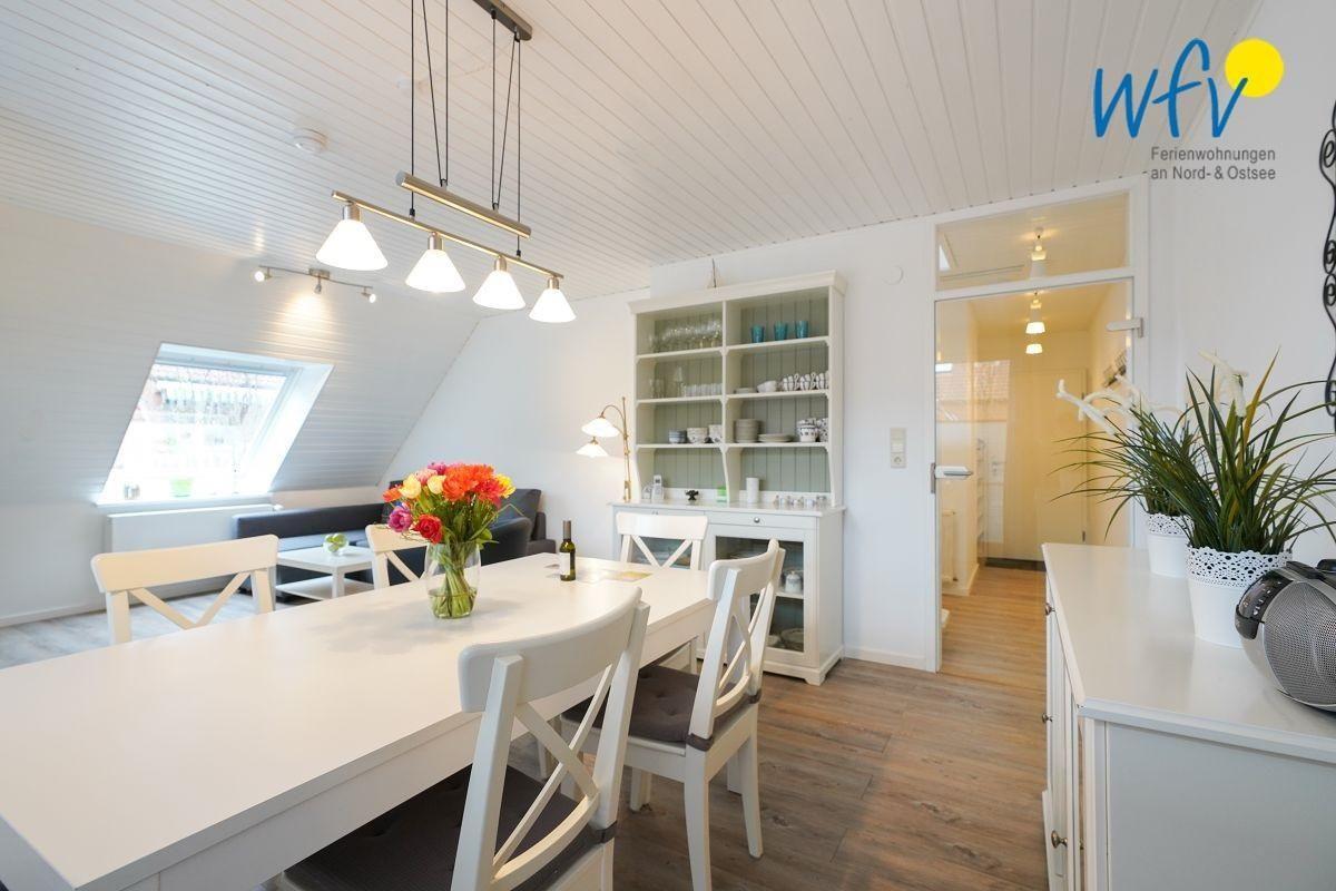 Der gemütliche Wohnraum ist mit einer Couchecke mit TV eingerichtet. So haben Sie auch am Abend die Möglichkeit, mit Ihren Lieben zusammenzusitzen. Auch an dem großen Esstisch ist jede Menge Platz für Spieleabende oder gemeinsame Mahlzeiten in Ihrem Urlaub auf Juist.
