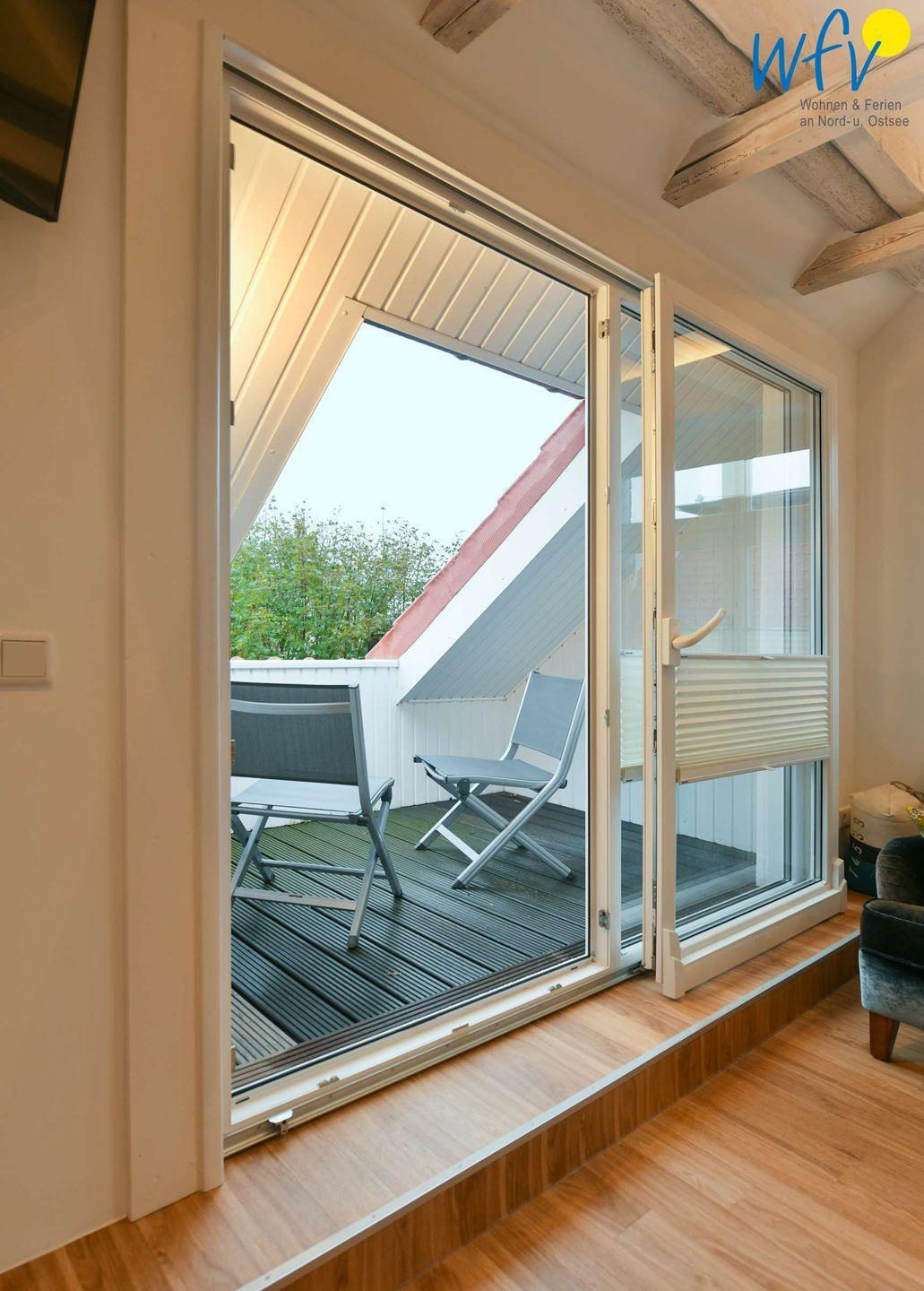 Sonne und frische Nordseeluft buchen Sie in unserer Ferienwohnung inklusive! Der möblierte Balkon lädt zum ausgiebigen Entspannen ein. Hier können Sie wunderbar ein gutes Buch lesen, sich die Sonne ins Gesicht scheinen lassen und das Urlaubsgefühl genießen. Durch Dachschrägen ist der Balkon teilweise überdacht und somit windgeschützt.