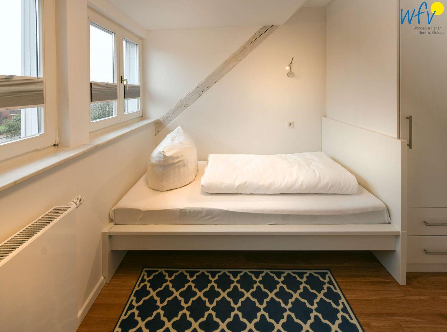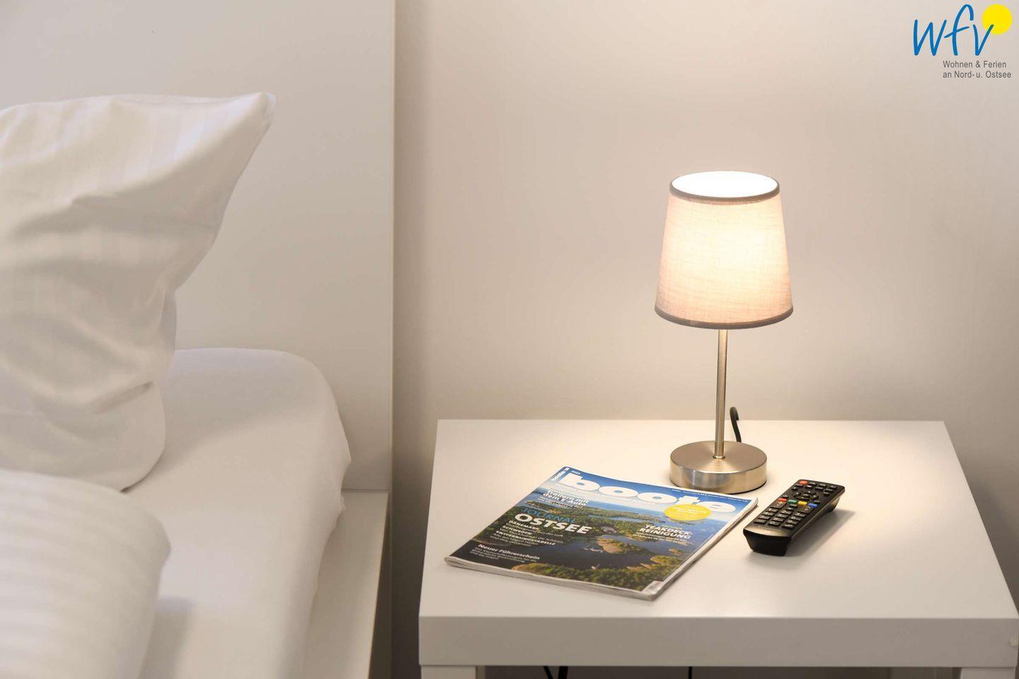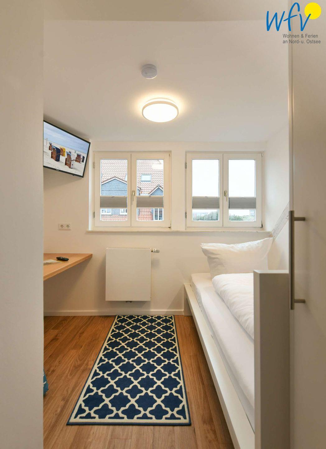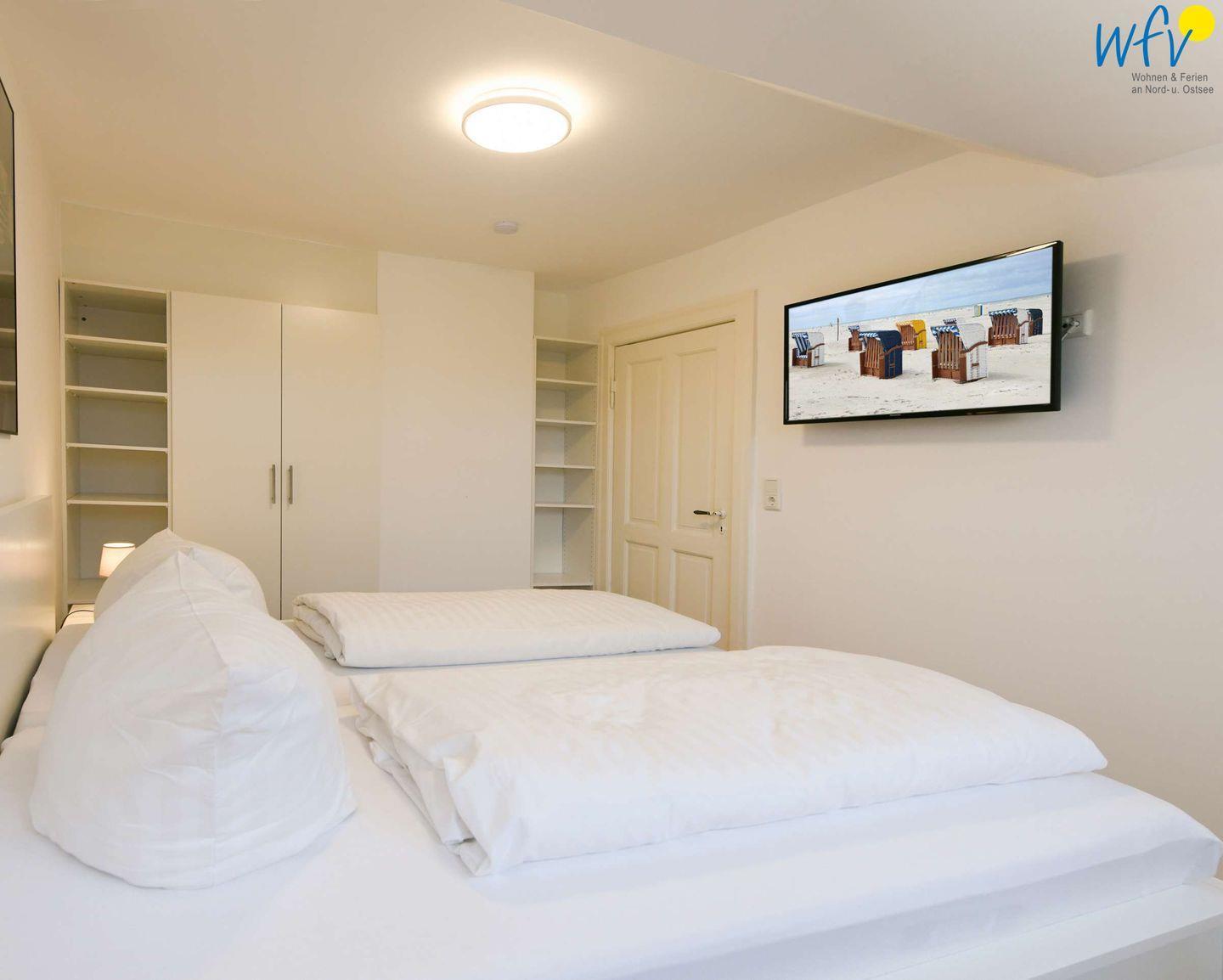 Wenn auf Juist die Sonne untergeht, warten in den zwei separaten Schlafzimmern komfortable Betten auf Sie. Der eine Raum ist mit einem Doppelbett (180 cm x 200 cm) ausgestattet, der andere mit einem Einzelbett (90 cm x 200 cm). Von beiden Betten aus können Sie gemütlich fernsehen.