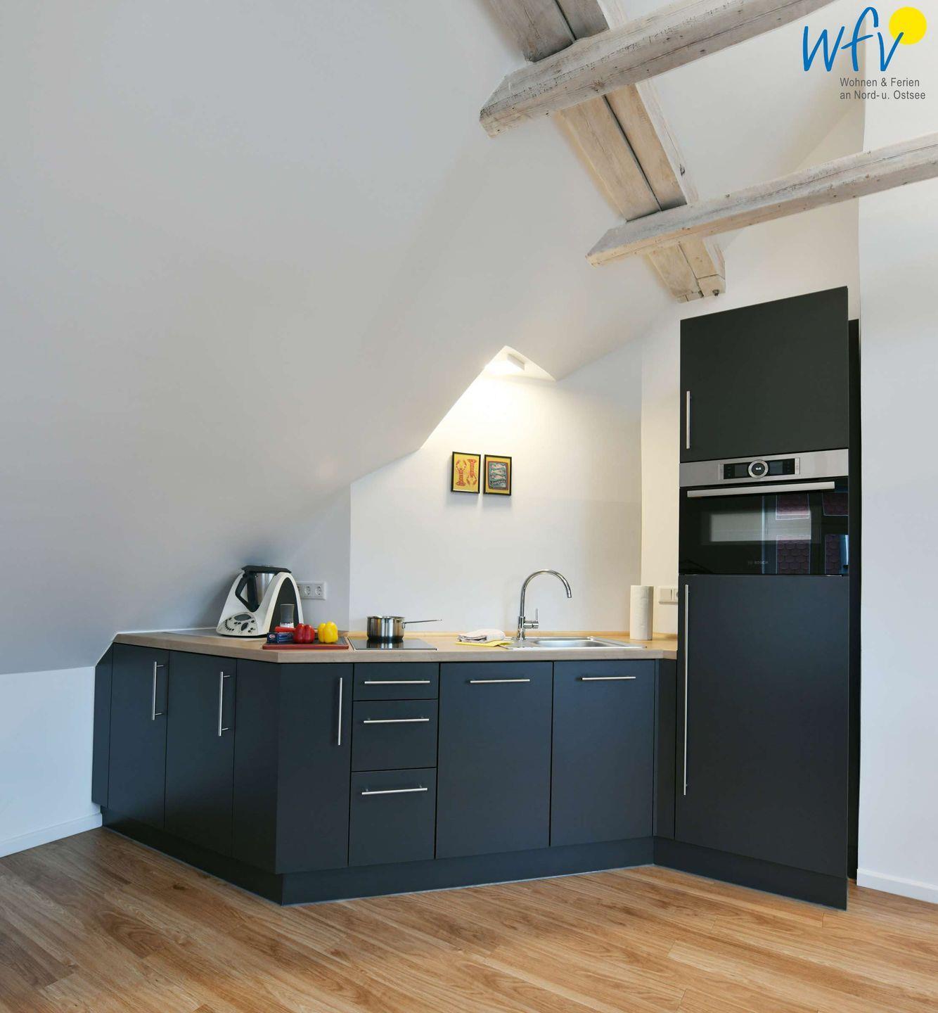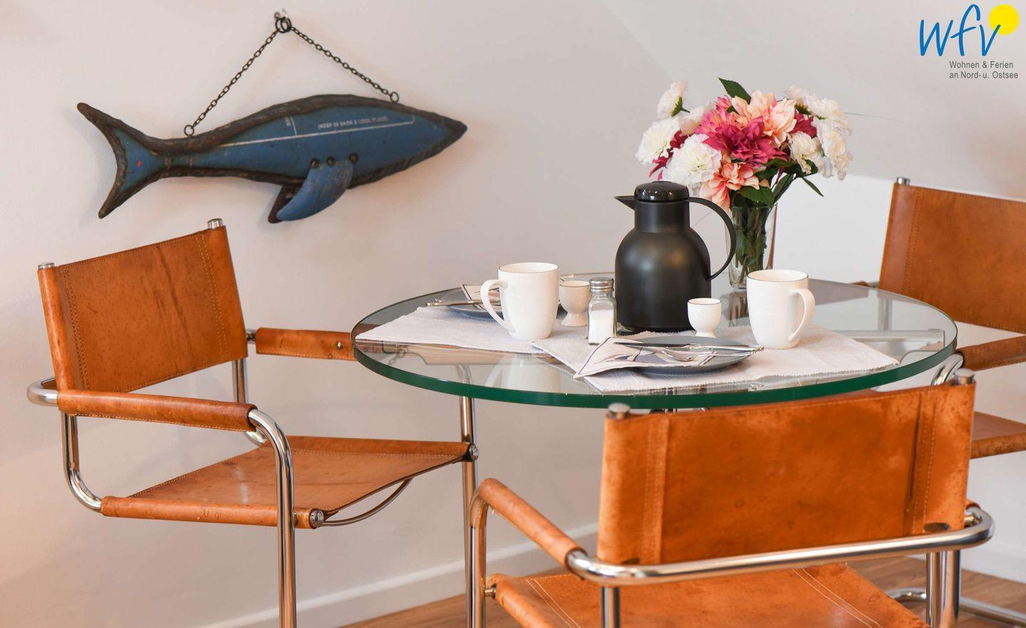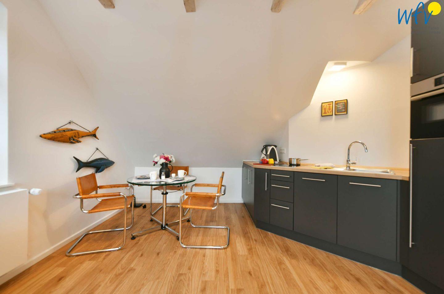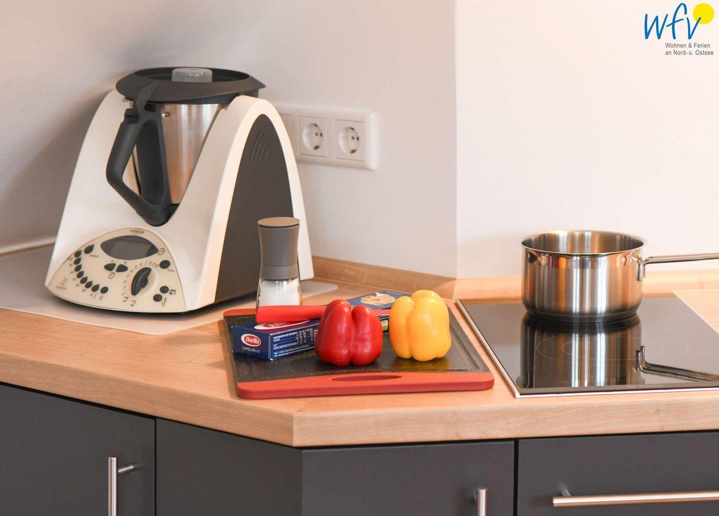 Warme Frühstücksbrötchen, kleine Snacks für den Ausflug oder leckere Mahlzeiten lassen sich schnell und einfach in der gut ausgestatteten Küchenzeile mit 2-Plattenherd, Backofen, Mikrowelle und Spülmaschine zubereiten. Als Highlight steht Ihnen hier ein moderner Thermomix zur Verfügung. Der hübsche Essplatz mit maritimen Accessoires sorgt für das entsprechende Nordseegefühl.