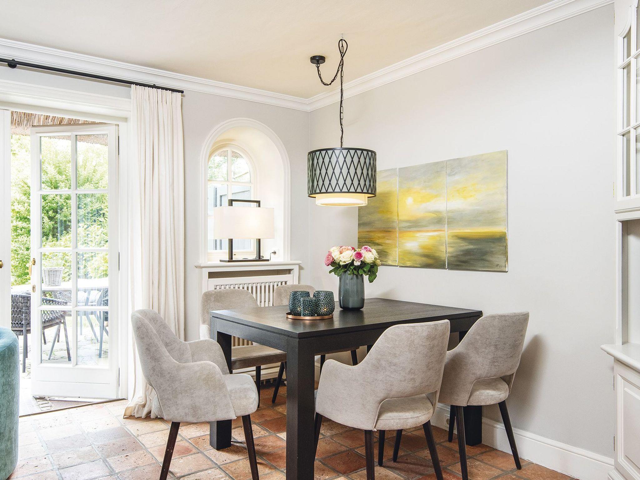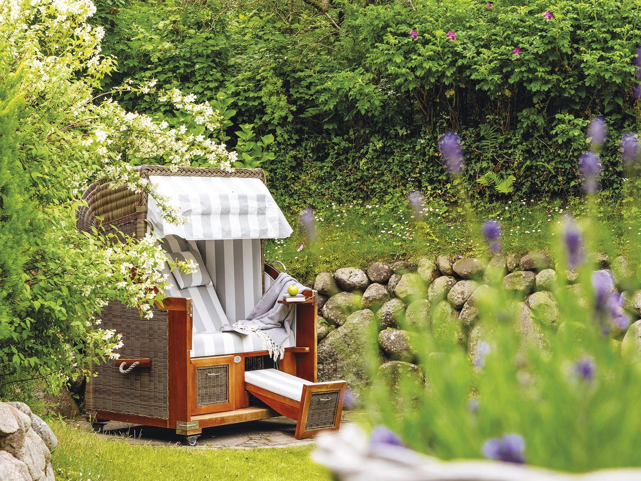 Gemütlichkeit trifft Stil - ein schönes Hausteil für Vier zentrumsnah und doch ruhig gelegen. Von der Haustür haben Sie sofort den Durchblick bis in den Garten mit Terrasse und Strandkorb zur Sonnenseite Süden. Das Erdgeschoss erfreut mit separater Küche und kombiniertem Wohn-/Essbereich in eleganten Naturtönen mit kleinen Farbakzenten mit gemütlichen Polstermöbeln, Kamin und schönem Esstisch für gemütliche Runden. Das helle Untergeschoss bietet ein Doppelschlafzimmer mit großen Einbauschränken und gleich nebenan ein Wannenbad. Ein großes Schlafzimmer mit Gartenblick und ein modernes Duschbad befinden sich im Obergeschoss. Das Quartier ist mit Terracotta- und Holzfußböden ausgestattet.