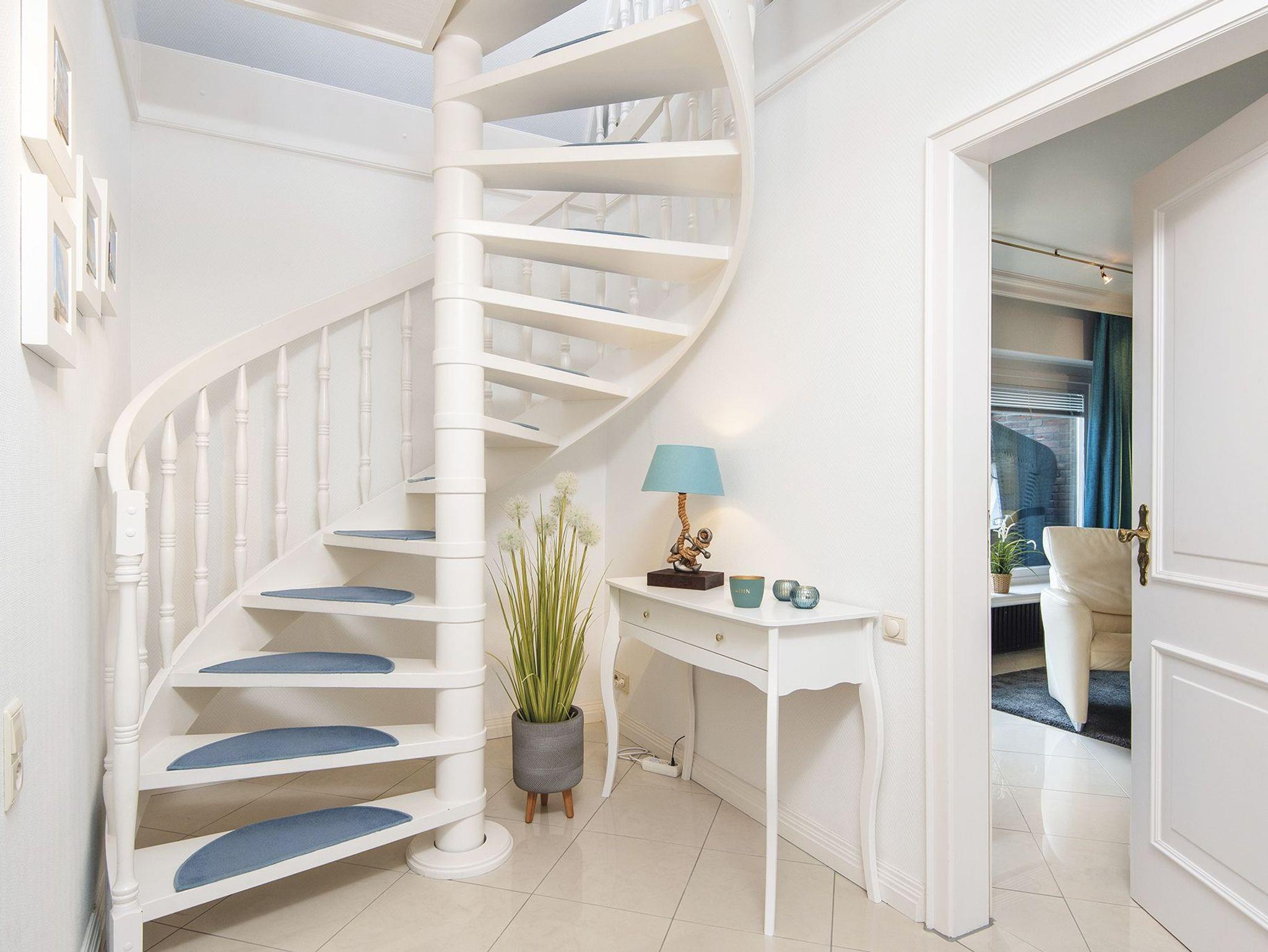 Dieses wohnliche Appartement liegt im 1. Obergeschoss eines hochwertigen Appartementhauses in der Kurhausstraße. Über einen kleinen Flur erreichen Sie den gefliesten Wohnbereich, welcher sich in eine kleine offene Küche mit Essplatz für Vier, sowie ein Wohnzimmer mit Balkon samt Strandkorb und seitlichem Meerblick aufteilt. Das mit Teppichboden ausgelegte Obergeschoss erreichen Sie über eine offene Wendeltreppe. Hier hält das Quartier ein Doppelschafzimmer nebst durch einen Raumtrenner separierten Arbeitsplatz, ein Bad mit kleiner Wanne und ein Einzelschlafzimmer mit kleinem Duschbad en suite für Sie bereit. Ein funktionales Raumwunder für bis zu drei Gäste in bester Lage Kampens.