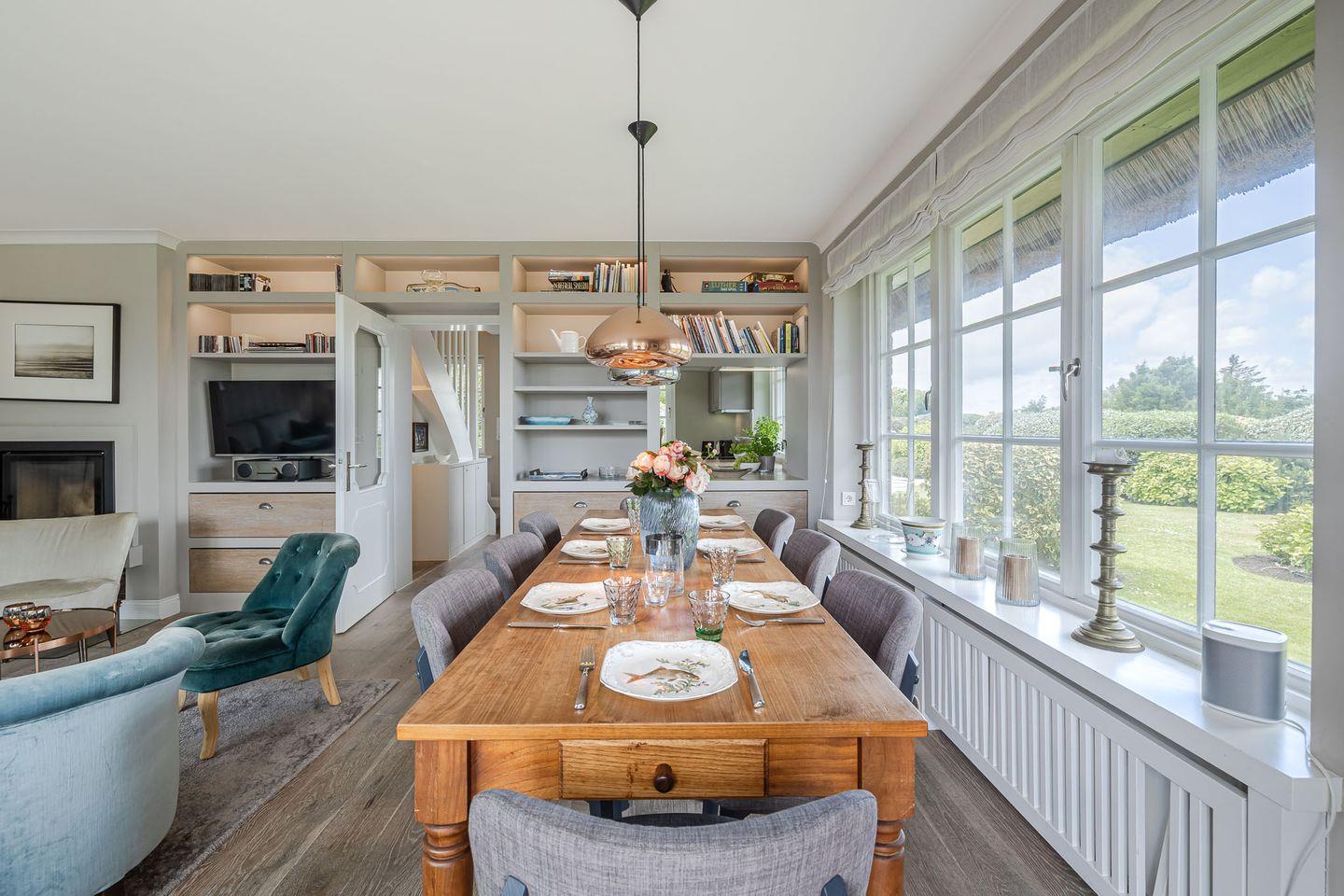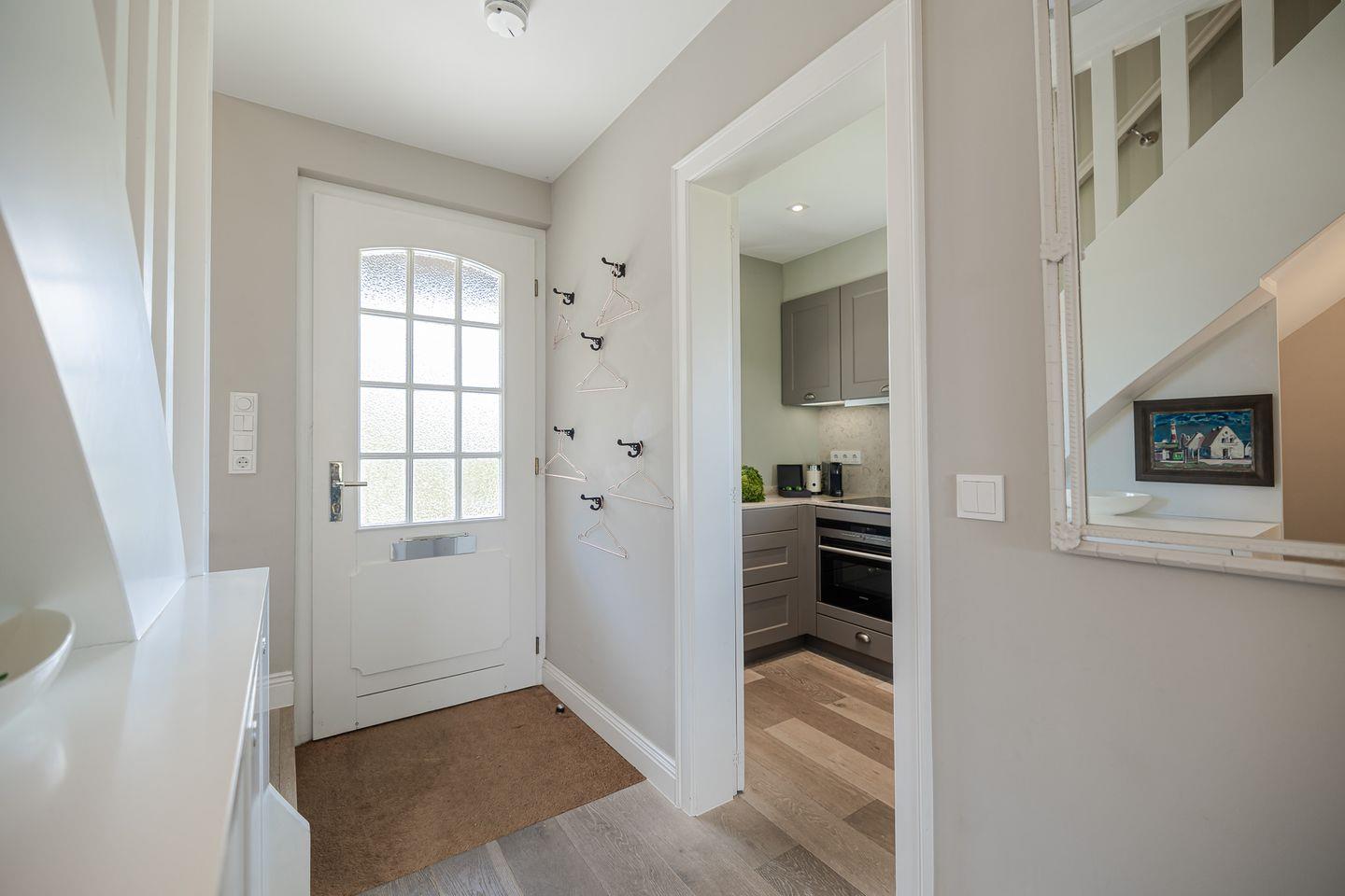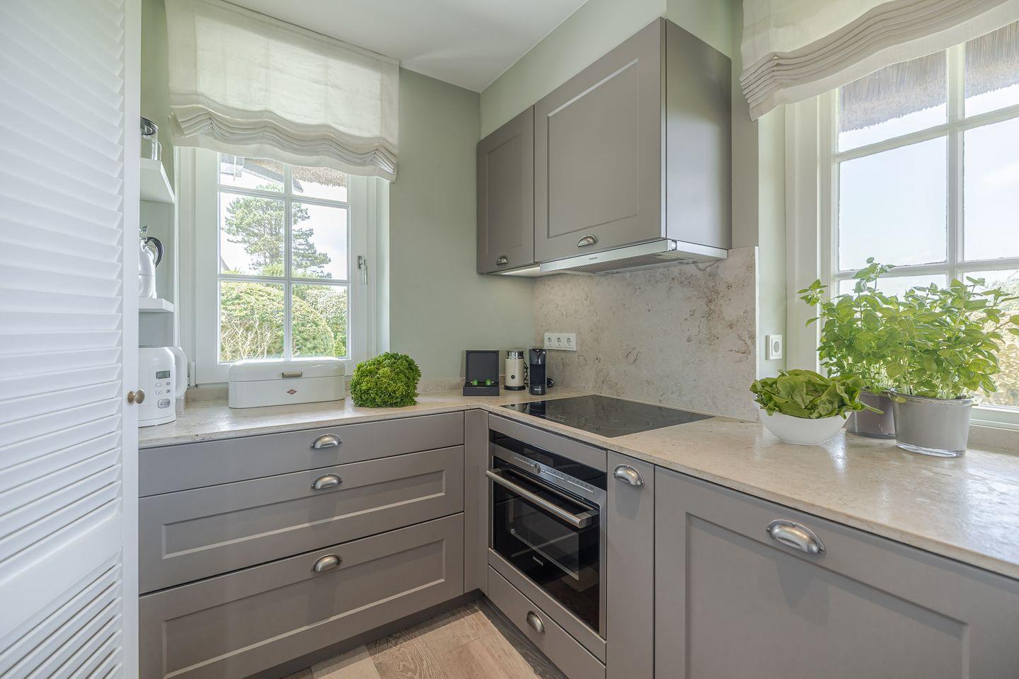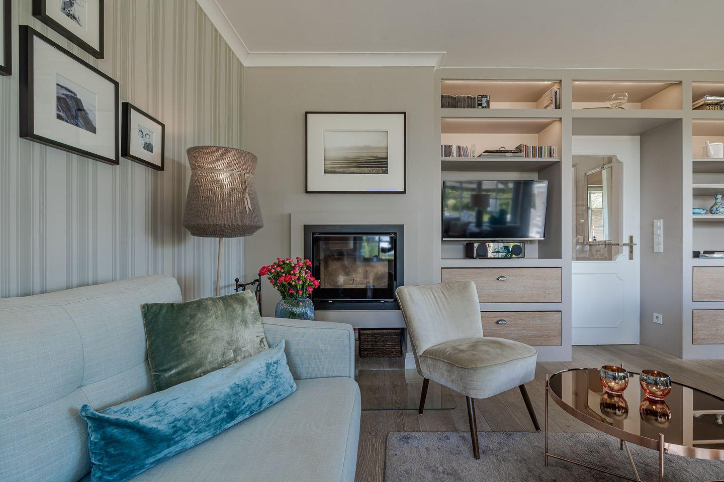 Das Herzstück des Hauses ist das gemütliche Wohn- und Esszimmer, in dem Sie beim Blick in den Garten und das Kampener Watt die Seele baumeln lassen können. Auf hochwertigen Polstermöbeln entspannen Sie sich am Holzkamin, während der stilvolle Esstisch mit Platz für alle zu geselligen Stunden einlädt. Die große Durchreiche zur separaten Küche macht das Kochen zum Vergnügen. Diese ist mit allem ausgestattet, was Sie für eine mühelose Selbstversorgung im Urlaub benötigen – inklusive Nespresso- und Filterkaffeemaschine.