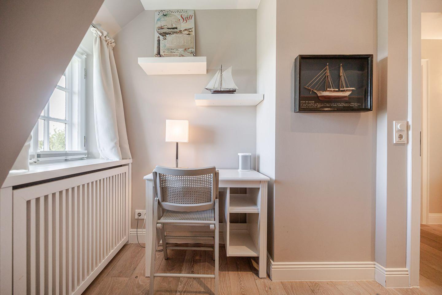 Im Obergeschoss erwartet Sie ein weiteres gemütliches Schlafzimmer mit Boxspringbett. Zusätzlich gibt es ein kleines, im Vintagestil gehaltenes Wohn-/Arbeitszimmer und ein großes Badezimmer mit Badewanne – ideal für entspannte Momente nach einem langen Tag.