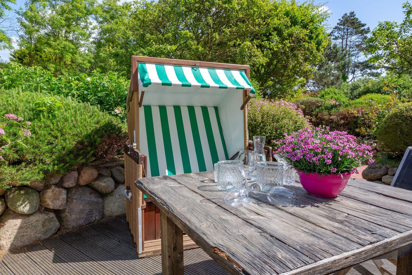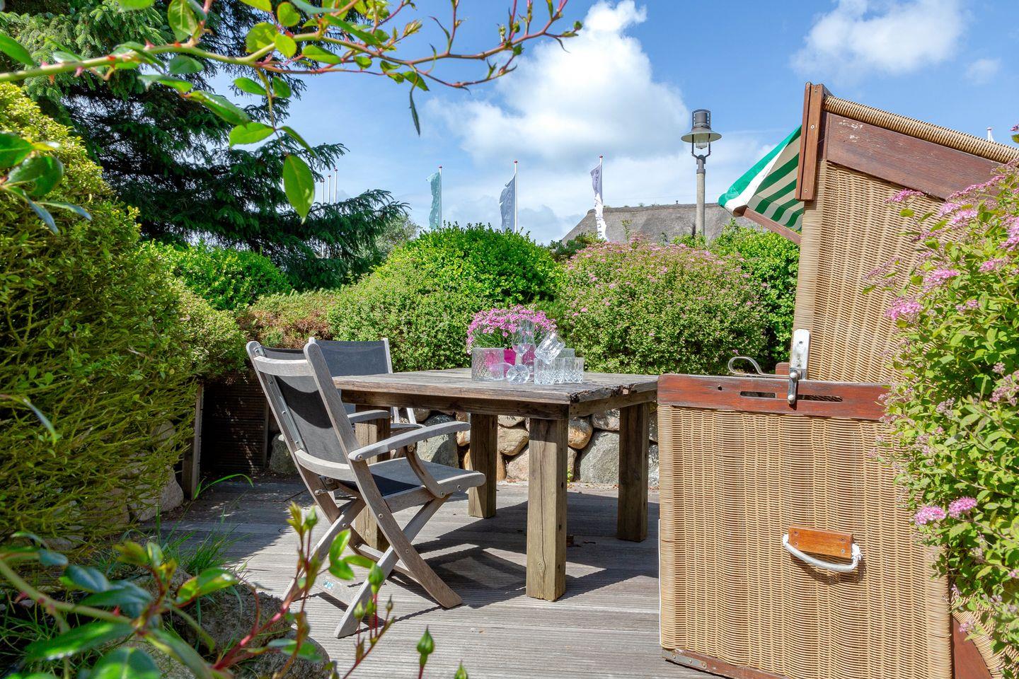 Zur Wohnung gehört eine eigene Terrasse mit Gartenmöbeln. Von April bis Oktober steht Ihnen zusätzlich ein Strandkorb zur Verfügung – ideal zum Entspannen im Freien.
