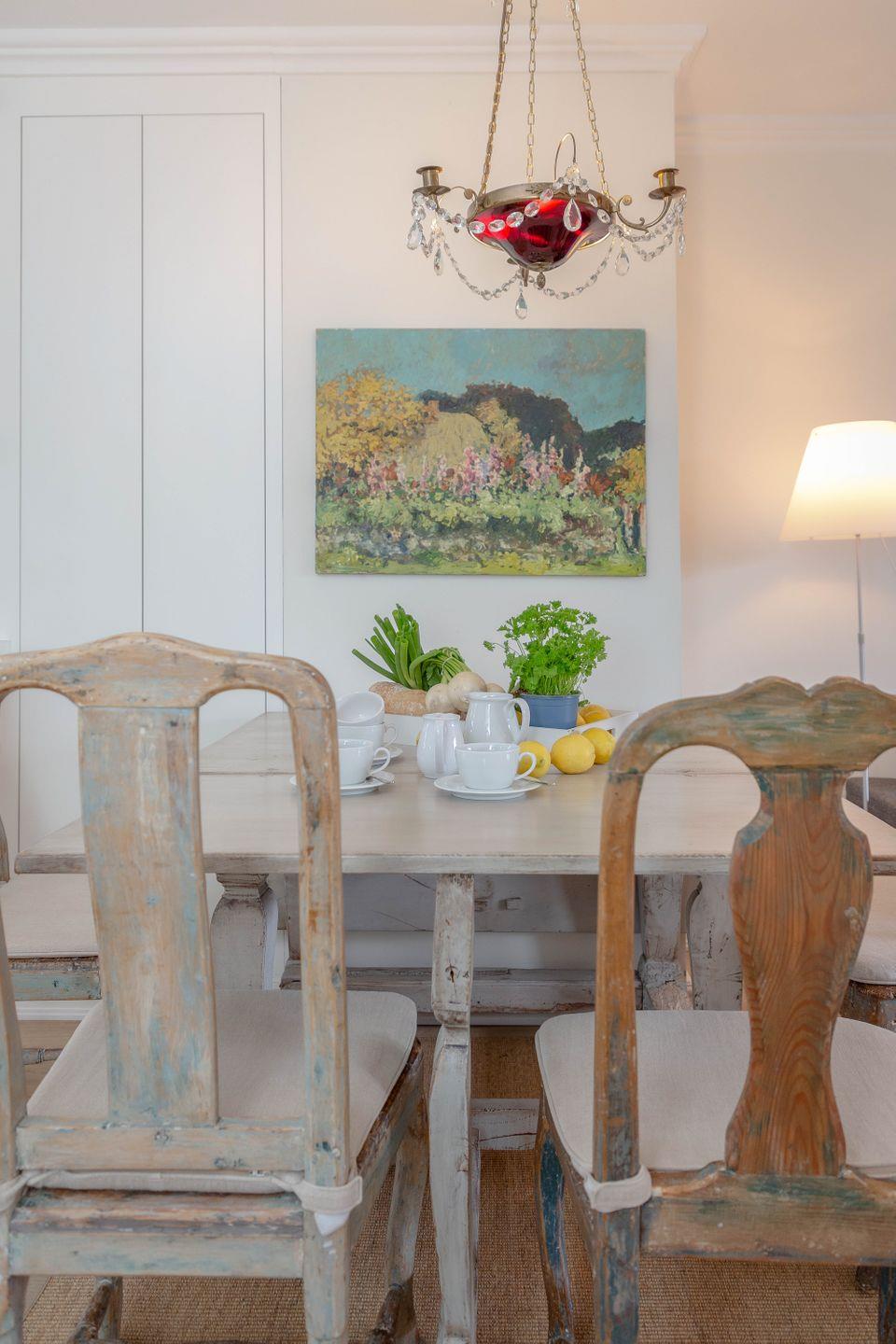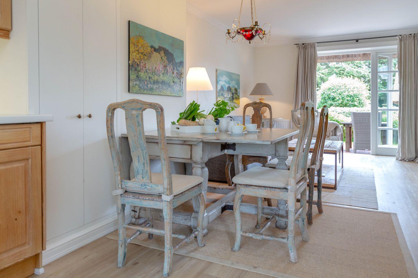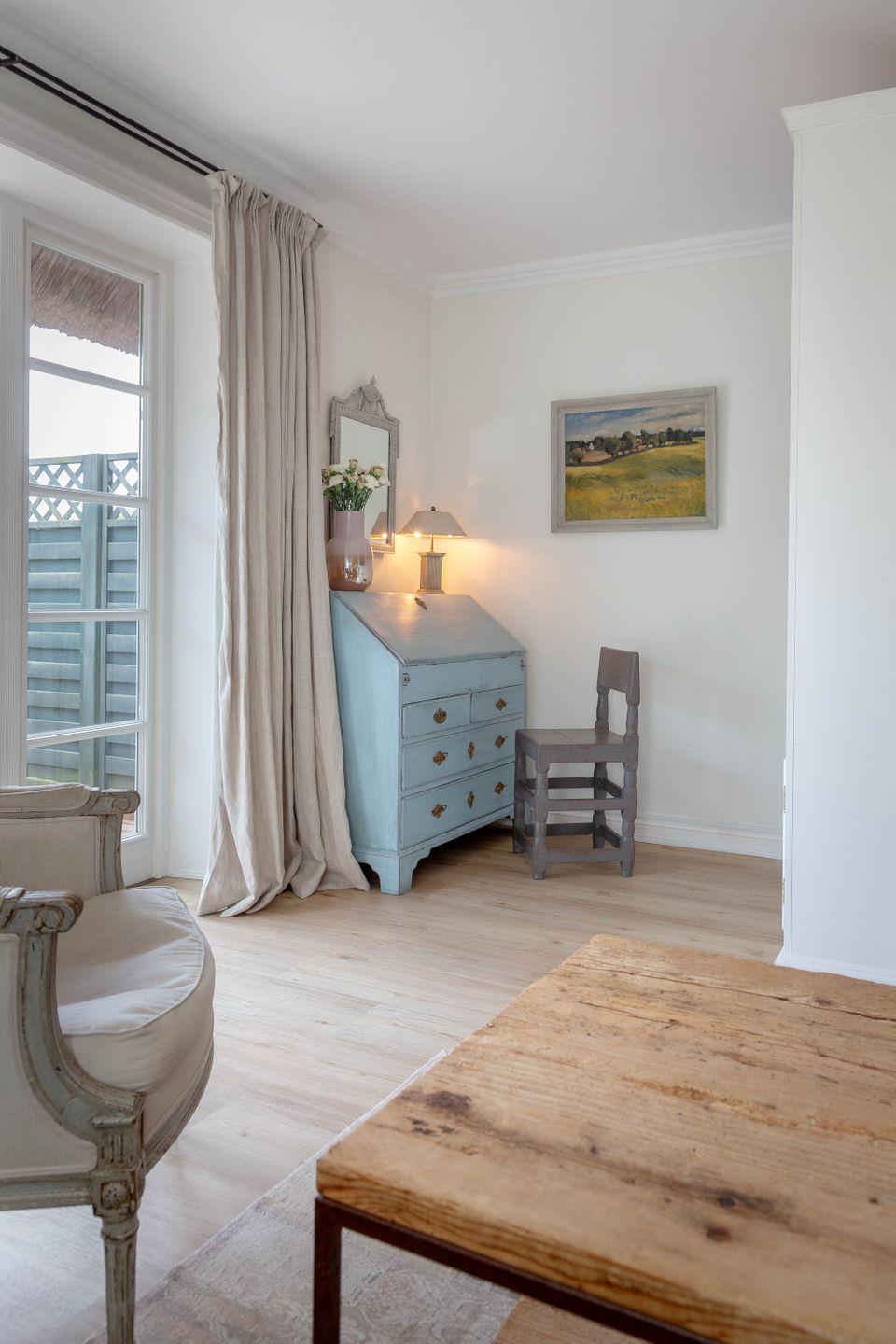 Die weiß gestrichenen alten Holzbalken sowie der gelungene Mix mit Antiquitäten schaffen auf Anhieb eine heimelige Atmosphäre.