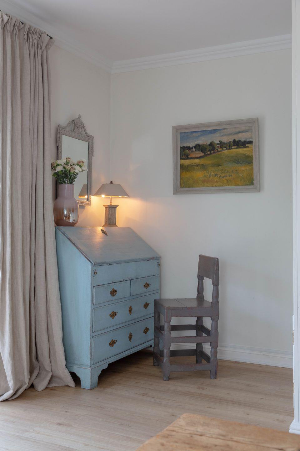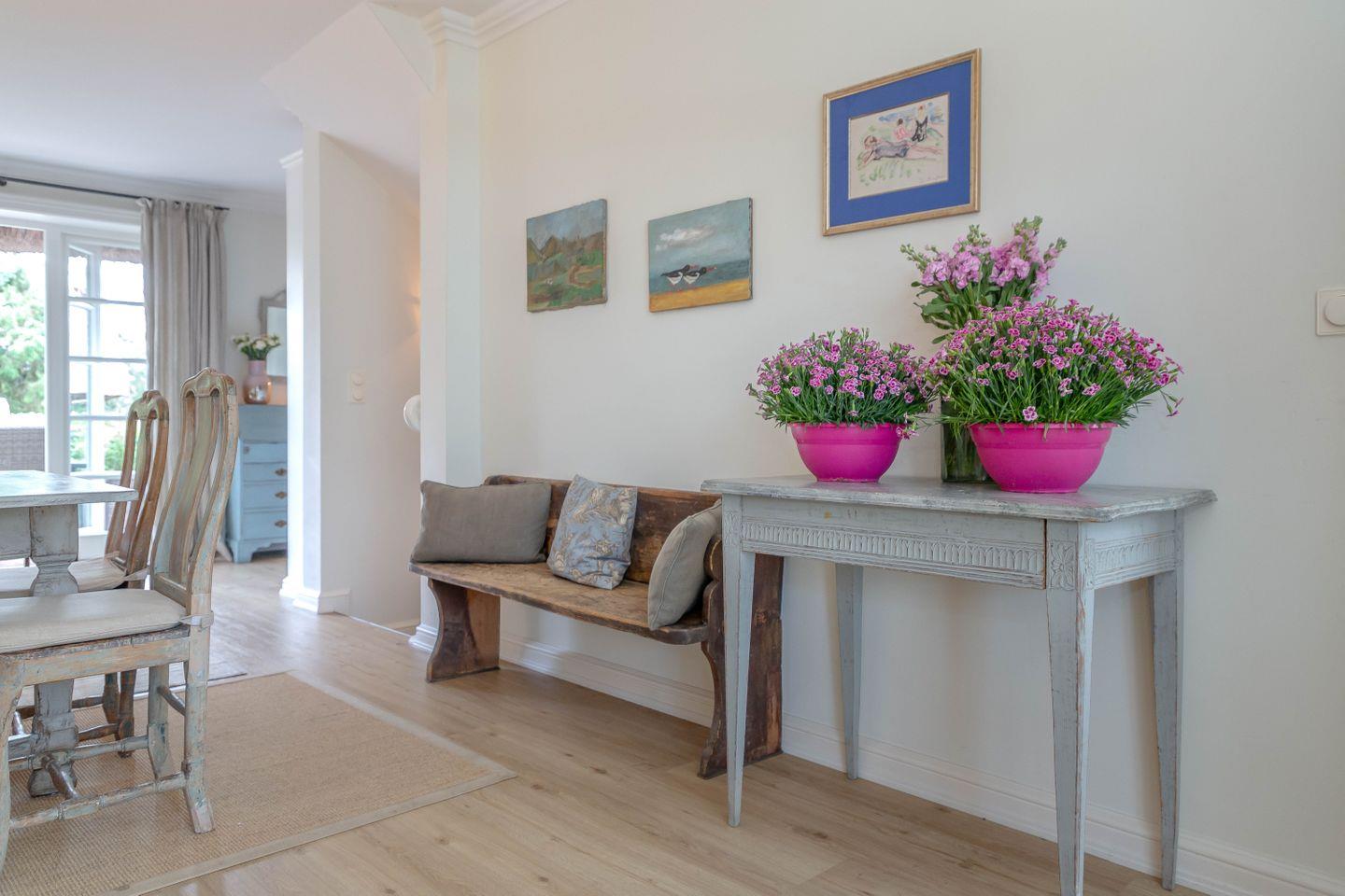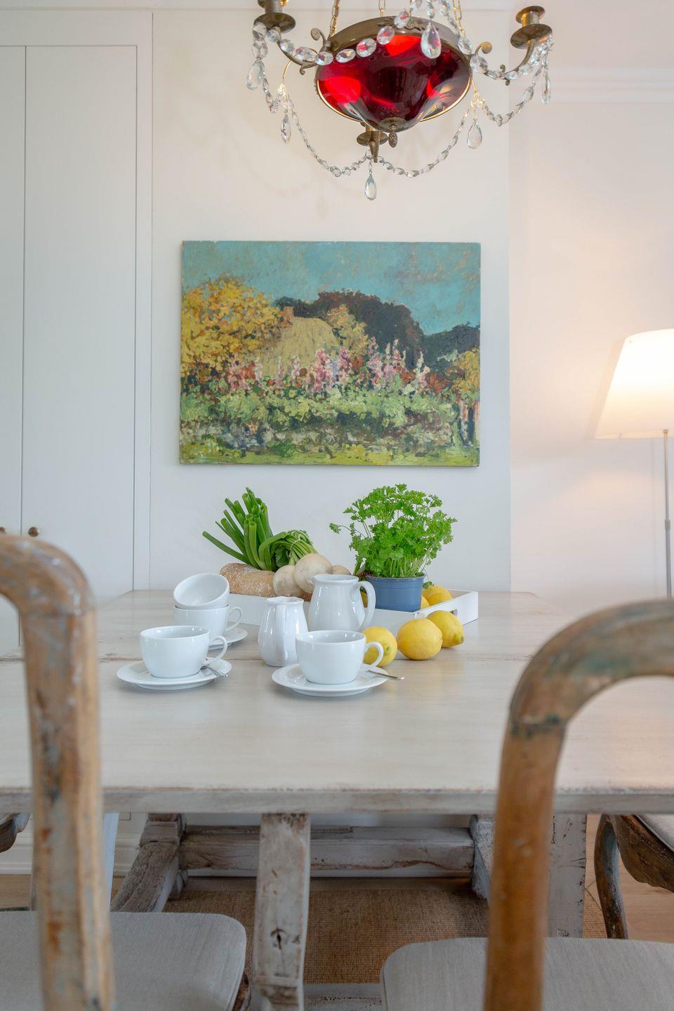 Die weiß gestrichenen alten Holzbalken sowie der gelungene Mix mit Antiquitäten schaffen auf Anhieb eine heimelige Atmosphäre.