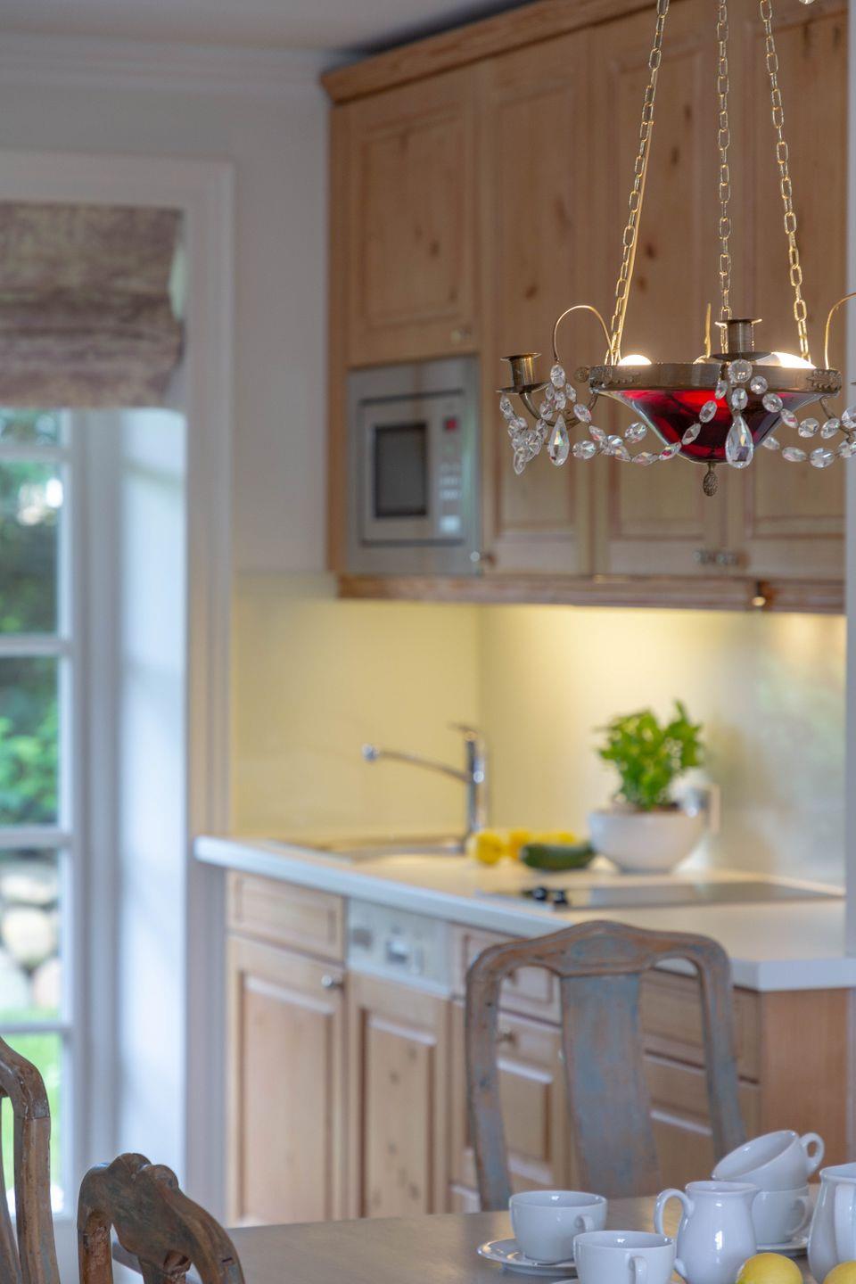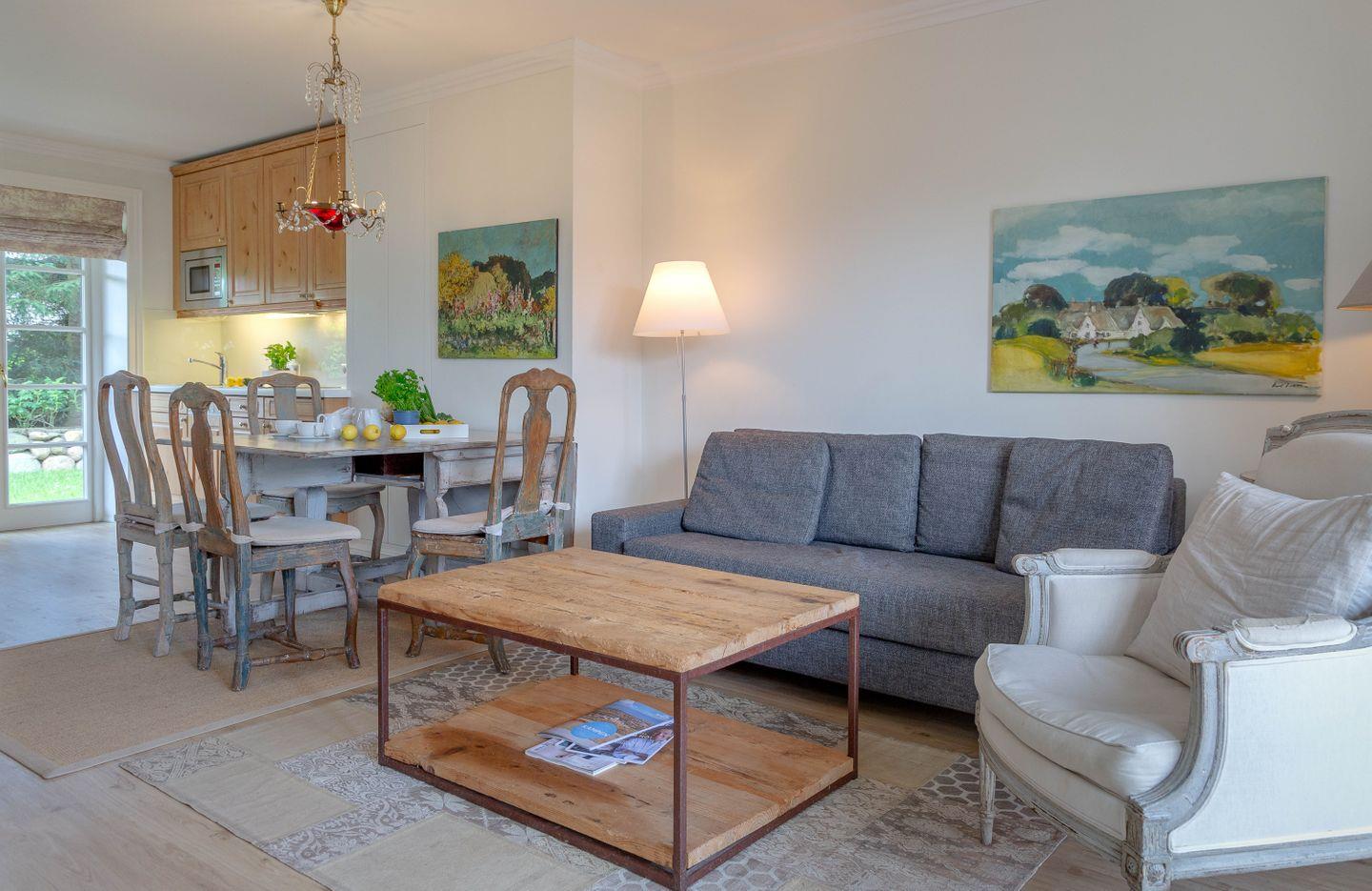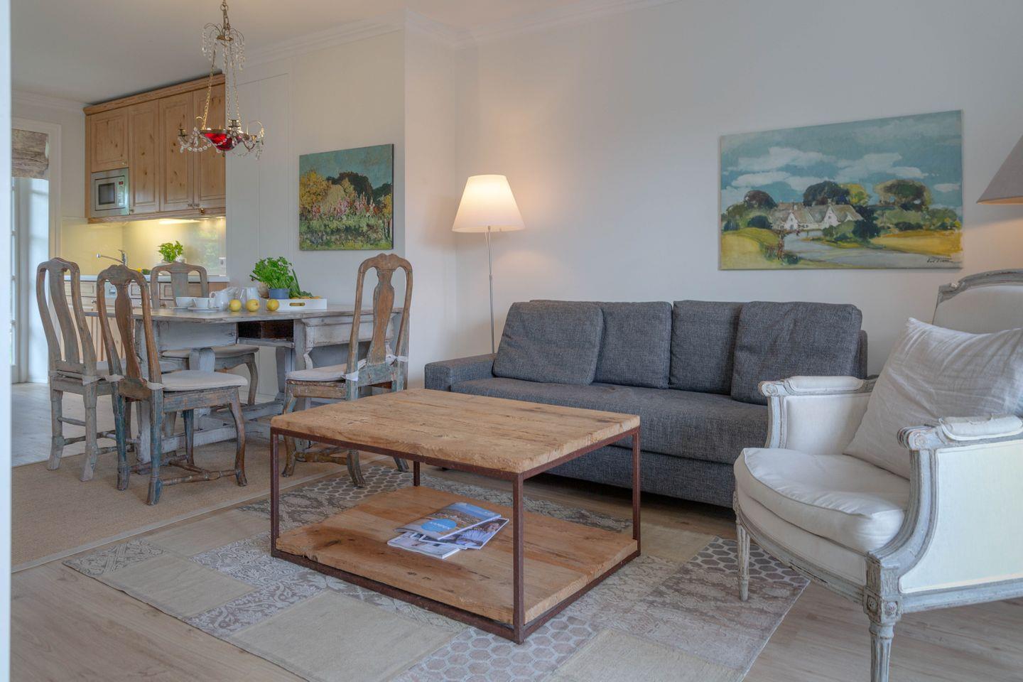 Es erwartet Sie ein stilvoll eingerichteter Wohnraum mit voll ausgestatteter Küchenzeile.