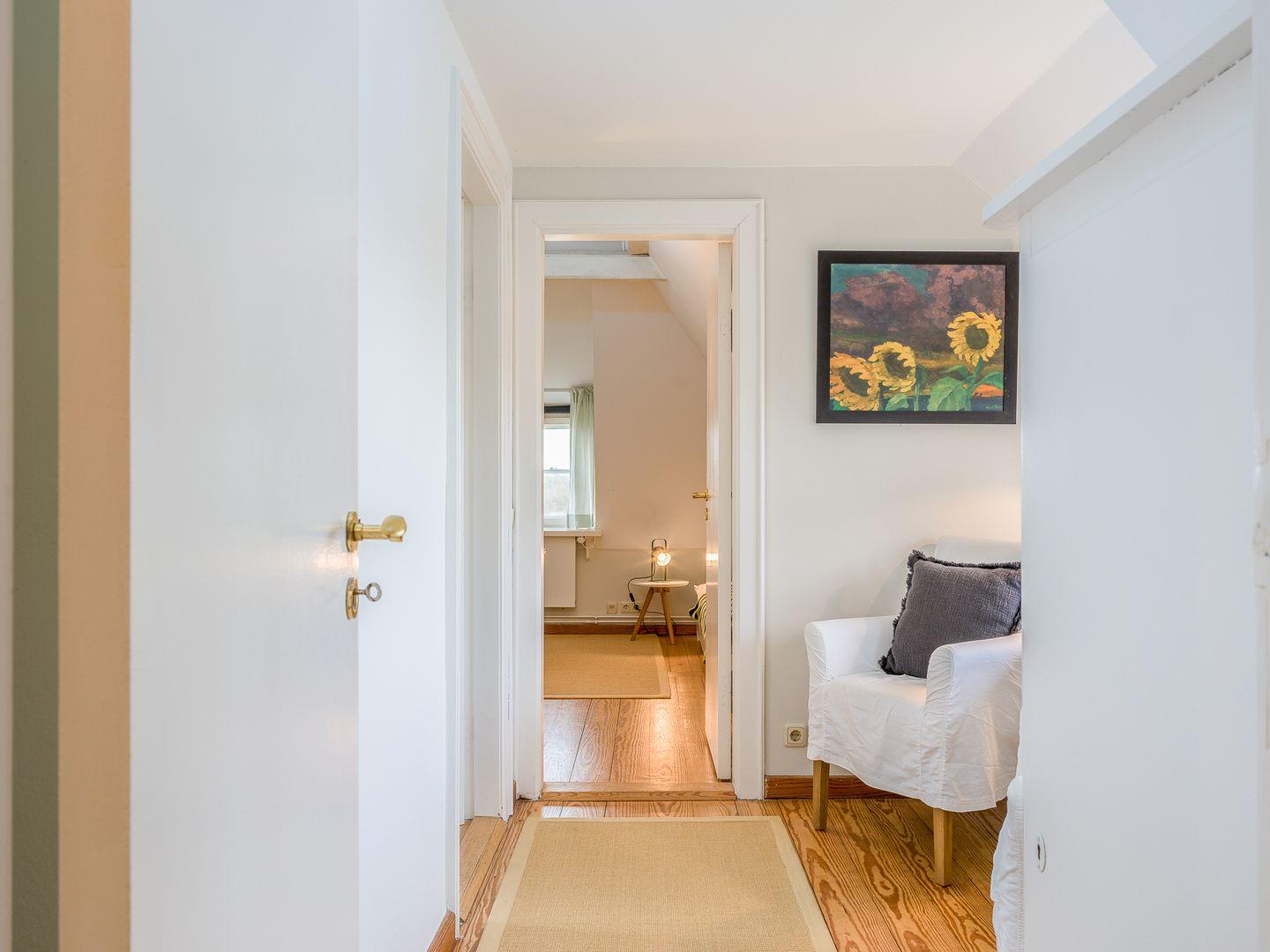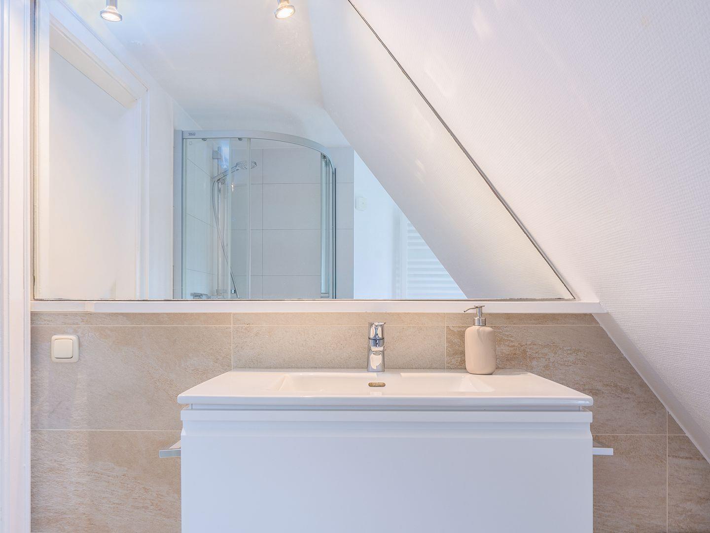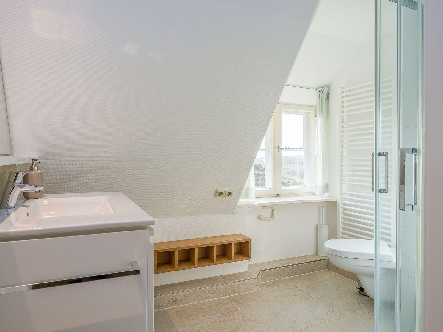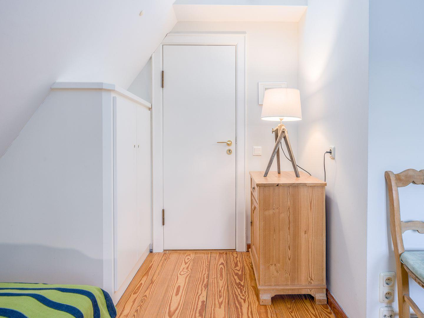 Hinter einer Schiebetür versteckt sich die moderne Küche, die mit allem Nötigen ausgestattet ist. Zusätzlich befindet sich noch ein Gäste-WC im Erdgeschoss. Eine Treppe höher geht es zu den beiden Schlafzimmern, von denen eines mit einem Doppelbett (140x200cm) sowie eine weiteres mit zwei Einzelbetten (90x200cm) ausgestattet ist. Im Obergeschoss befindet sich auch das geräumige Duschbad mit Tageslicht.