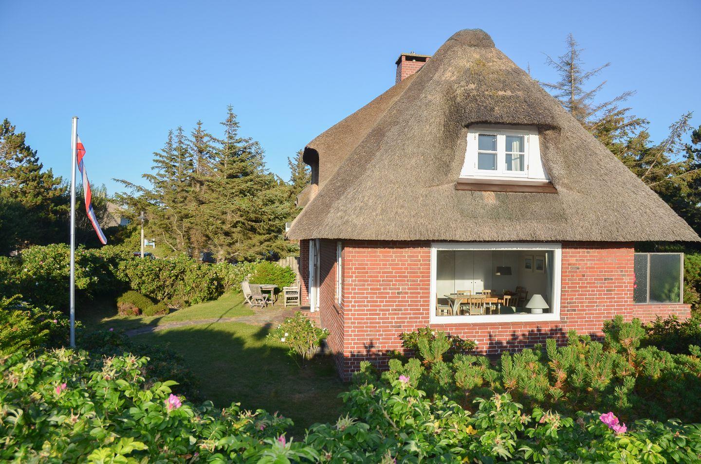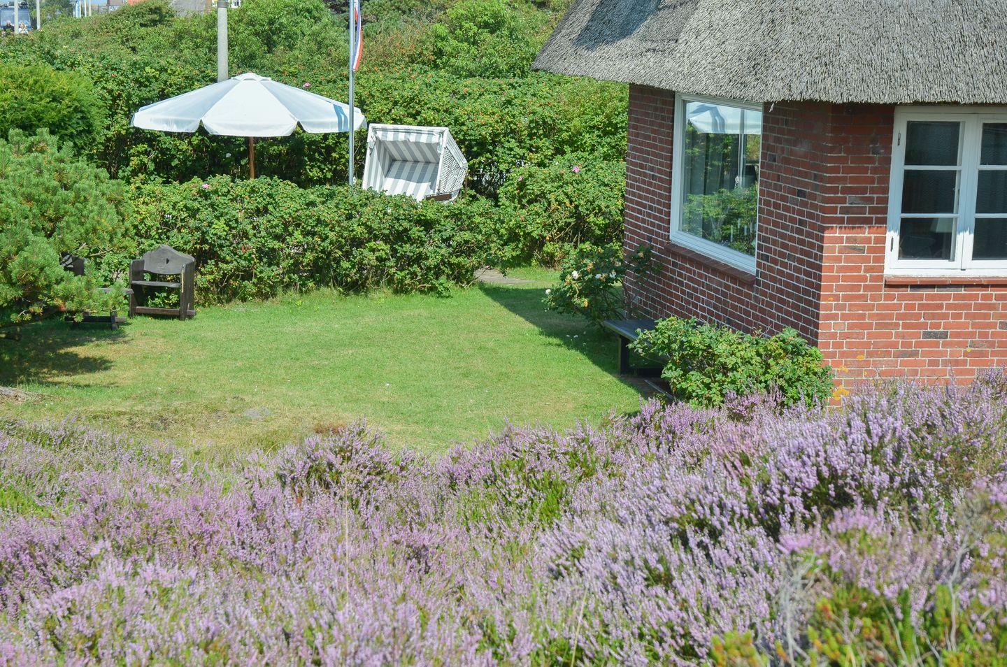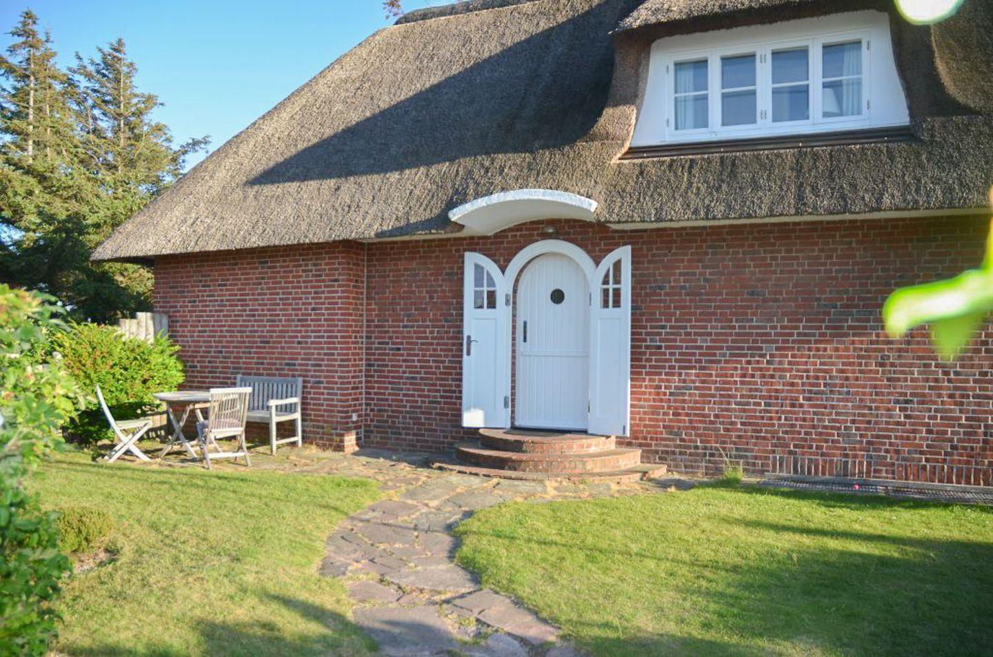 Gemütliches Reetdachhaus in Kampen mit Garten, Kamin und Blick zu den Dünen – ideal für einen entspannten Urlaub auf Sylt.