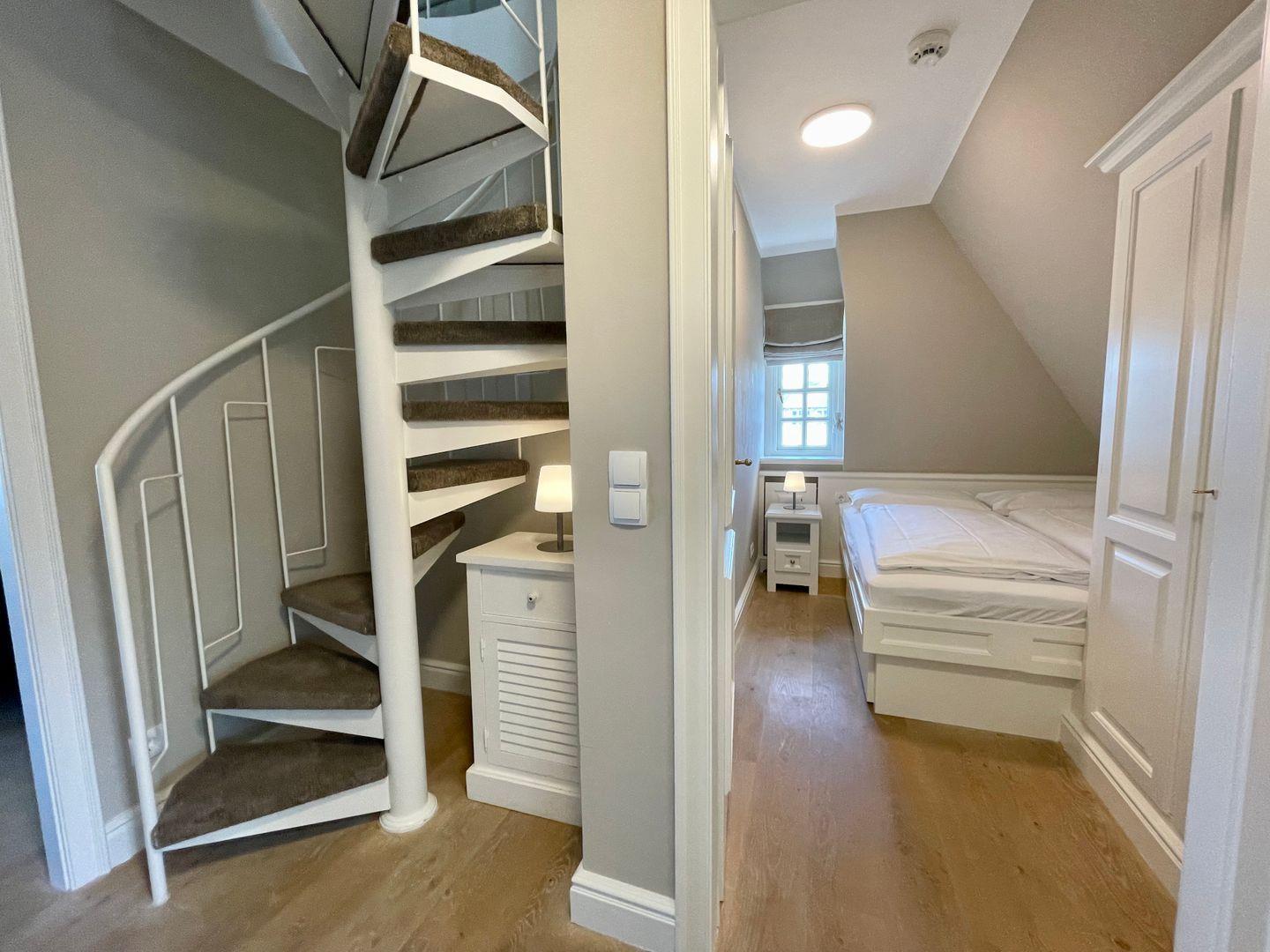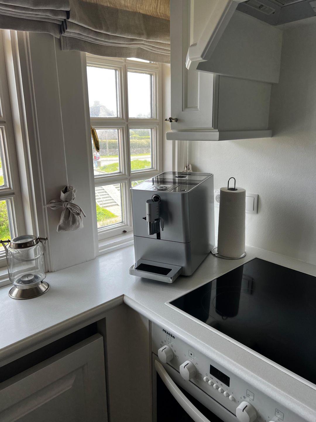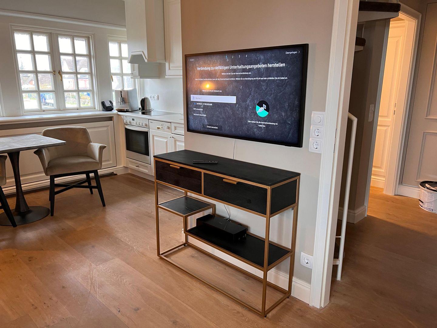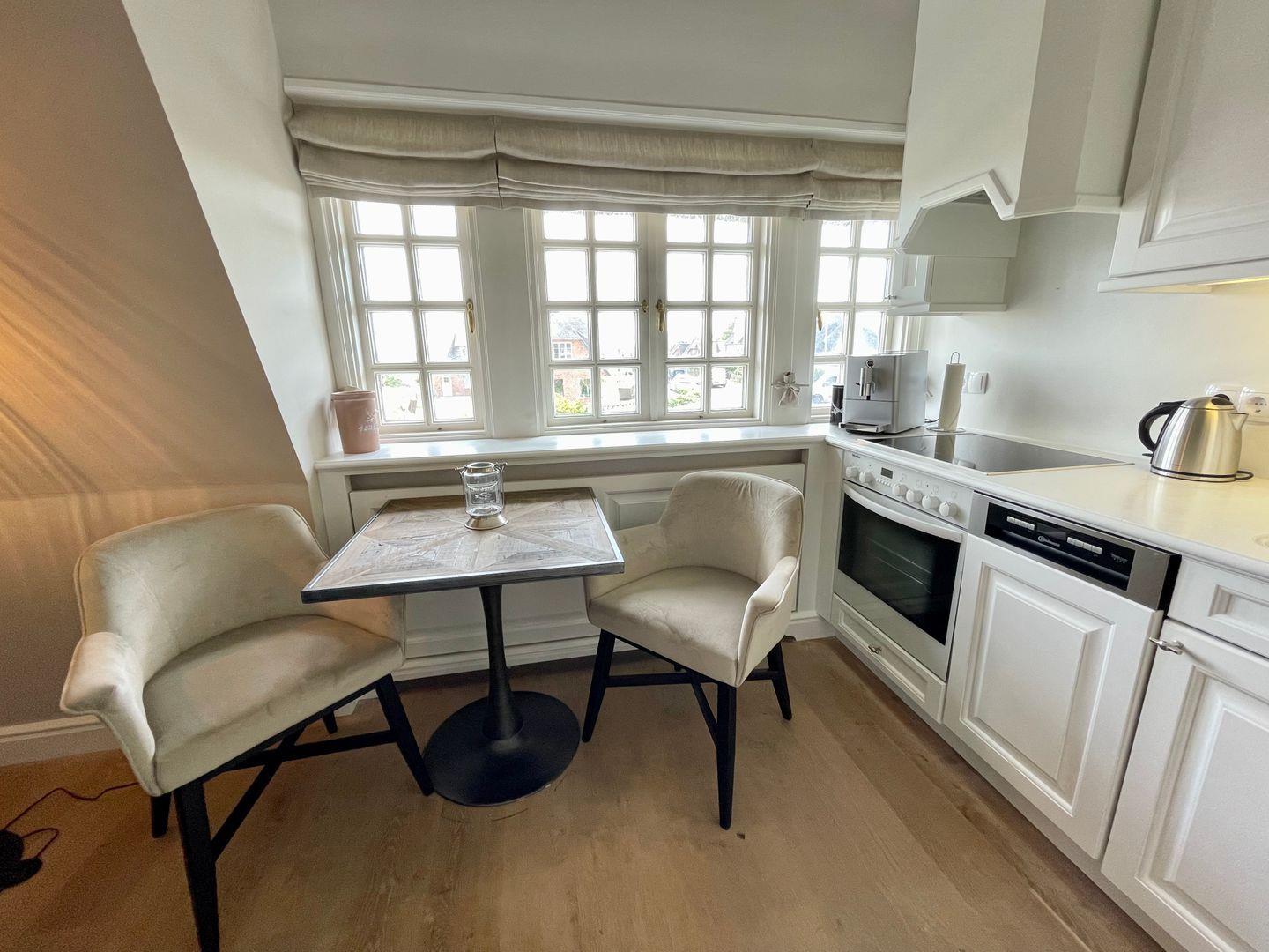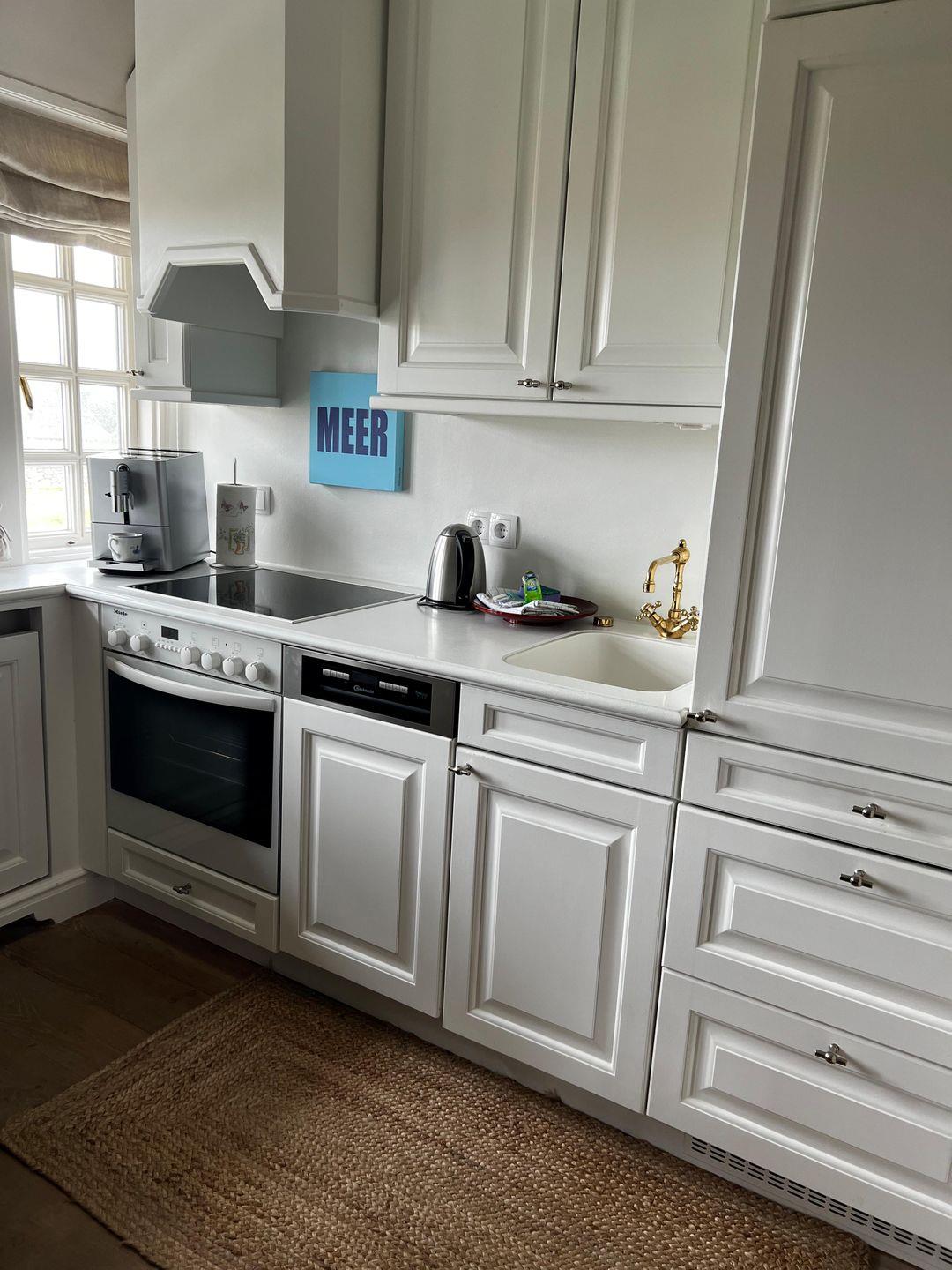 Das etwa 55 m² große Appartement verteilt sich geschickt und komfortabel auf zwei Etagen. Der einladende Wohn- und Essbereich bildet das Herzstück der Unterkunft: Helle, moderne Möbel, ein gemütliches Sofa, ein Esstisch sowie ein romantischer Kamin schaffen eine Atmosphäre, in der man sich sofort wohlfühlt. Durch die großen Fenster genießen Sie einen herrlichen Blick auf die Nordsee – perfekt für entspannte Stunden, einen Sundowner am Abend oder gemütliche Lesemomente. Die offen integrierte Küchenzeile ist großzügig und funktional gestaltet. Sie bietet alles, was man für einen komfortablen Aufenthalt benötigt: Backofen, Ceranfeld, Geschirrspüler, Kühlschrank mit Gefrierfach, Kaffeemaschine, Kaffeevollautomaten, Wasserkocher, Toaster sowie alle wichtigen Küchenutensilien. Ob ein schnelles Frühstück oder ein liebevoll gekochtes Abendessen – hier bleiben keine Wünsche offen.