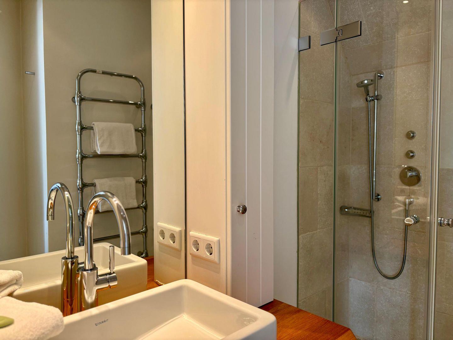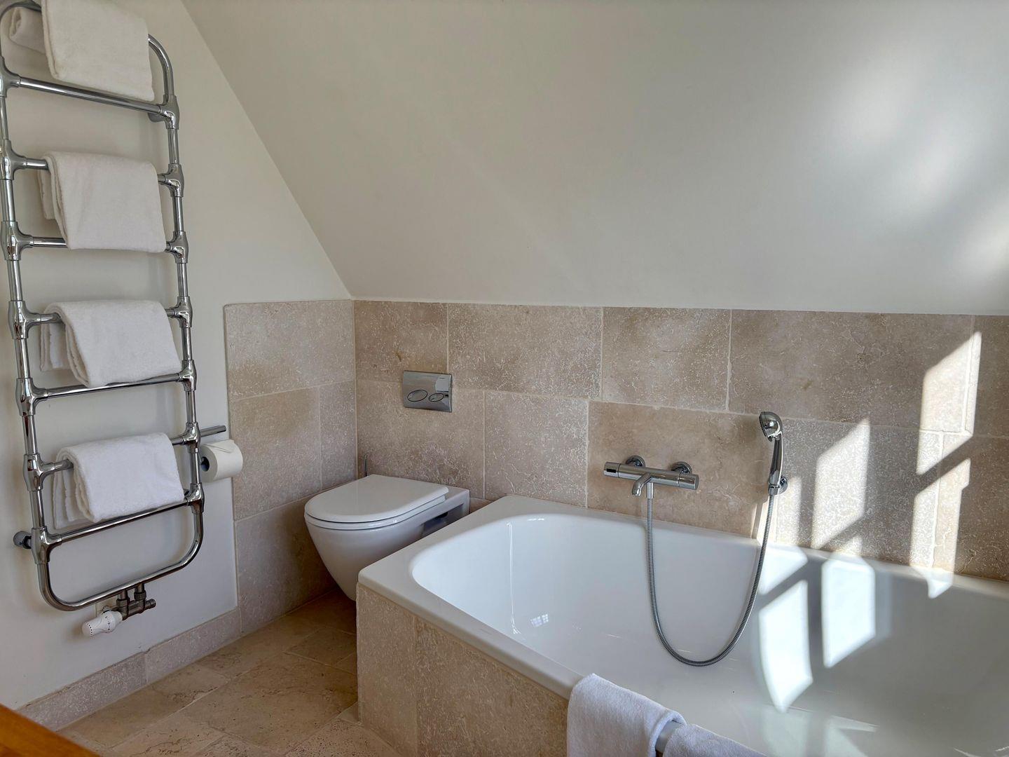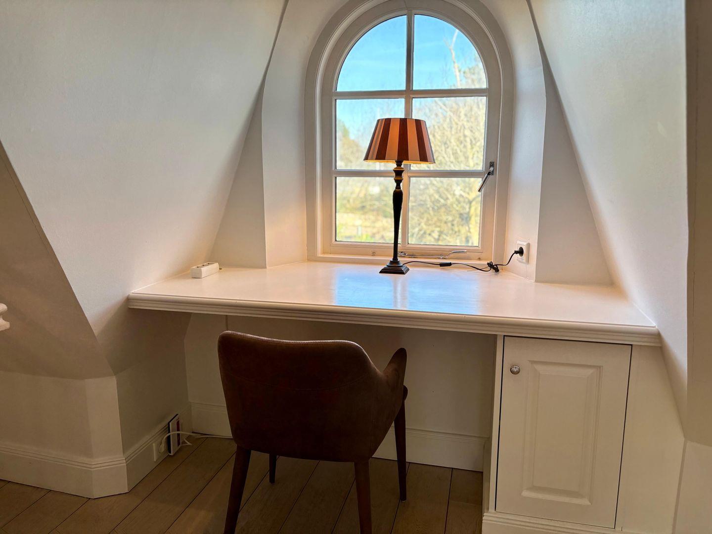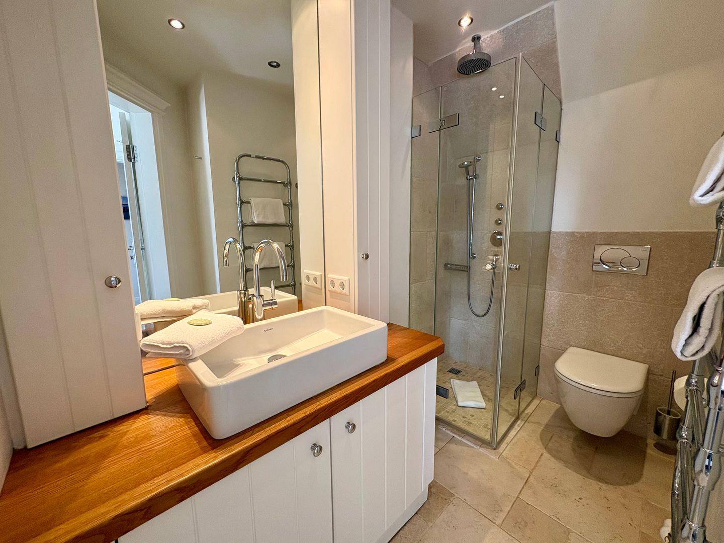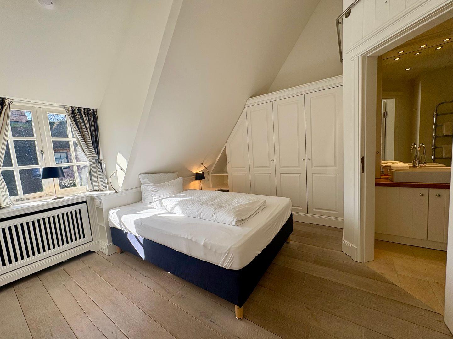 Im Obergeschoss erwartet Sie eine kleine Galerie mit Arbeitsplatz – ideal zum Lesen oder Arbeiten – sowie ein verwunschenes, leicht verwinkeltes Doppelschlafzimmer mit großzügigem Einbauschrank und Wannenbad. Ein weiteres Schlafzimmer mit kleinem Doppelbett (160cm breit) und eigenem Duschbad rundet diese Etage ab.