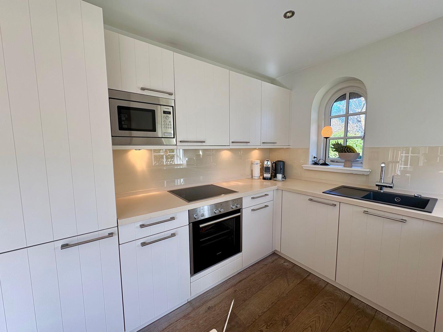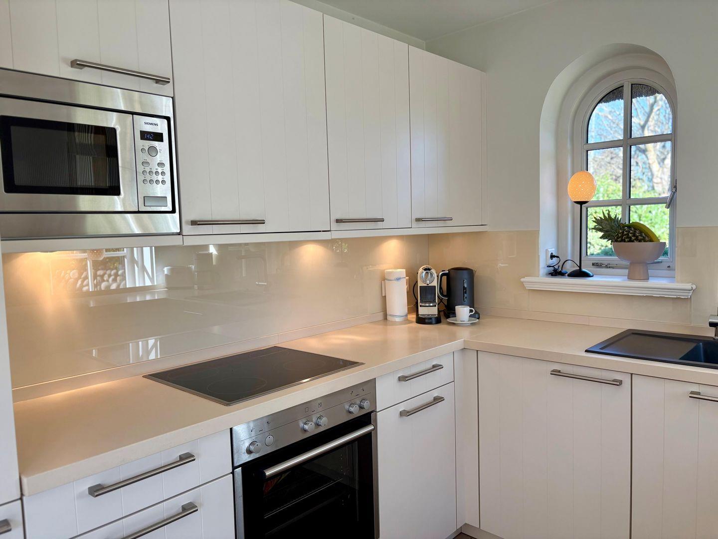 Die offene, modern ausgestattete Küche ist das Herzstück des Hauses. Der großzügige, lichtdurchflutete Raum mit großen Fenstern sorgt nicht nur für eine freundliche Atmosphäre, sondern bietet auch direkten Zugang zur Terrasse – ideal für Frühstück im Freien oder gesellige Sommerabende. Der große Esstisch für bis zu acht Personen lädt zu gemeinsamen Kochabenden, ausgiebigen Mahlzeiten und gemütlichem Beisammensein ein. Hochwertige Geräte, großzügige Arbeitsflächen und liebevolle Details machen das Kochen hier zum echten Vergnügen.