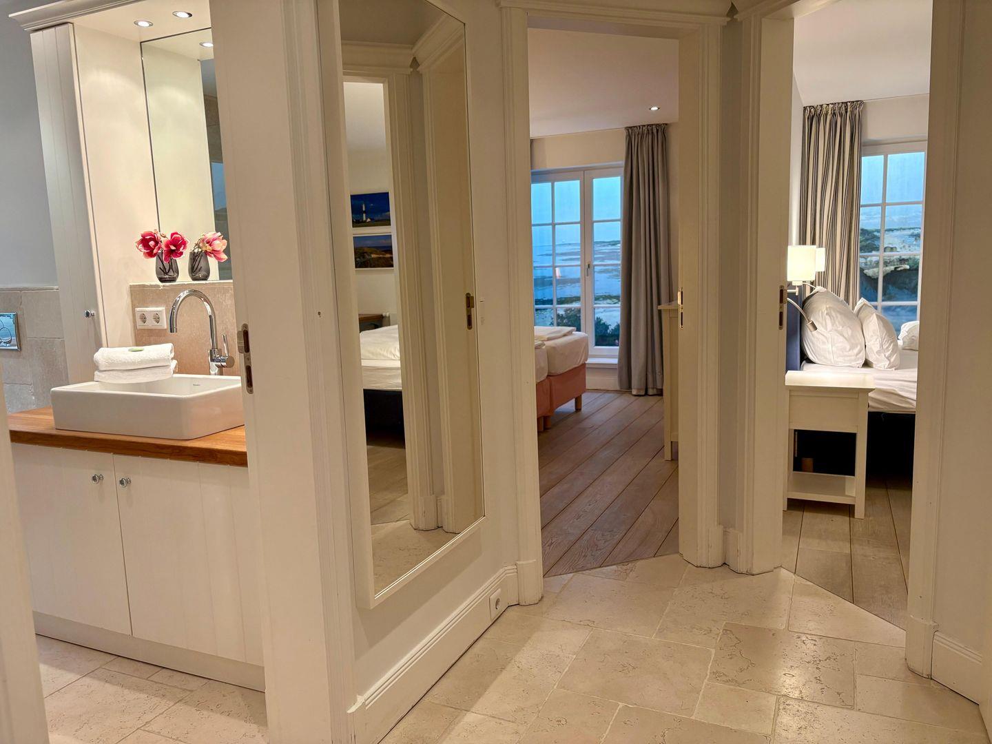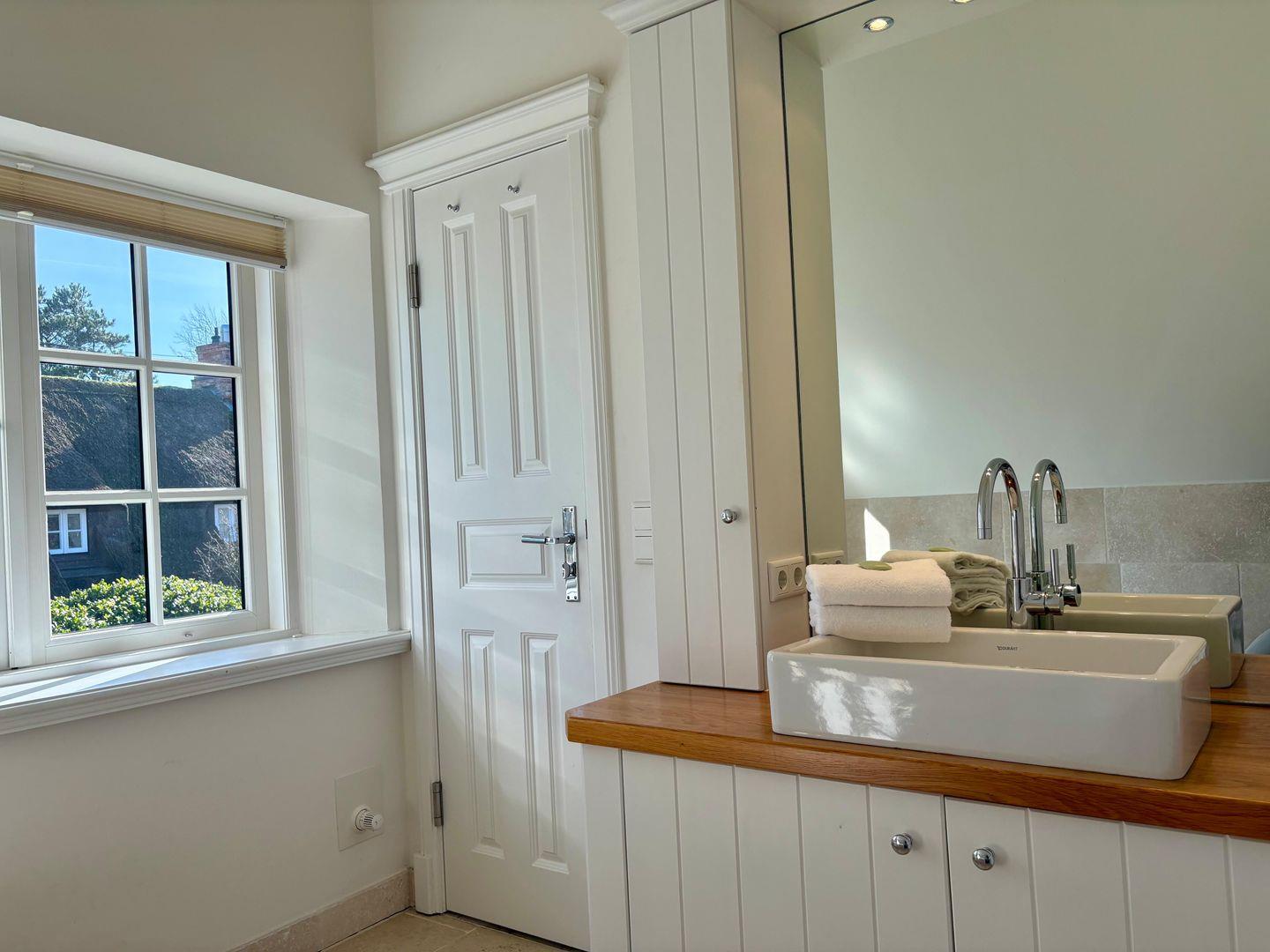 Auch das Untergeschoss überrascht mit Behaglichkeit: Zwei hübsche Doppelschlafzimmer, viel Stauraum in den Einbauschränken und ein geräumiges Duschbad bieten ausreichend Platz für Familie und Gäste. Das besondere Highlight ist die Dampfsauna – perfektes Syltfeeling und pure Entspannung, ganz unabhängig vom Wetter.