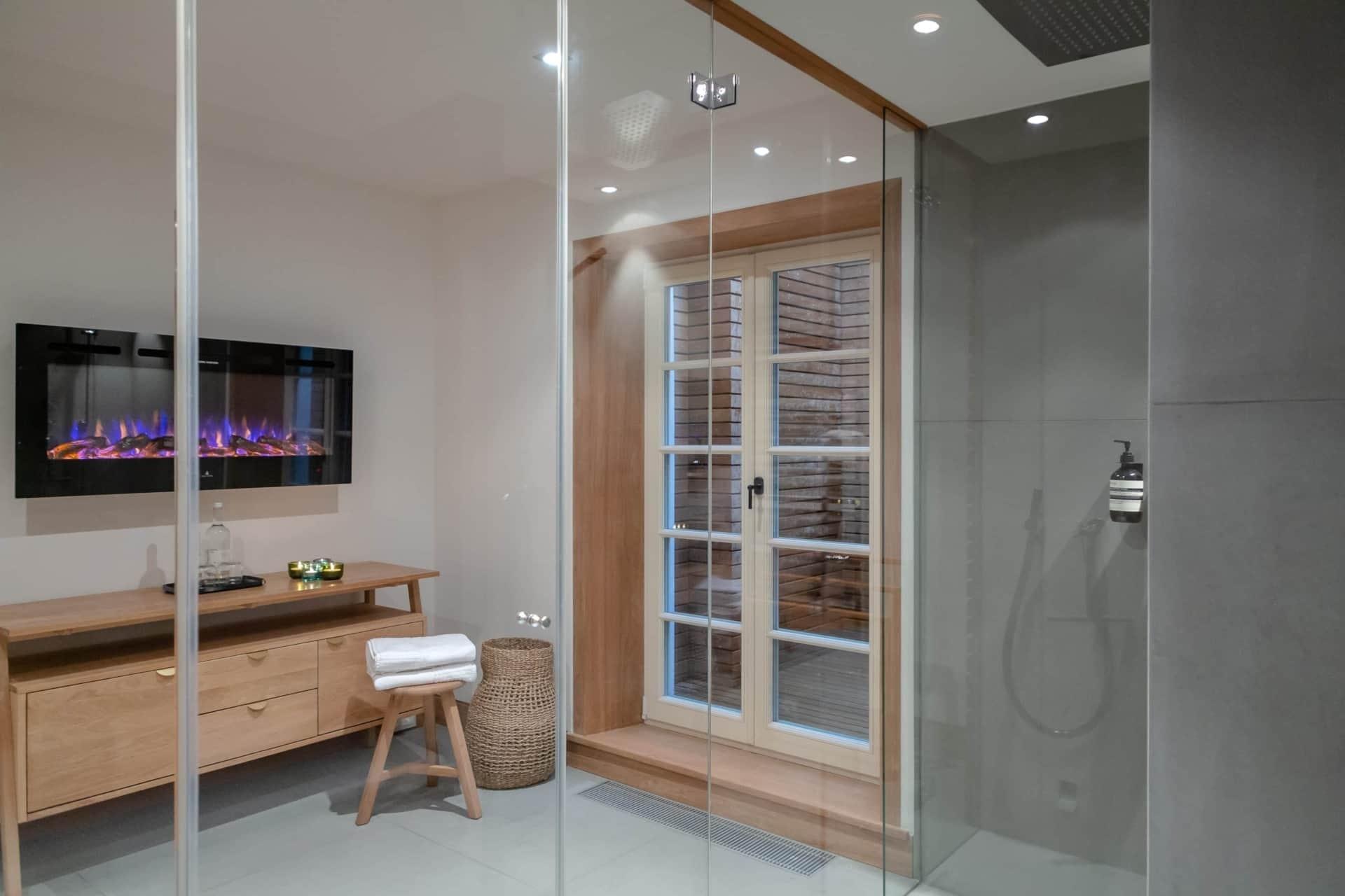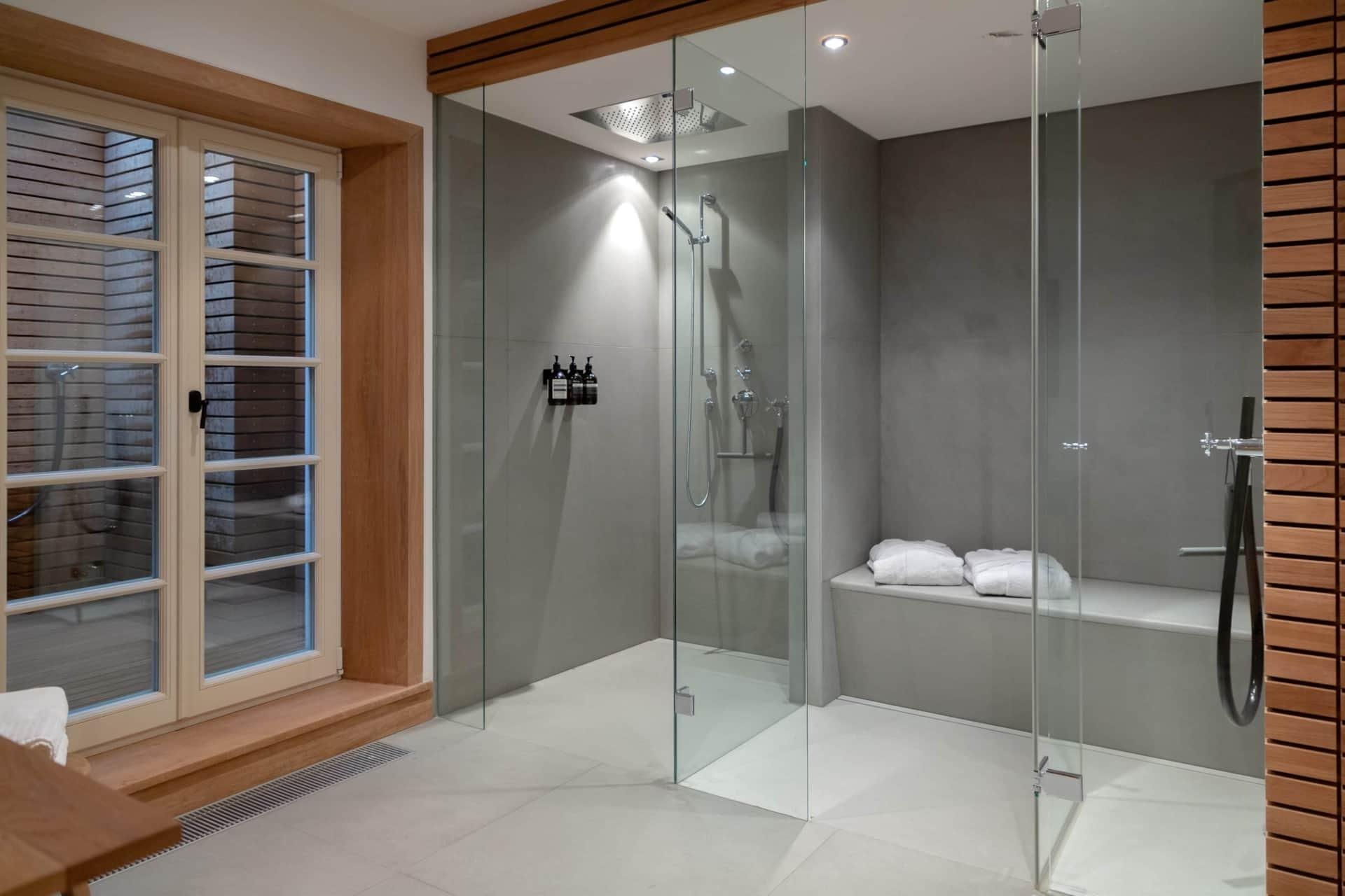 Für weitere Momente der Entspannung sorgt die kleine Wellnessoase im Untergeschoss mit Dampfsauna, Regendusche und einzigartiger Außendusche.