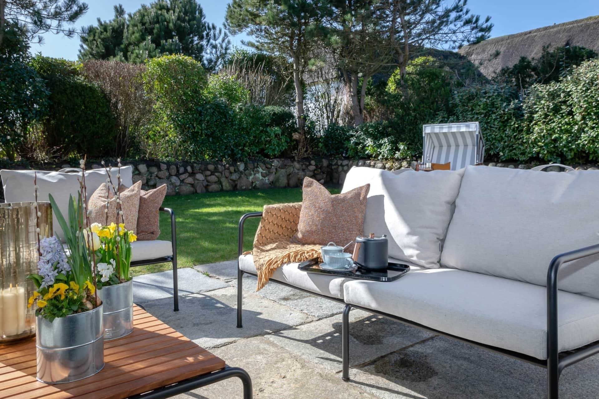 Der Garten ist ein Highlight des Ferienhauses Kampenherz. Er bietet viel Platz zum Spielen, entspannen oder einfach zum Verweilen. Die Terrasse lädt zu gemütlichen Abenden im Freien ein, während die gepflegte Grünfläche und die liebevoll angelegten Pflanzen eine Oase der Ruhe schaffen.